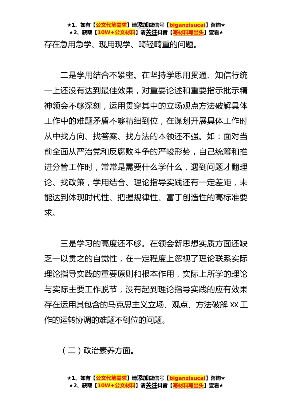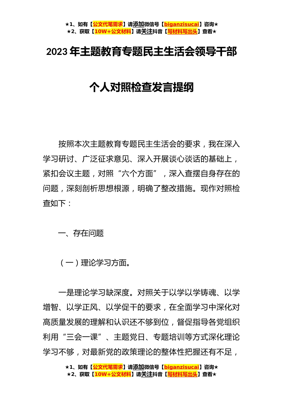 ★1、如有【公文代笔需求】请添加微信号【biganzisucai】咨询★★2、获取【10W+公文材料】请关注抖音【写材料写出头】查看★2023年主题教育专题民主生活会领导干部个人对照检查发言提纲按照本次主题教育专题民主生活会的要求,我在深入学习研讨、广泛征求意见、深入开展谈心谈话的基础上,紧扣会议主题,对照“六个方面”,深入查摆自身存在的问题,深刻剖析思想根源,明确了整改措施。现作对照检查如下:一、存在问题(一)理论学习方面。一是理论学习缺深度。对照关于以学以学铸魂、以学增智、以学正风、以学促干的要求,在全面学习中深化对高质量发展的理解和认识还不够到位,督促指导各党组织利用“三会一课”、主题党日、专题培训等方式深化理论学习不够,对最新党的政策理论的整体性把握还有不足,★1、如有...