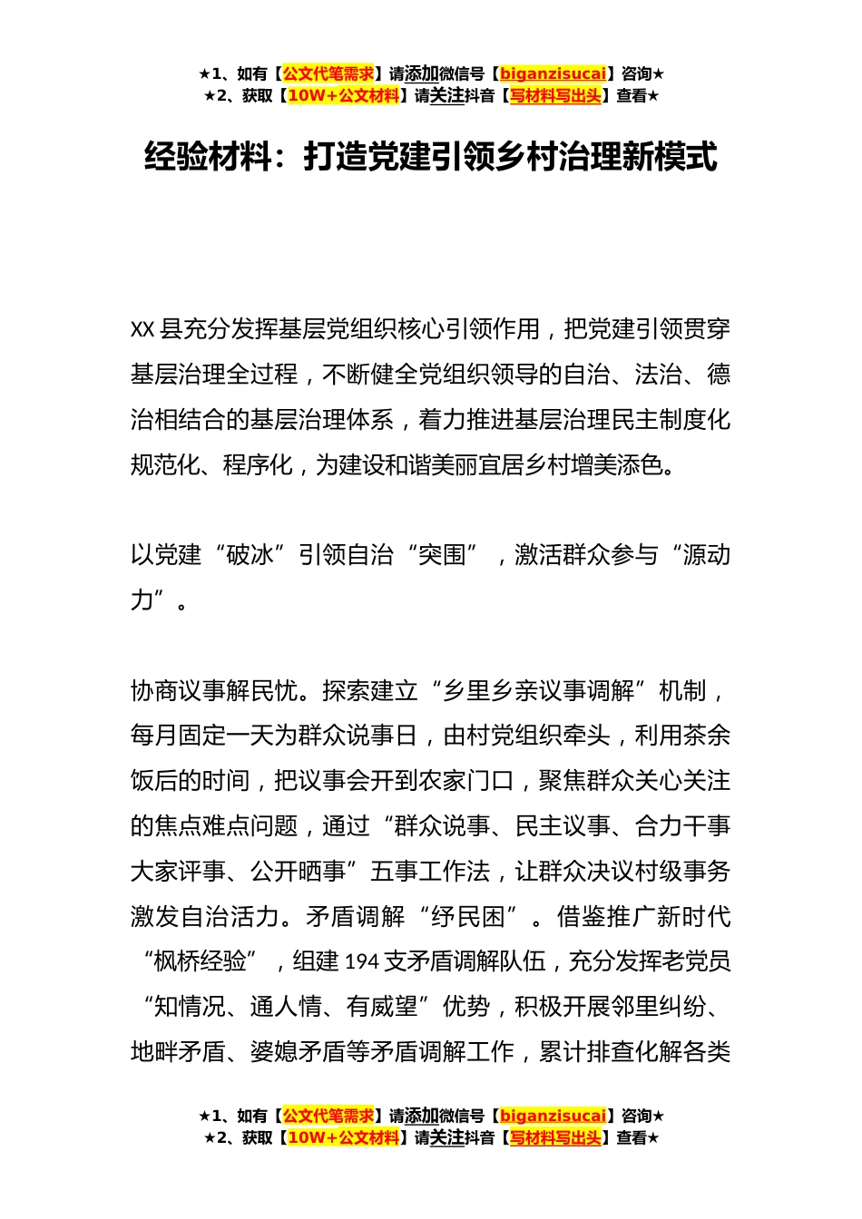 ★1、如有【公文代笔需求】请添加微信号【biganzisucai】咨询★★2、获取【10W+公文材料】请关注抖音【写材料写出头】查看★经验材料:打造党建引领乡村治理新模式XX县充分发挥基层党组织核心引领作用,把党建引领贯穿基层治理全过程,不断健全党组织领导的自治、法治、德治相结合的基层治理体系,着力推进基层治理民主制度化规范化、程序化,为建设和谐美丽宜居乡村增美添色。以党建“破冰”引领自治“突围”,激活群众参与“源动力”。协商议事解民忧。探索建立“乡里乡亲议事调解”机制,每月固定一天为群众说事日,由村党组织牵头,利用茶余饭后的时间,把议事会开到农家门口,聚焦群众关心关注的焦点难点问题,通过“群众说事、民主议事、合力干事大家评事、公开晒事”五事工作法,让群众决议村级事务激发自...