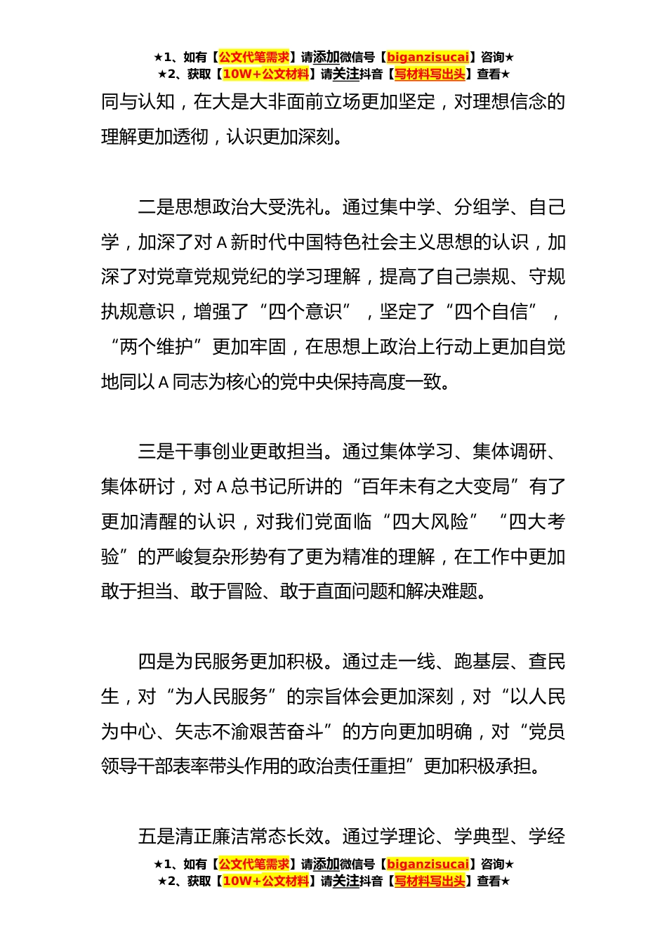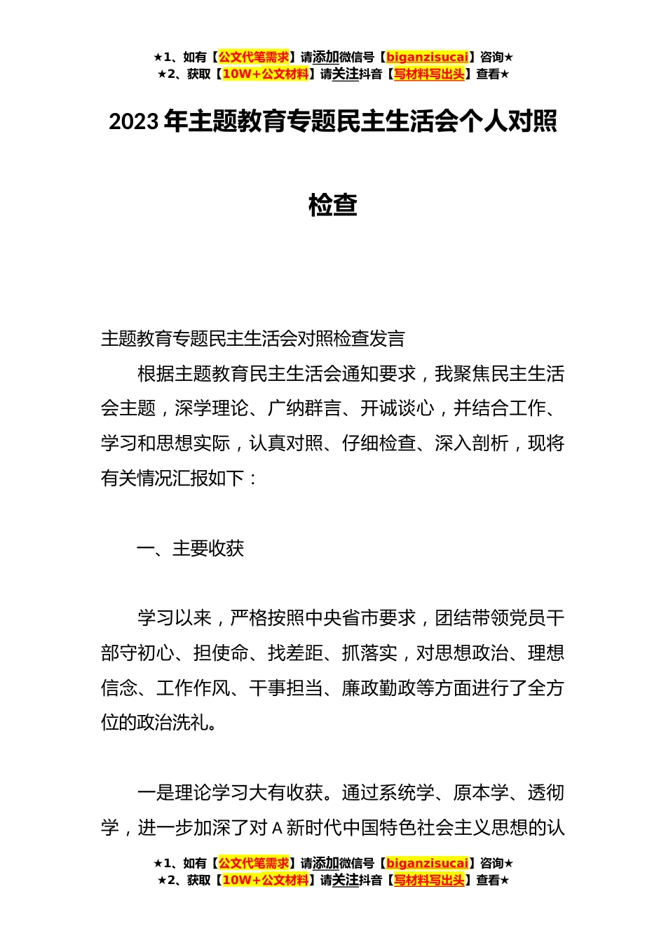 ★1、如有【公文代笔需求】请添加微信号【biganzisucai】咨询★★2、获取【10W+公文材料】请关注抖音【写材料写出头】查看★2023年主题教育专题民主生活会个人对照检查主题教育专题民主生活会对照检查发言根据主题教育民主生活会通知要求,我聚焦民主生活会主题,深学理论、广纳群言、开诚谈心,并结合工作、学习和思想实际,认真对照、仔细检查、深入剖析,现将有关情况汇报如下:一、主要收获学习以来,严格按照中央省市要求,团结带领党员干部守初心、担使命、找差距、抓落实,对思想政治、理想信念、工作作风、干事担当、廉政勤政等方面进行了全方位的政治洗礼。一是理论学习大有收获。通过系统学、原本学、透彻学,进一步加深了对A新时代中国特色社会主义思想的认★1、如有【公文代笔需求】请添加微信号【big...
