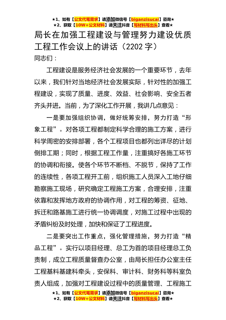 ★1、如有【公文代笔需求】请添加微信号【biganzisucai】咨询★★2、获取【10W+公文材料】请关注抖音【写材料写出头】查看★局长在加强工程建设与管理努力建设优质工程工作会议上的讲话(2202字)同志们:工程建设是服务经济社会发展的一个重要环节,去年以来,我们针对当地经济社会发展实际,针对性的加强工程建设,实现了质量、进度、效益、社会影响、安全五者齐头并进。当前,为了深化工作开展,我讲几点意见:一是要加强组织协调,做好统筹安排,努力打造“形象工程”。对各项工程都制定科学合理的施工方案,进行科学周密的安排部署,各个工程项目也都列出详尽的计划倒排工期;同时,根据工程工作量,注重搞好各施工环节的协调和衔接。使各个环节不断档、不脱节,保持了工作的连续性,各项工程开工前,组织施...