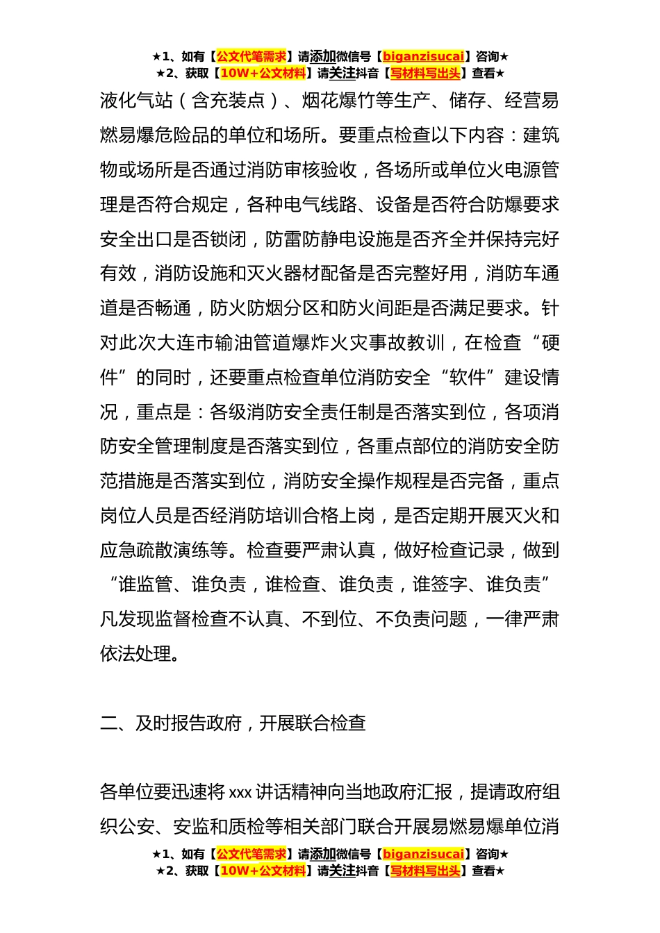 ★1、如有【公文代笔需求】请添加微信号【biganzisucai】咨询★★2、获取【10W+公文材料】请关注抖音【写材料写出头】查看★关于进一步深化易燃易爆单位安全治理工作的通知为深刻吸取xxx爆炸等事故经验教训,最大限度地消除火灾隐患、减少火灾危害,坚决预防和遏制重特大火灾特别是群死群伤火灾事故,确保全市火灾形势的高度稳定,秉承安全第一的理念,坚持严格控制,严格管理的方针,易燃易爆场所安全监管始终作为一项重要的安全工作来抓。xx局决定,继续深化易燃易爆场所消防安全治理工作,现就此项工作通知如下:一、结合总队易燃易爆场所专项治理行动,深化推进易燃易爆场所安全治理各单位要结合前一阶段总队开展的易燃易爆场所专项治理行动,对全市范围内各类易燃易爆单位,尤其是在前一阶段没有进行检查的单...