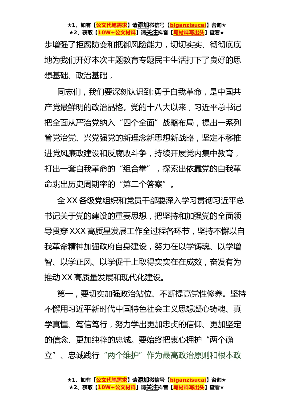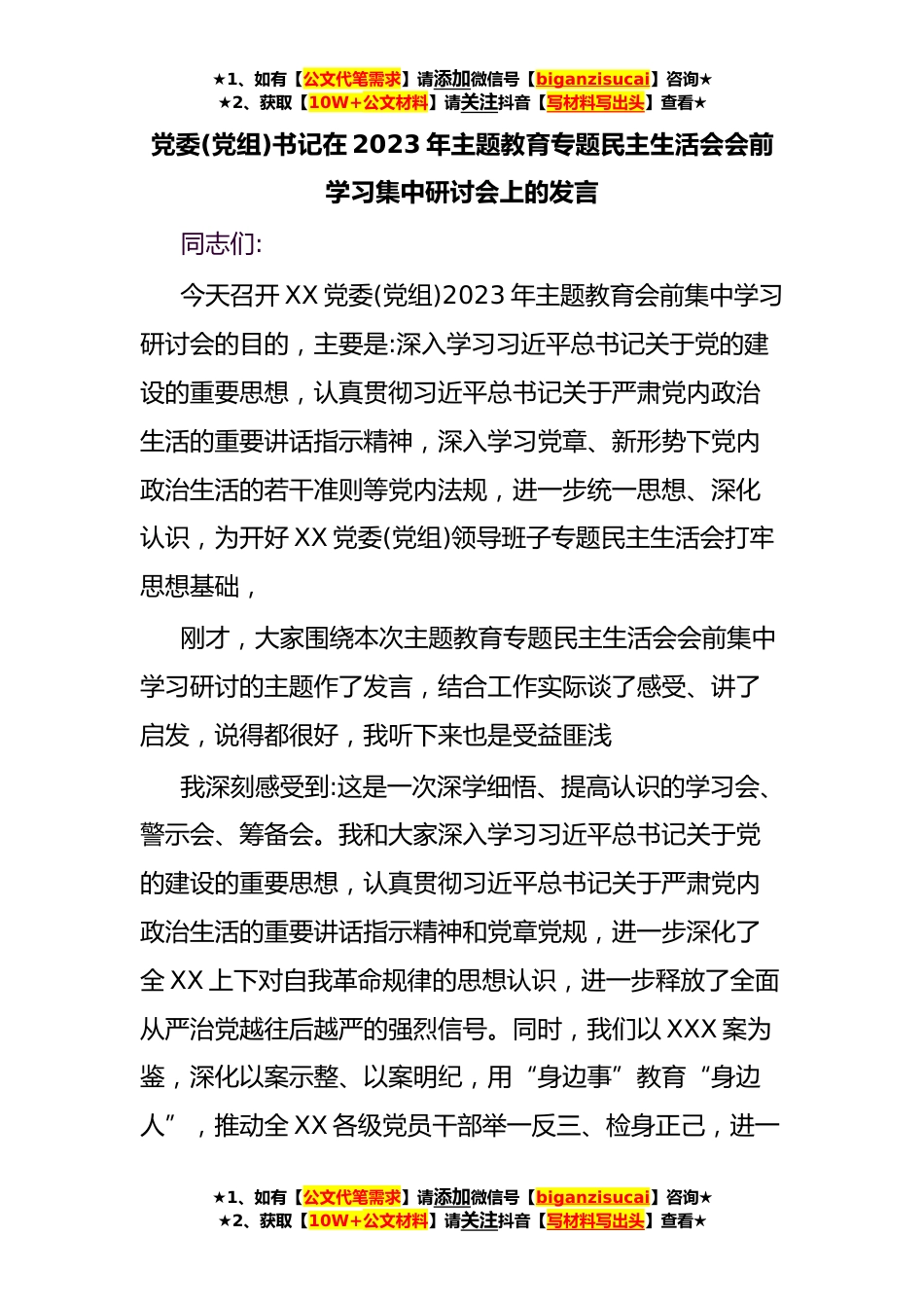 ★1、如有【公文代笔需求】请添加微信号【biganzisucai】咨询★★2、获取【10W+公文材料】请关注抖音【写材料写出头】查看★党委(党组)书记在2023年主题教育专题民主生活会会前学习集中研讨会上的发言同志们:今天召开XX党委(党组)2023年主题教育会前集中学习研讨会的目的,主要是:深入学习习近平总书记关于党的建设的重要思想,认真贯彻习近平总书记关于严肃党内政治生活的重要讲话指示精神,深入学习党章、新形势下党内政治生活的若干准则等党内法规,进一步统一思想、深化认识,为开好XX党委(党组)领导班子专题民主生活会打牢思想基础,刚才,大家围绕本次主题教育专题民主生活会会前集中学习研讨的主题作了发言,结合工作实际谈了感受、讲了启发,说得都很好,我听下来也是受益匪浅我深刻感受到:这是一次深学细...