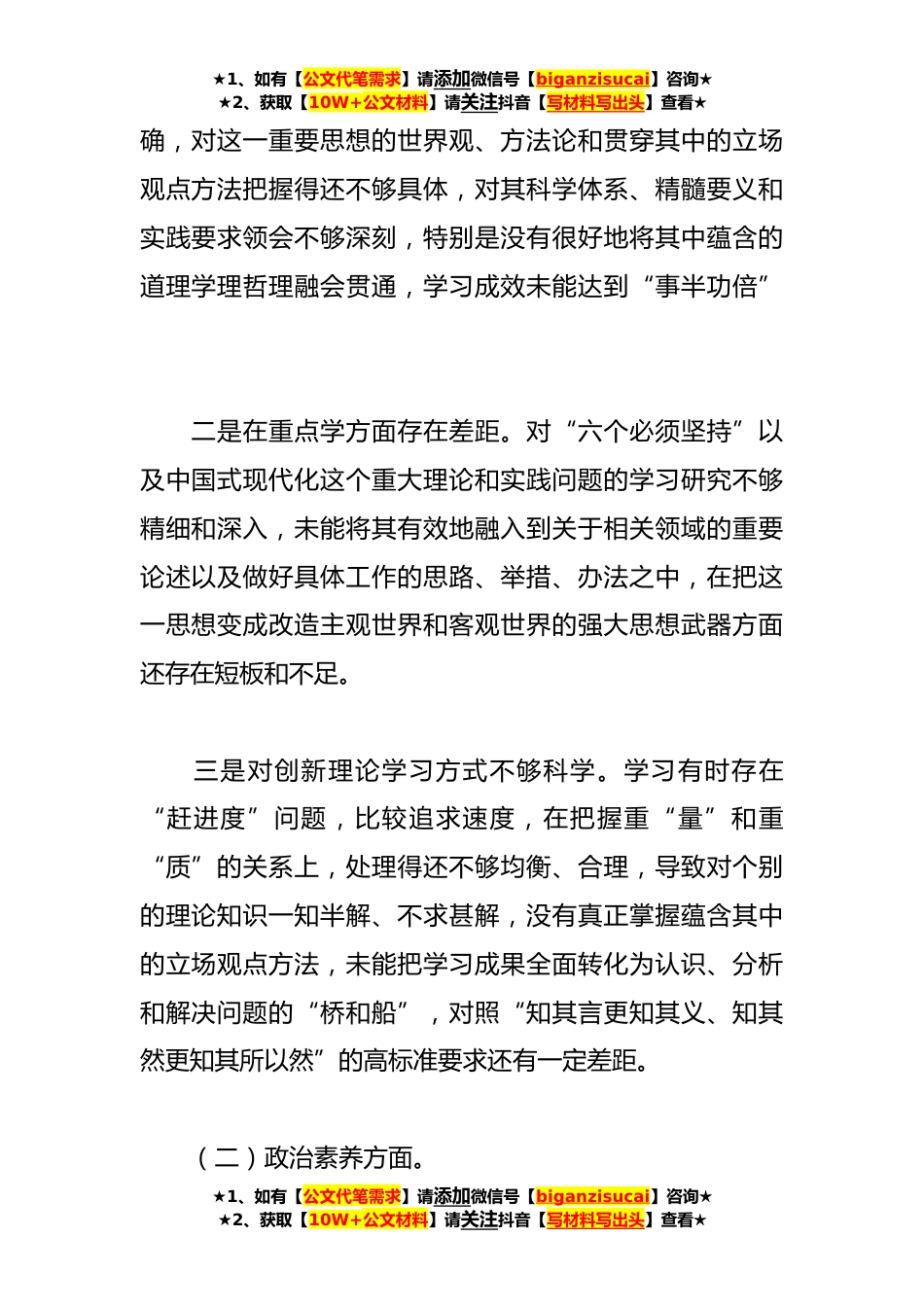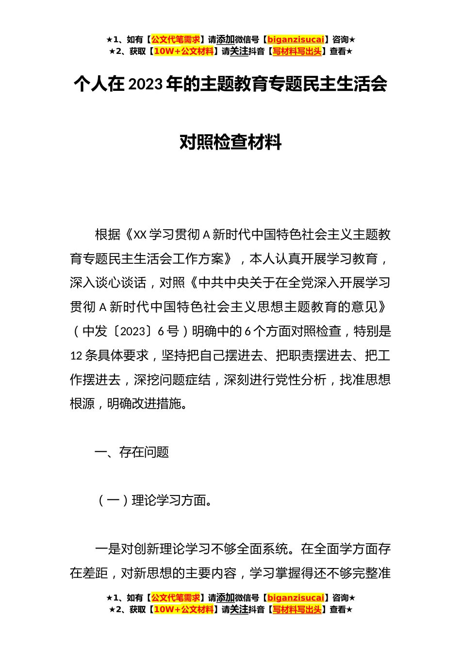 ★1、如有【公文代笔需求】请添加微信号【biganzisucai】咨询★★2、获取【10W+公文材料】请关注抖音【写材料写出头】查看★个人在2023年的主题教育专题民主生活会对照检查材料根据《XX学习贯彻A新时代中国特色社会主义主题教育专题民主生活会工作方案》,本人认真开展学习教育,深入谈心谈话,对照《中共中央关于在全党深入开展学习贯彻A新时代中国特色社会主义思想主题教育的意见》(中发〔2023〕6号)明确中的6个方面对照检查,特别是12条具体要求,坚持把自己摆进去、把职责摆进去、把工作摆进去,深挖问题症结,深刻进行党性分析,找准思想根源,明确改进措施。一、存在问题(一)理论学习方面。一是对创新理论学习不够全面系统。在全面学方面存在差距,对新思想的主要内容,学习掌握得还不够完整准★1、如有...