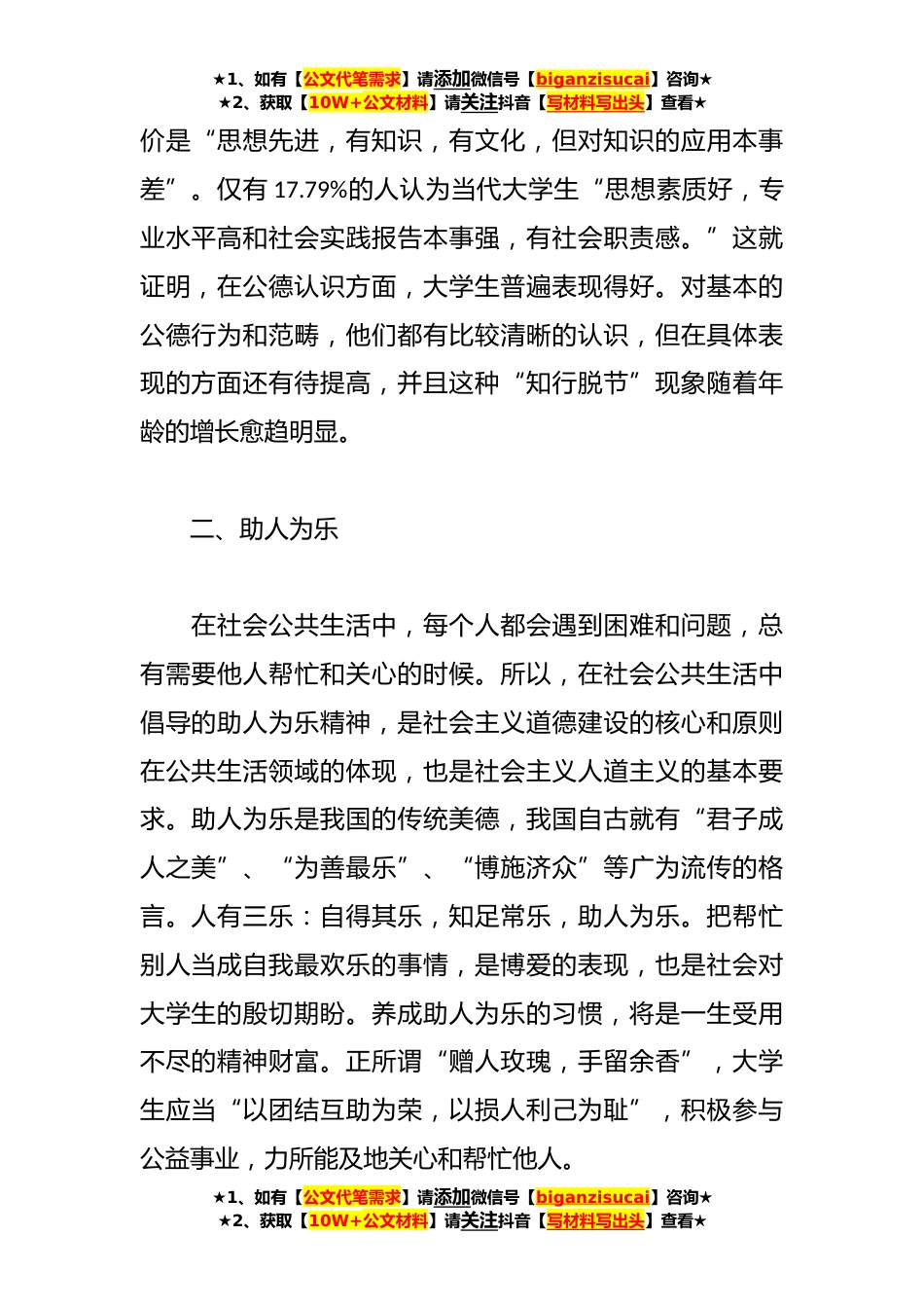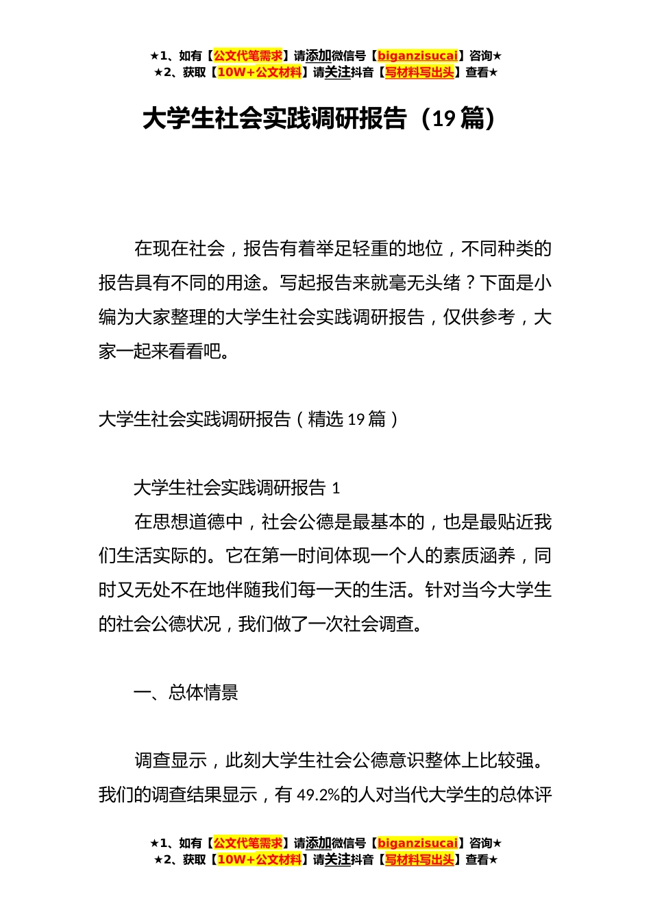 ★1、如有【公文代笔需求】请添加微信号【biganzisucai】咨询★★2、获取【10W+公文材料】请关注抖音【写材料写出头】查看★大学生社会实践调研报告(19篇)在现在社会,报告有着举足轻重的地位,不同种类的报告具有不同的用途。写起报告来就毫无头绪?下面是小编为大家整理的大学生社会实践调研报告,仅供参考,大家一起来看看吧。大学生社会实践调研报告(精选19篇)大学生社会实践调研报告1在思想道德中,社会公德是最基本的,也是最贴近我们生活实际的。它在第一时间体现一个人的素质涵养,同时又无处不在地伴随我们每一天的生活。针对当今大学生的社会公德状况,我们做了一次社会调查。一、总体情景调查显示,此刻大学生社会公德意识整体上比较强。我们的调查结果显示,有49.2%的人对当代大学生的总体评★1、...