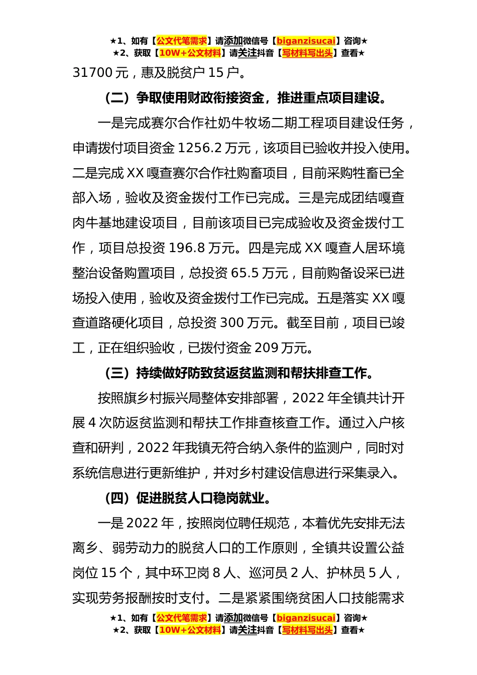 ★1、如有【公文代笔需求】请添加微信号【biganzisucai】咨询★★2、获取【10W+公文材料】请关注抖音【写材料写出头】查看★镇关于乡村振兴调研报告XX镇现有贫困出列嘎查2个,示范嘎查1个,非贫困嘎查1个。根据2022年防返贫动态监测帮扶第二轮排查结果,目前,我镇脱贫户共计65户、148人。2022年,我镇脱贫户人均纯收入18343元,同比增长13.7%。XX镇党委、政府在认真贯彻落实中央、自治区、市、旗政府工作部署的同时,积极做好巩固拓展脱贫攻坚成果同乡村振兴有效衔接的各项工作,措施扎实,重点突出,成效明显。一、工作实效(一)落实产业振兴扶持政策,按照“一村一品”工作思路,扎实推动嘎查产业振兴,壮大集体经济。加快推进XX嘎查赛尔合作社二期续建项目、赛尔合作社购畜项目、团结嘎查肉牛基地建设项目,...