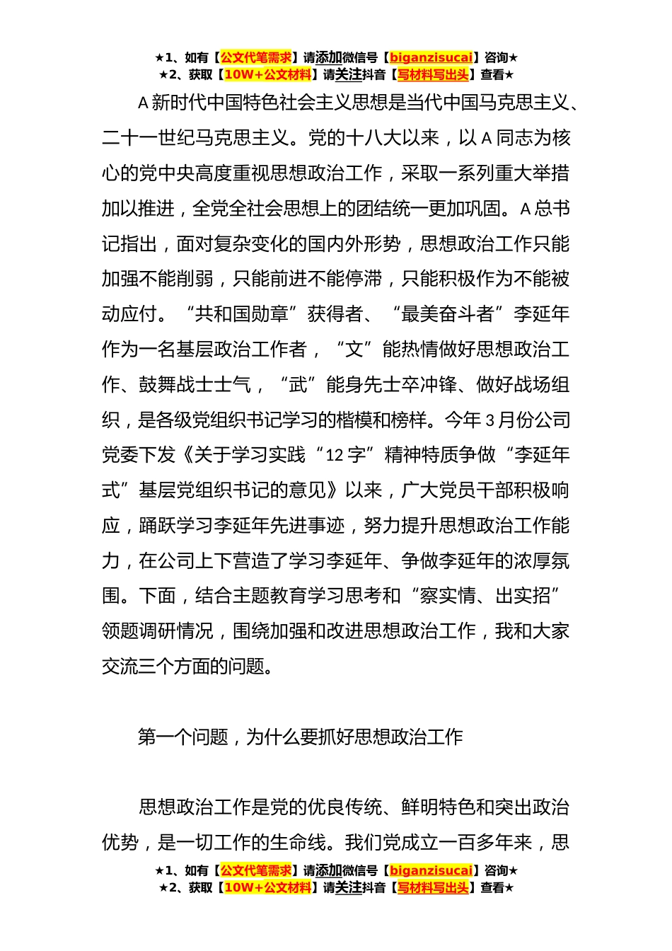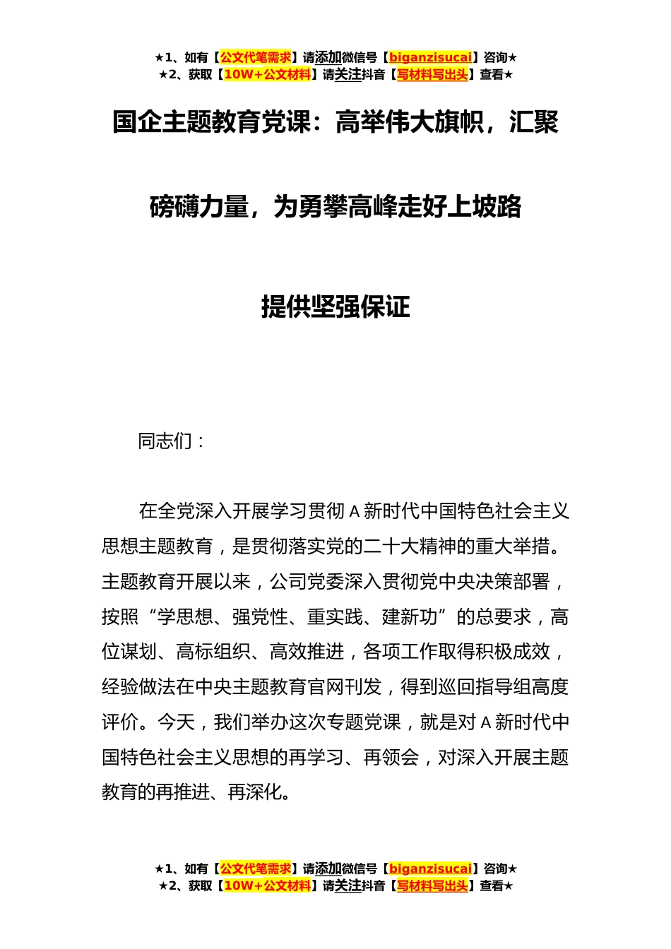 ★1、如有【公文代笔需求】请添加微信号【biganzisucai】咨询★★2、获取【10W+公文材料】请关注抖音【写材料写出头】查看★国企主题教育党课:高举伟大旗帜,汇聚磅礴力量,为勇攀高峰走好上坡路提供坚强保证同志们:在全党深入开展学习贯彻A新时代中国特色社会主义思想主题教育,是贯彻落实党的二十大精神的重大举措。主题教育开展以来,公司党委深入贯彻党中央决策部署,按照“学思想、强党性、重实践、建新功”的总要求,高位谋划、高标组织、高效推进,各项工作取得积极成效,经验做法在中央主题教育官网刊发,得到巡回指导组高度评价。今天,我们举办这次专题党课,就是对A新时代中国特色社会主义思想的再学习、再领会,对深入开展主题教育的再推进、再深化。★1、如有【公文代笔需求】请添加微信号【biganz...