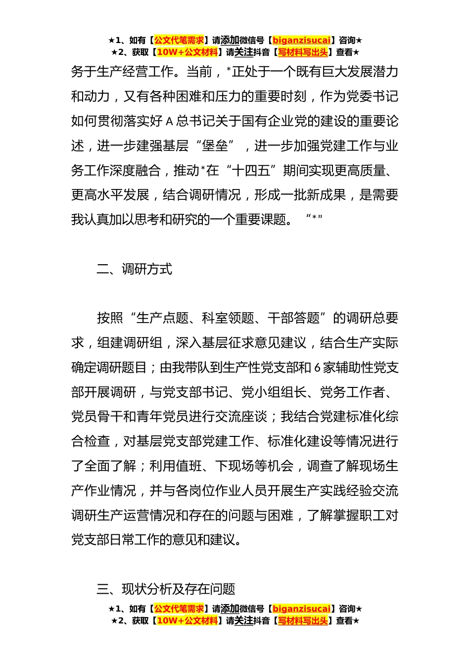 ★1、如有【公文代笔需求】请添加微信号【biganzisucai】咨询★★2、获取【10W+公文材料】请关注抖音【写材料写出头】查看★调研汇报:全面提升基层党建工作水平以高质量党建引领高质量发展A总书记指出,坚持服务生产经营不偏离,把提高企业效益、增强企业竞争实力、实现国有资产保值增值作为国有企业党组织工作的出发点和落脚点,以企业改革发展成果检验党组织的工作和战斗力。实践证明,坚持围绕中心服务大局,推动党建工作深度嵌入生产经营各环节,基层党建工作才能够有作为、有价值、有意义。按照主题教育统一安排部署,我围绕党建工作进行了深入细致的调研,现将具体情况汇报如下。一、调研目的近年来,*党委紧扣集团公司党委“*”战略部署总体要求,坚持服务生产经营不偏离,把推动生产经营中心工作作为党建...