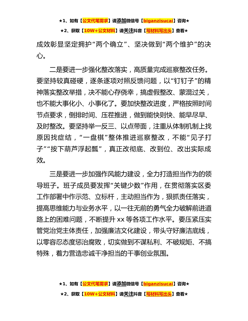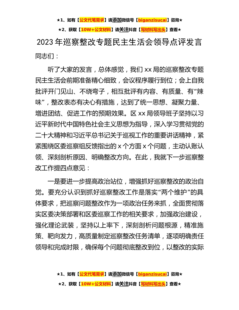 ★1、如有【公文代笔需求】请添加微信号【biganzisucai】咨询★★2、获取【10W+公文材料】请关注抖音【写材料写出头】查看★2023年巡察整改专题民主生活会领导点评发言同志们:听了大家的发言,总体感觉,我们xx局的巡察整改专题民主生活会前期准备精心细致,会议程序履行到位;会上自我“批评开门见山、不绕弯子,相互批评有内容、有质量、有辣”味,整改表态有决心有措施,达到了统一思想、凝聚力量、增进团结、促进工作的预期效果。区xx局领导班子坚持以习近平新时代中国特色社会主义思想为指导,深入学习贯彻党的二十大精神和习近平总书记关于巡视工作的重要讲话精神,紧紧围绕区委巡察组反馈指出的x个方面x个问题,主动认账认领、深刻剖析原因、明确整改方向。在此,我就下一步巡察整改工作提四点意见:一是...