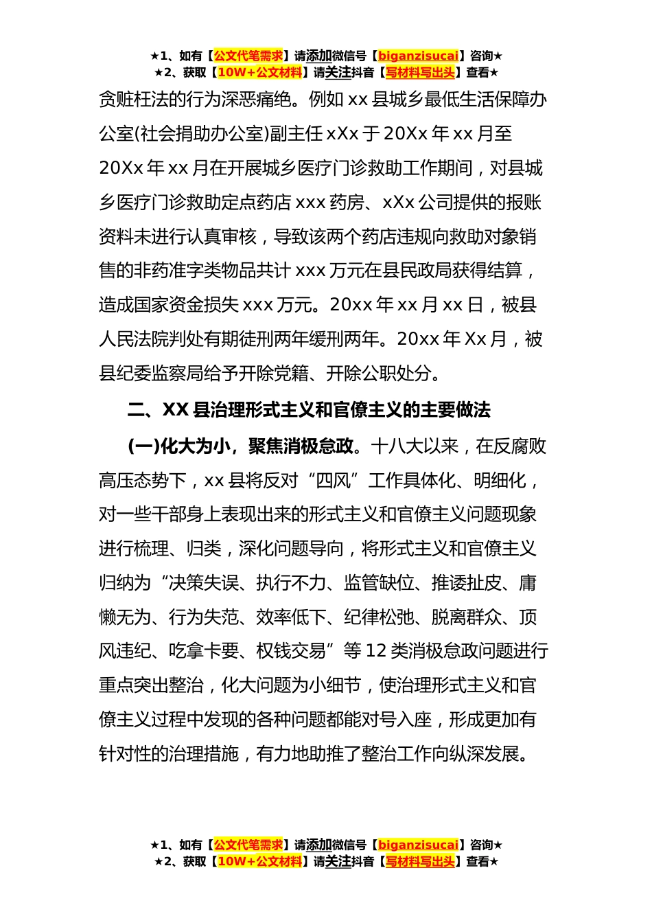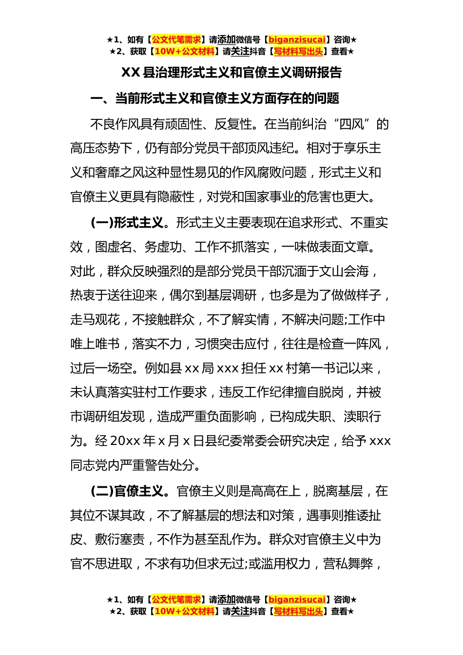 ★1、如有【公文代笔需求】请添加微信号【biganzisucai】咨询★★2、获取【10W+公文材料】请关注抖音【写材料写出头】查看★XX县治理形式主义和官僚主义调研报告一、当前形式主义和官僚主义方面存在的问题不良作风具有顽固性、反复性。在当前纠治“四风”的高压态势下,仍有部分党员干部顶风违纪。相对于享乐主义和奢靡之风这种显性易见的作风腐败问题,形式主义和官僚主义更具有隐蔽性,对党和国家事业的危害也更大。(一)形式主义。形式主义主要表现在追求形式、不重实效,图虚名、务虚功、工作不抓落实,一味做表面文章。对此,群众反映强烈的是部分党员干部沉湎于文山会海,热衷于送往迎来,偶尔到基层调研,也多是为了做做样子,走马观花,不接触群众,不了解实情,不解决问题;工作中唯上唯书,落实不力,习惯...