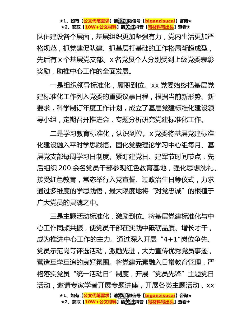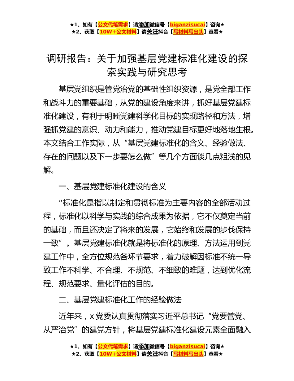 ★1、如有【公文代笔需求】请添加微信号【biganzisucai】咨询★★2、获取【10W+公文材料】请关注抖音【写材料写出头】查看★调研报告:关于加强基层党建标准化建设的探索实践与研究思考基层党组织是管党治党的基础性组织资源,是党全部工作和战斗力的重要基础,从党的建设角度来讲,抓好基层党建标准化建设,有利于明晰党建科学化目标的实现路径和方法,增强抓党建的意识、动力和能力,推动党建目标更好地落地生根。本文结合工作实际,从“基层党建标准化的含义、经验做法、存在的问题以及下一步要怎么做”等几个方面谈几点粗浅的见解。一、基层党建标准化建设的含义“标准化是指以制定和贯彻标准为主要内容的全部活动过程,标准化以科学与实践的综合成果为依据,它不仅奠定当前的基础,而且还决定了将来的发展,...