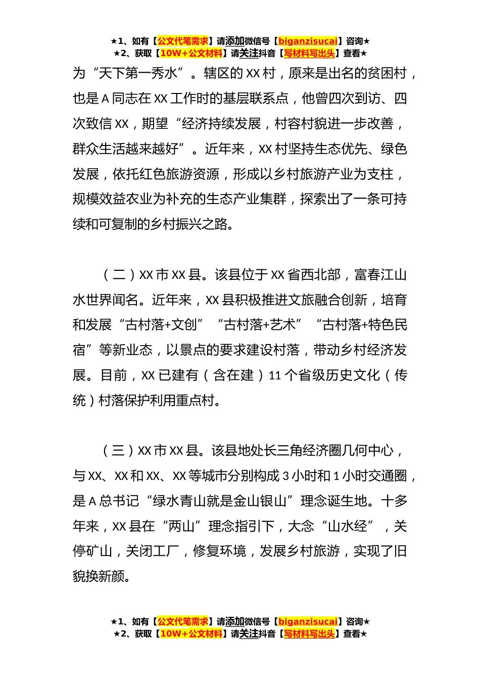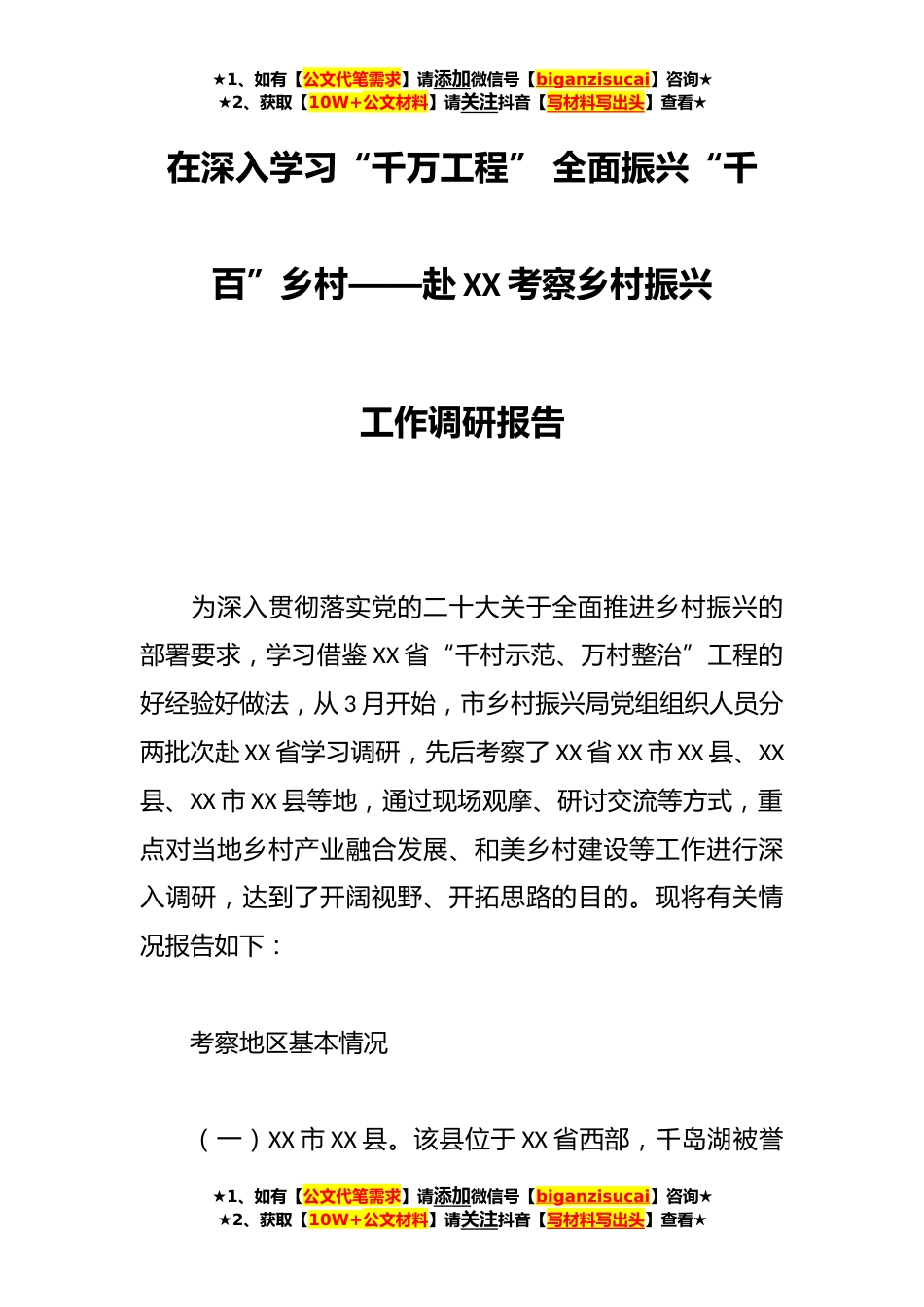 ★1、如有【公文代笔需求】请添加微信号【biganzisucai】咨询★★2、获取【10W+公文材料】请关注抖音【写材料写出头】查看★在深入学习“千万工程”全面振兴“千百”乡村——赴XX考察乡村振兴工作调研报告为深入贯彻落实党的二十大关于全面推进乡村振兴的部署要求,学习借鉴XX省“千村示范、万村整治”工程的好经验好做法,从3月开始,市乡村振兴局党组组织人员分两批次赴XX省学习调研,先后考察了XX省XX市XX县、XX县、XX市XX县等地,通过现场观摩、研讨交流等方式,重点对当地乡村产业融合发展、和美乡村建设等工作进行深入调研,达到了开阔视野、开拓思路的目的。现将有关情况报告如下:考察地区基本情况(一)XX市XX县。该县位于XX省西部,千岛湖被誉★1、如有【公文代笔需求】请添加微信号【biganzisucai】咨...