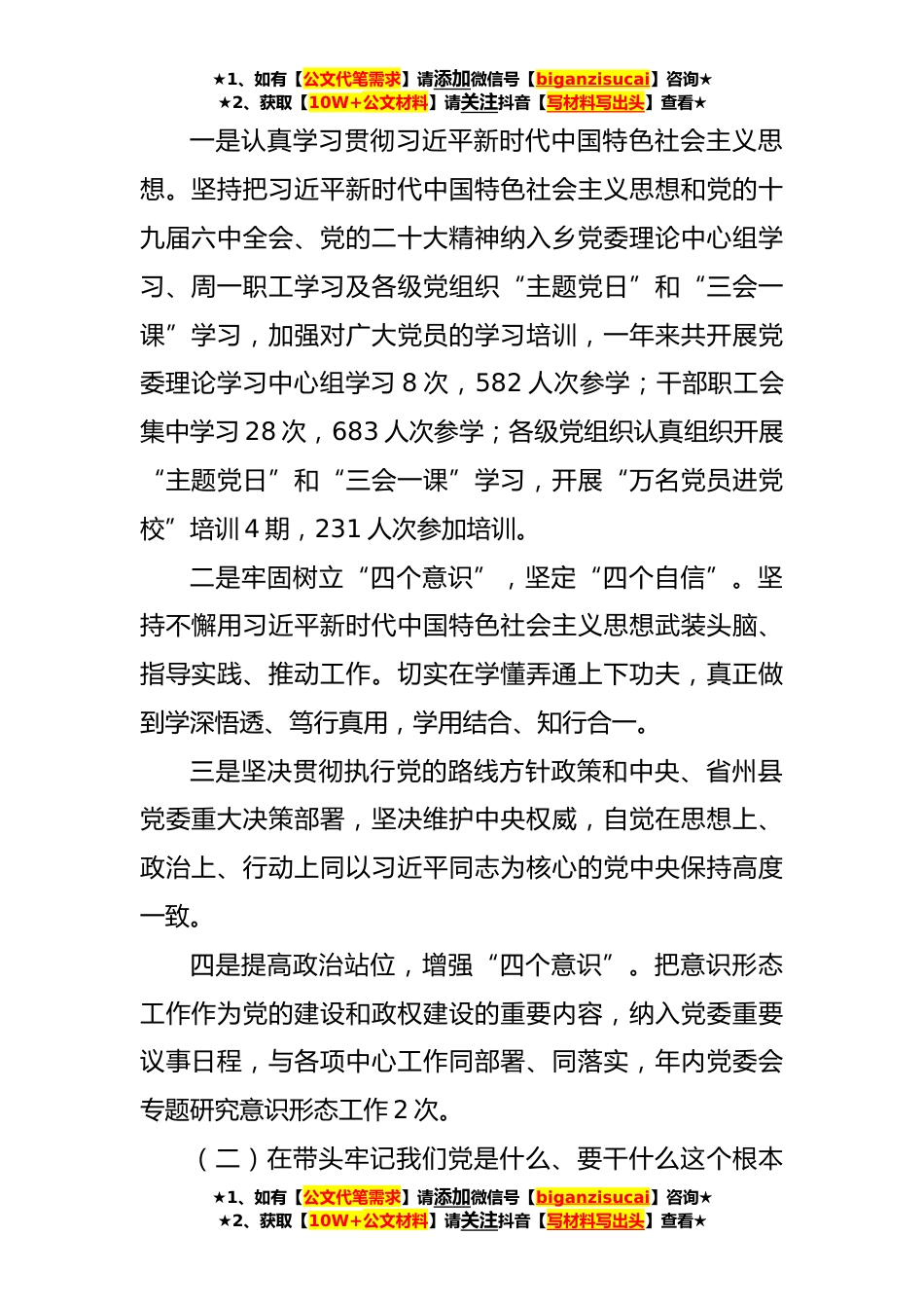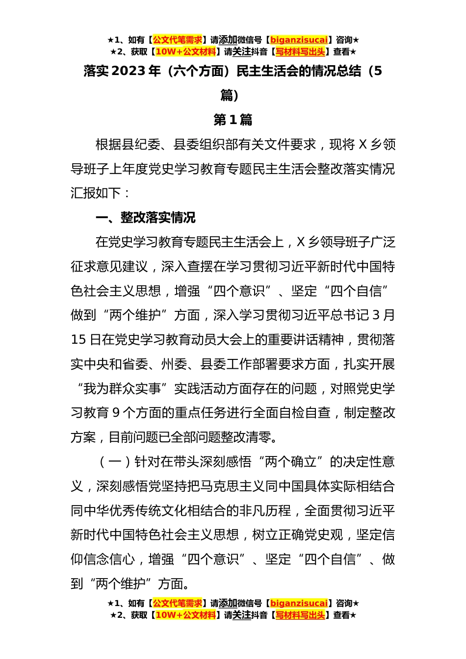 ★1、如有【公文代笔需求】请添加微信号【biganzisucai】咨询★★2、获取【10W+公文材料】请关注抖音【写材料写出头】查看★落实2023年(六个方面)民主生活会的情况总结(5篇)第1篇根据县纪委、县委组织部有关文件要求,现将X乡领导班子上年度党史学习教育专题民主生活会整改落实情况汇报如下:一、整改落实情况在党史学习教育专题民主生活会上,X乡领导班子广泛征求意见建议,深入查摆在学习贯彻习近平新时代中国特色社会主义思想,增强“四个意识”、坚定“四个自信”做到“两个维护”方面,深入学习贯彻习近平总书记3月15日在党史学习教育动员大会上的重要讲话精神,贯彻落实中央和省委、州委、县委工作部署要求方面,扎实开展“我为群众实事”实践活动方面存在的问题,对照党史学习教育9个方面的重点任务进...