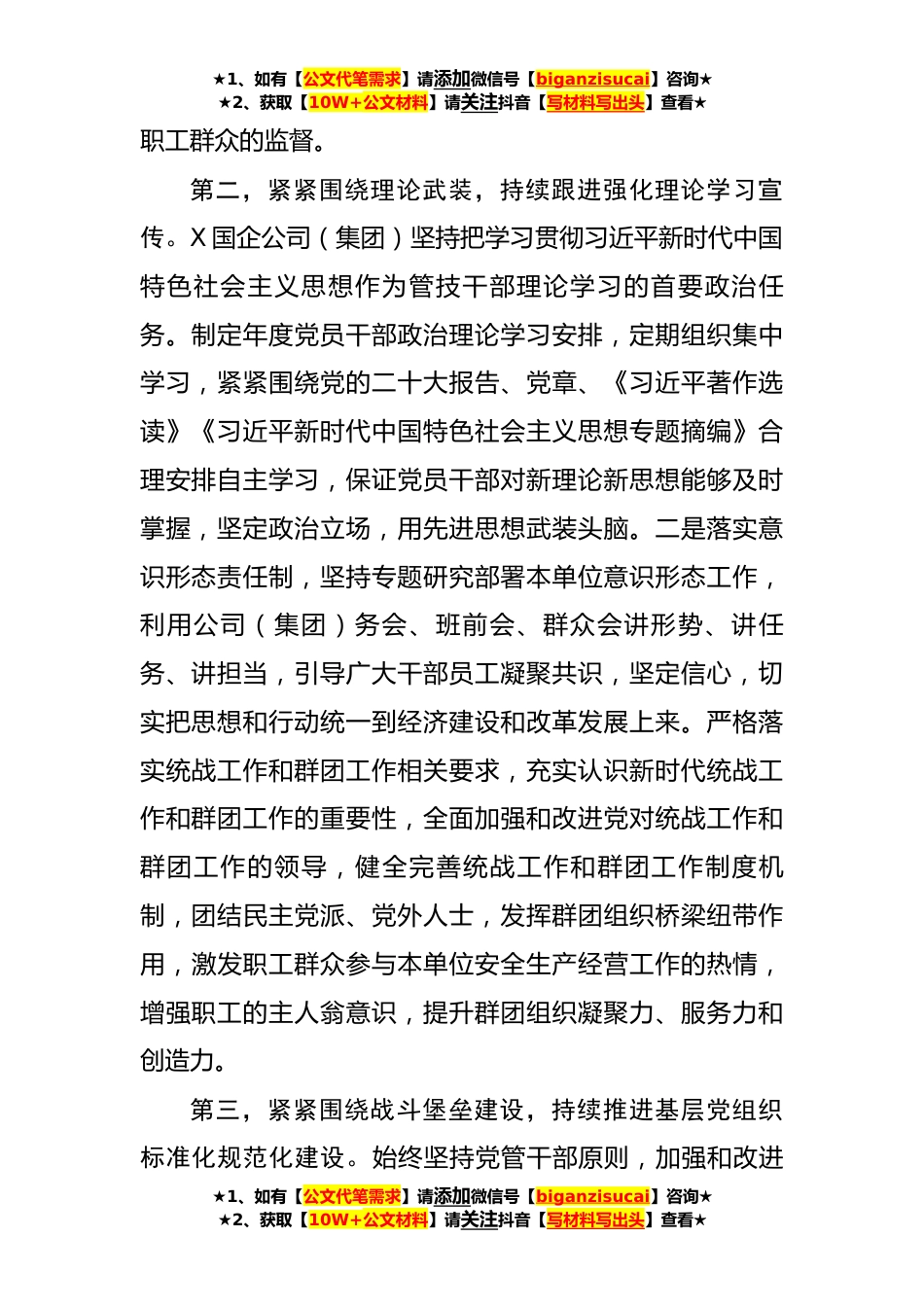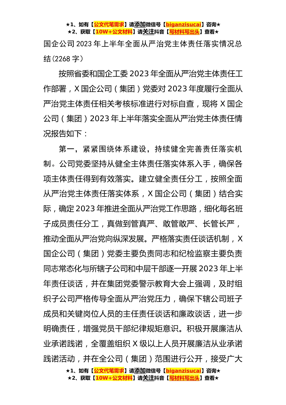 ★1、如有【公文代笔需求】请添加微信号【biganzisucai】咨询★★2、获取【10W+公文材料】请关注抖音【写材料写出头】查看★国企公司2023年上半年全面从严治党主体责任落实情况总结(2268字)按照省委和国企工委2023年全面从严治党主体责任工作部署,X国企公司(集团)党委对2023年度履行全面从严治党主体责任相关考核标准进行对标自查,现将X国企公司(集团)2023年上半年落实全面从严治党主体责任情况报告如下:第一,紧紧围绕体系建设,持续健全完善责任落实机制。公司党委坚持从健全主体责任落实体系入手,确保各项主体责任得到有效落实。建立健全责任分工,按照全面从严治党主体责任落实体系,X国企公司(集团)结合实际,确定2023年推进全面从严治党工作思路,细化每名班子成员责任分工,真做到管真严、敢管...