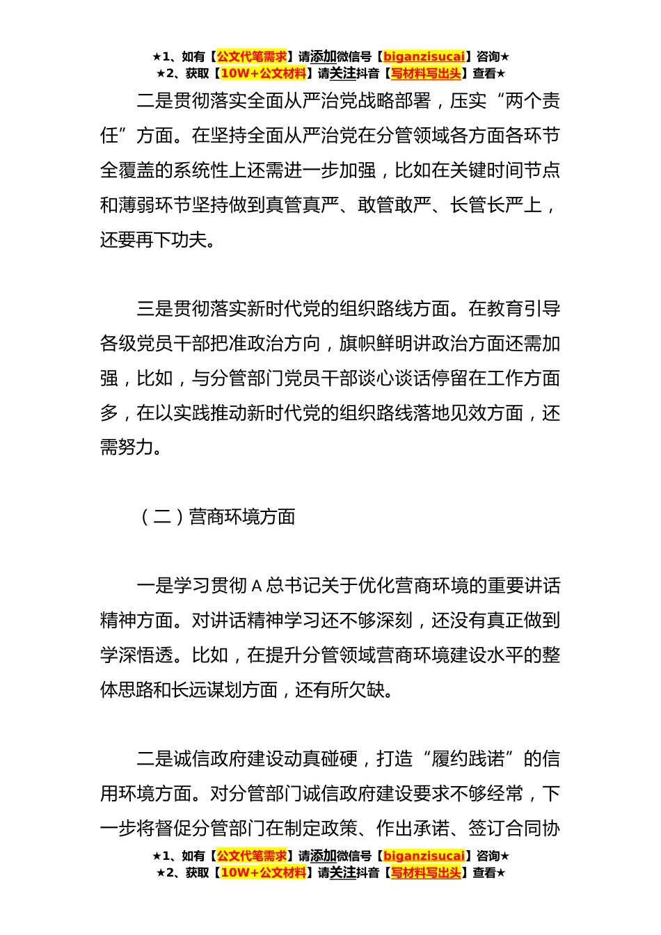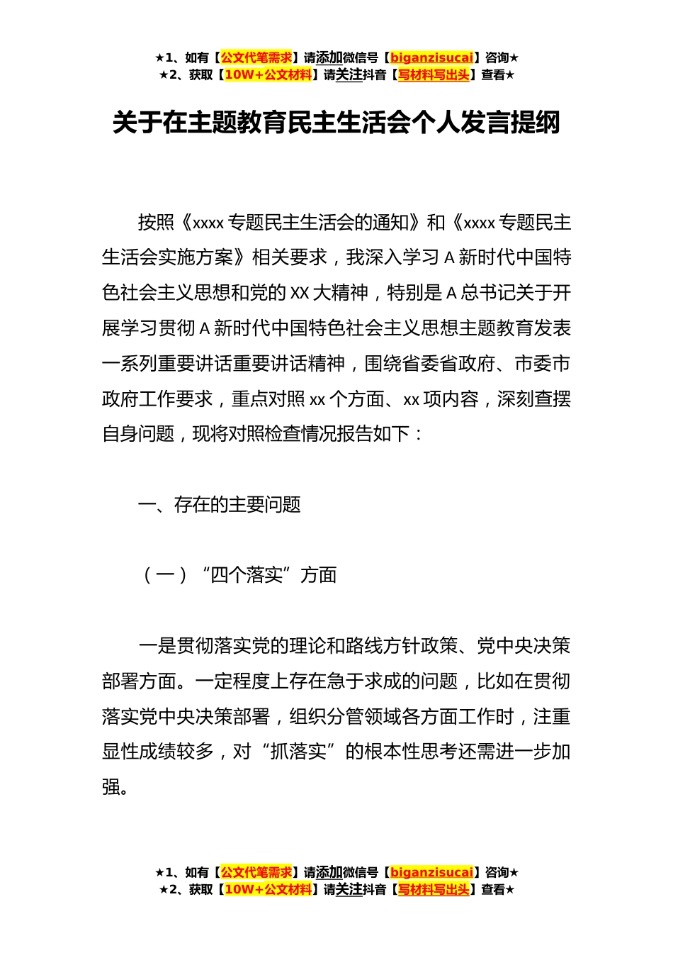 ★1、如有【公文代笔需求】请添加微信号【biganzisucai】咨询★★2、获取【10W+公文材料】请关注抖音【写材料写出头】查看★关于在主题教育民主生活会个人发言提纲按照《xxxx专题民主生活会的通知》和《xxxx专题民主生活会实施方案》相关要求,我深入学习A新时代中国特色社会主义思想和党的XX大精神,特别是A总书记关于开展学习贯彻A新时代中国特色社会主义思想主题教育发表一系列重要讲话重要讲话精神,围绕省委省政府、市委市政府工作要求,重点对照xx个方面、xx项内容,深刻查摆自身问题,现将对照检查情况报告如下:一、存在的主要问题(一)“四个落实”方面一是贯彻落实党的理论和路线方针政策、党中央决策部署方面。一定程度上存在急于求成的问题,比如在贯彻落实党中央决策部署,组织分管领域各方面工作时...
