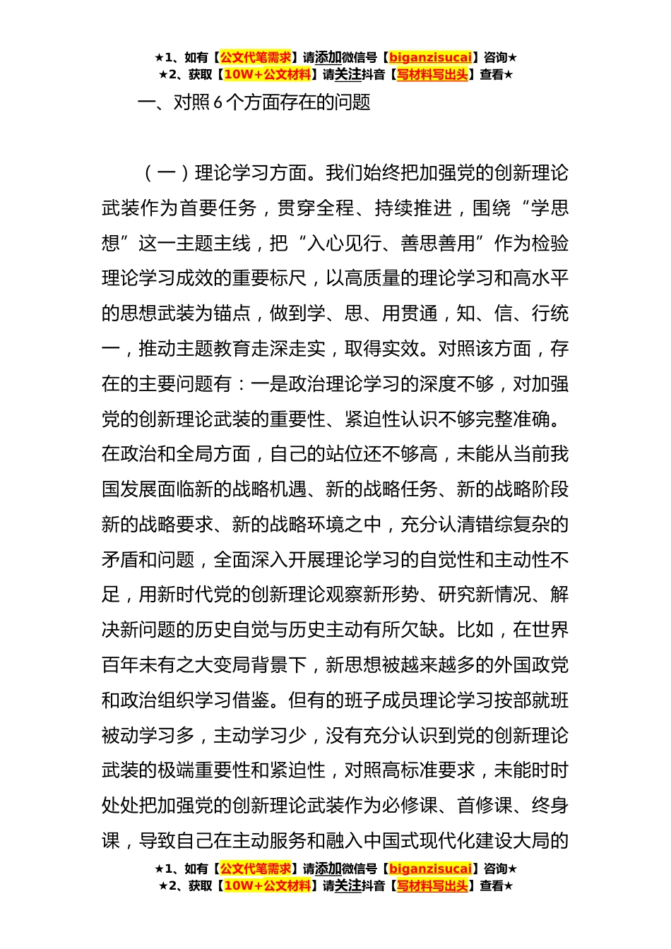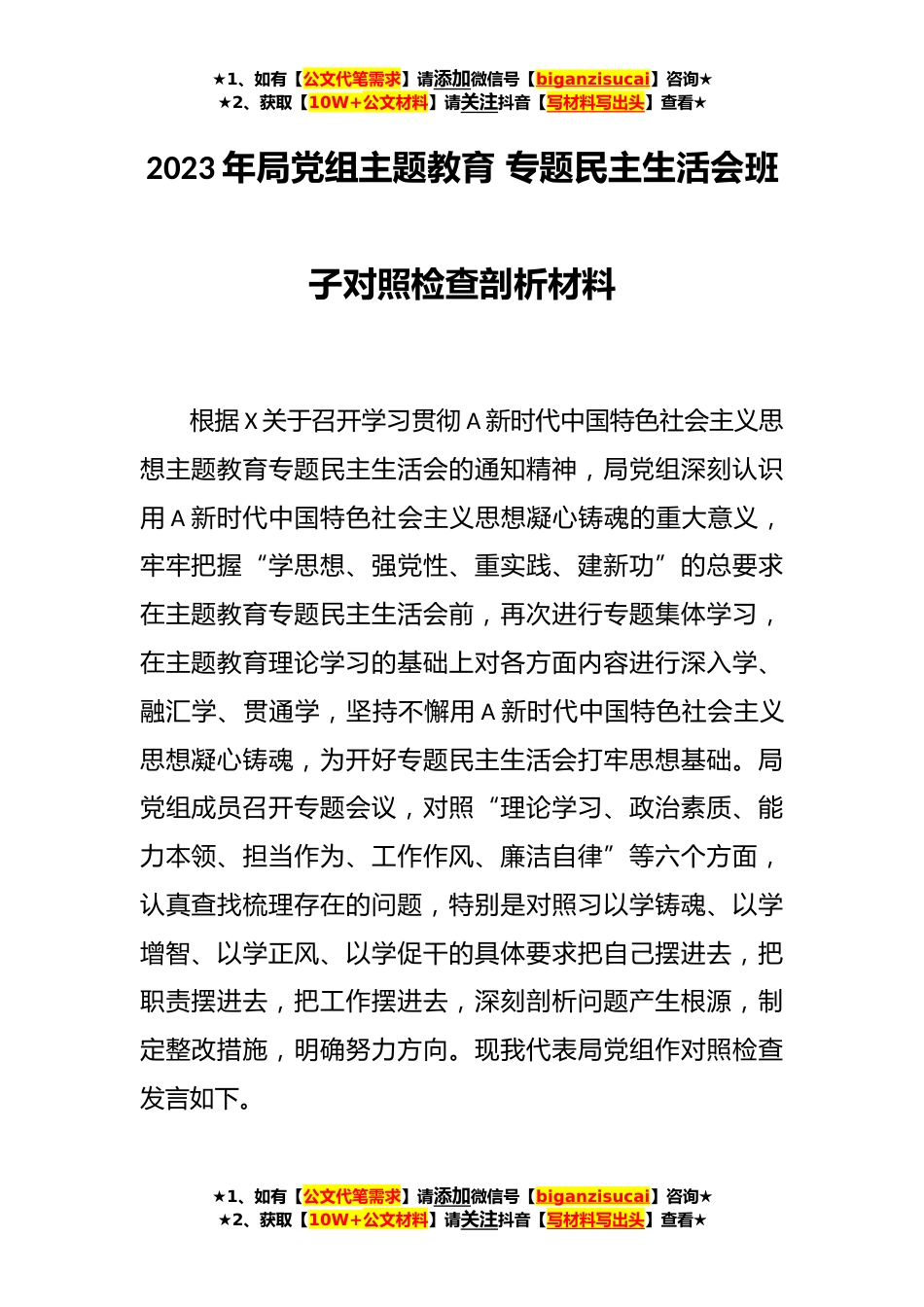 ★1、如有【公文代笔需求】请添加微信号【biganzisucai】咨询★★2、获取【10W+公文材料】请关注抖音【写材料写出头】查看★2023年局党组主题教育专题民主生活会班子对照检查剖析材料根据X关于召开学习贯彻A新时代中国特色社会主义思想主题教育专题民主生活会的通知精神,局党组深刻认识用A新时代中国特色社会主义思想凝心铸魂的重大意义,牢牢把握“学思想、强党性、重实践、建新功”的总要求在主题教育专题民主生活会前,再次进行专题集体学习,在主题教育理论学习的基础上对各方面内容进行深入学、融汇学、贯通学,坚持不懈用A新时代中国特色社会主义思想凝心铸魂,为开好专题民主生活会打牢思想基础。局党组成员召开专题会议,对照“理论学习、政治素质、能力本领、担当作为、工作作风、廉洁自律”等六个方面...