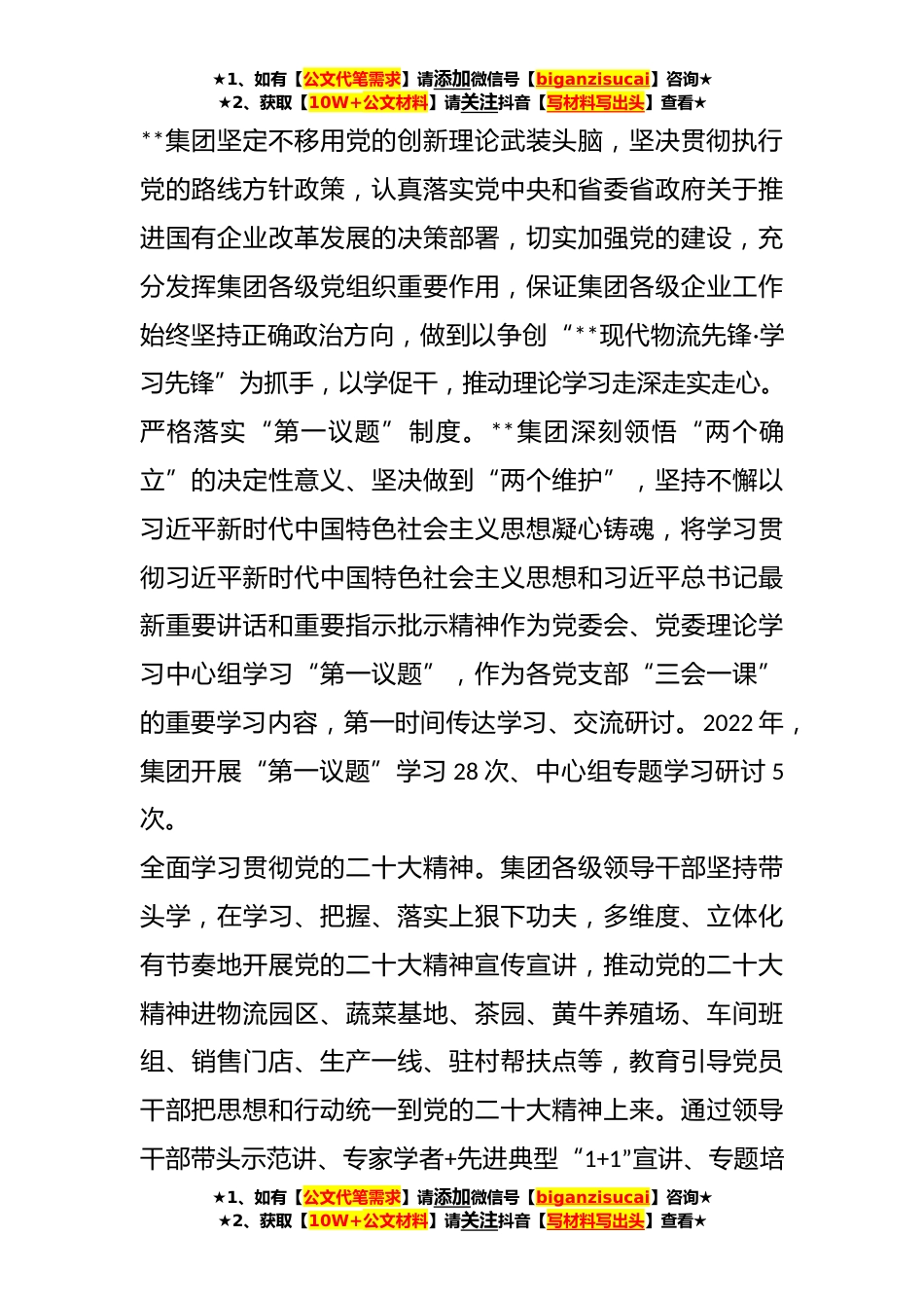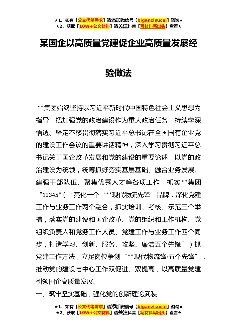 ★1、如有【公文代笔需求】请添加微信号【biganzisucai】咨询★★2、获取【10W+公文材料】请关注抖音【写材料写出头】查看★某国企以高质量党建促企业高质量发展经验做法**集团始终坚持以习近平新时代中国特色社会主义思想为指导,把加强党的政治建设作为重大政治任务,持续学深悟透、坚定不移贯彻落实习近平总书记在全国国有企业党的建设工作会议的重要讲话精神,深入学习贯彻习近平总书记关于国企改革发展和党的建设的重要论述,以党的政治建设为统领,统筹抓好夯实基层基础、融合业务发展、建强干部队伍、聚集优秀人才等各项工作,抓实**集团“12345”(“亮化一个‘**现代物流先锋’品牌,深化党建工作与业务工作两个融合,抓实培训、考核、示范三个举措,落实党的建设和国企改革、党的组织和工作机构、党组织...
