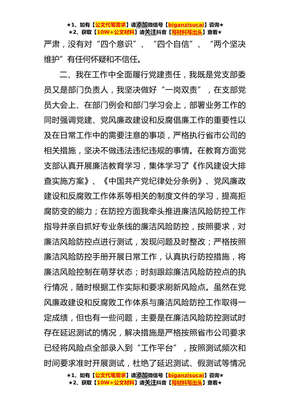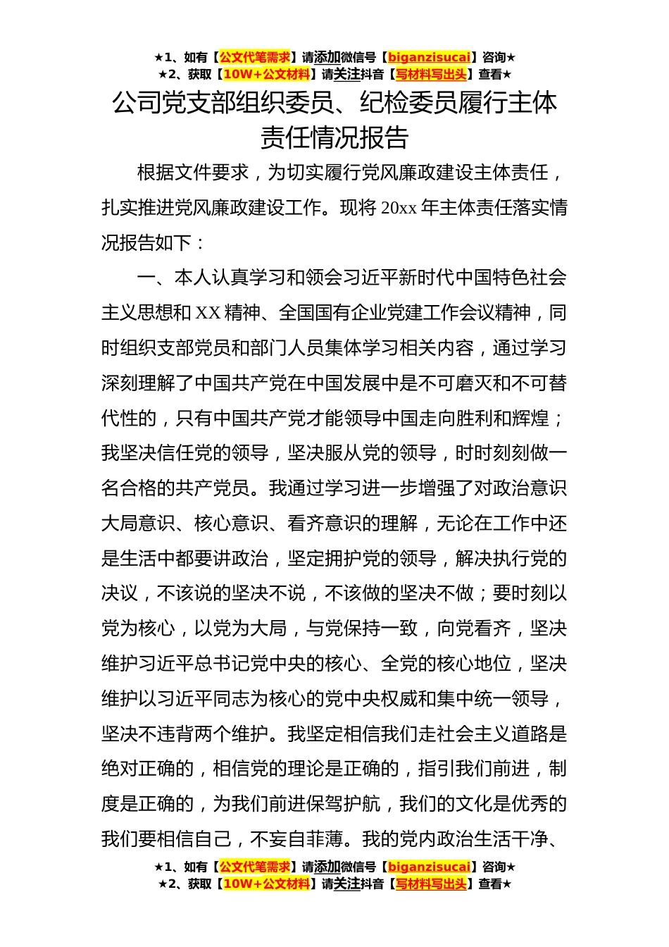 ★1、如有【公文代笔需求】请添加微信号【biganzisucai】咨询★★2、获取【10W+公文材料】请关注抖音【写材料写出头】查看★公司党支部组织委员、纪检委员履行主体责任情况报告根据文件要求,为切实履行党风廉政建设主体责任,扎实推进党风廉政建设工作。现将20xx年主体责任落实情况报告如下:一、本人认真学习和领会习近平新时代中国特色社会主义思想和XX精神、全国国有企业党建工作会议精神,同时组织支部党员和部门人员集体学习相关内容,通过学习深刻理解了中国共产党在中国发展中是不可磨灭和不可替代性的,只有中国共产党才能领导中国走向胜利和辉煌;我坚决信任党的领导,坚决服从党的领导,时时刻刻做一名合格的共产党员。我通过学习进一步增强了对政治意识大局意识、核心意识、看齐意识的理解,无论在工...