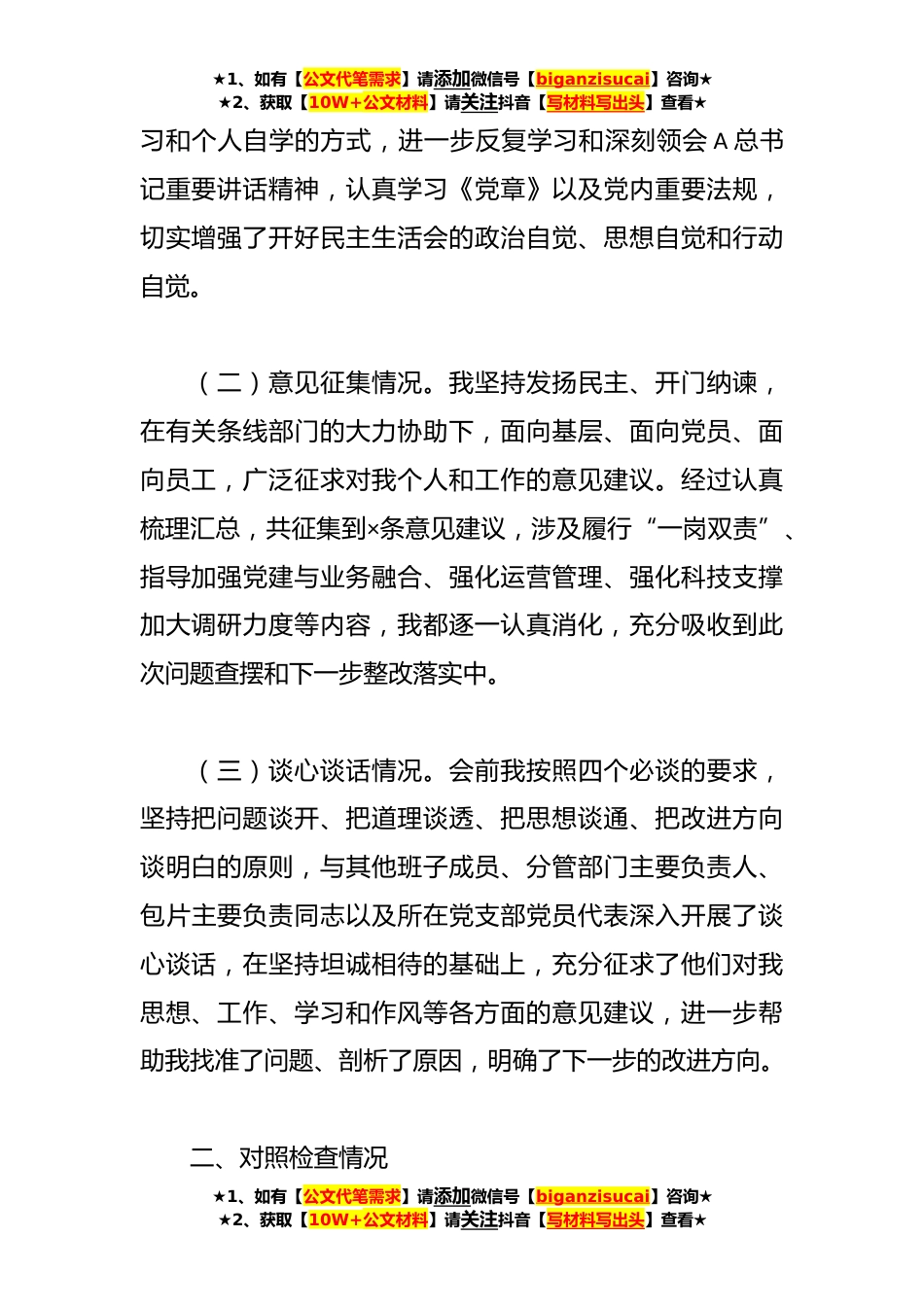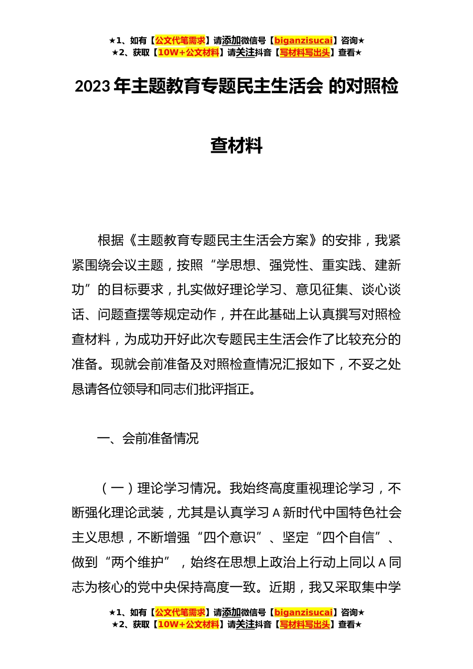 ★1、如有【公文代笔需求】请添加微信号【biganzisucai】咨询★★2、获取【10W+公文材料】请关注抖音【写材料写出头】查看★2023年主题教育专题民主生活会的对照检查材料根据《主题教育专题民主生活会方案》的安排,我紧紧围绕会议主题,按照“学思想、强党性、重实践、建新功”的目标要求,扎实做好理论学习、意见征集、谈心谈话、问题查摆等规定动作,并在此基础上认真撰写对照检查材料,为成功开好此次专题民主生活会作了比较充分的准备。现就会前准备及对照检查情况汇报如下,不妥之处恳请各位领导和同志们批评指正。一、会前准备情况(一)理论学习情况。我始终高度重视理论学习,不断强化理论武装,尤其是认真学习A新时代中国特色社会主义思想,不断增强“四个意识”、坚定“四个自信”、做到“两个维护”,...