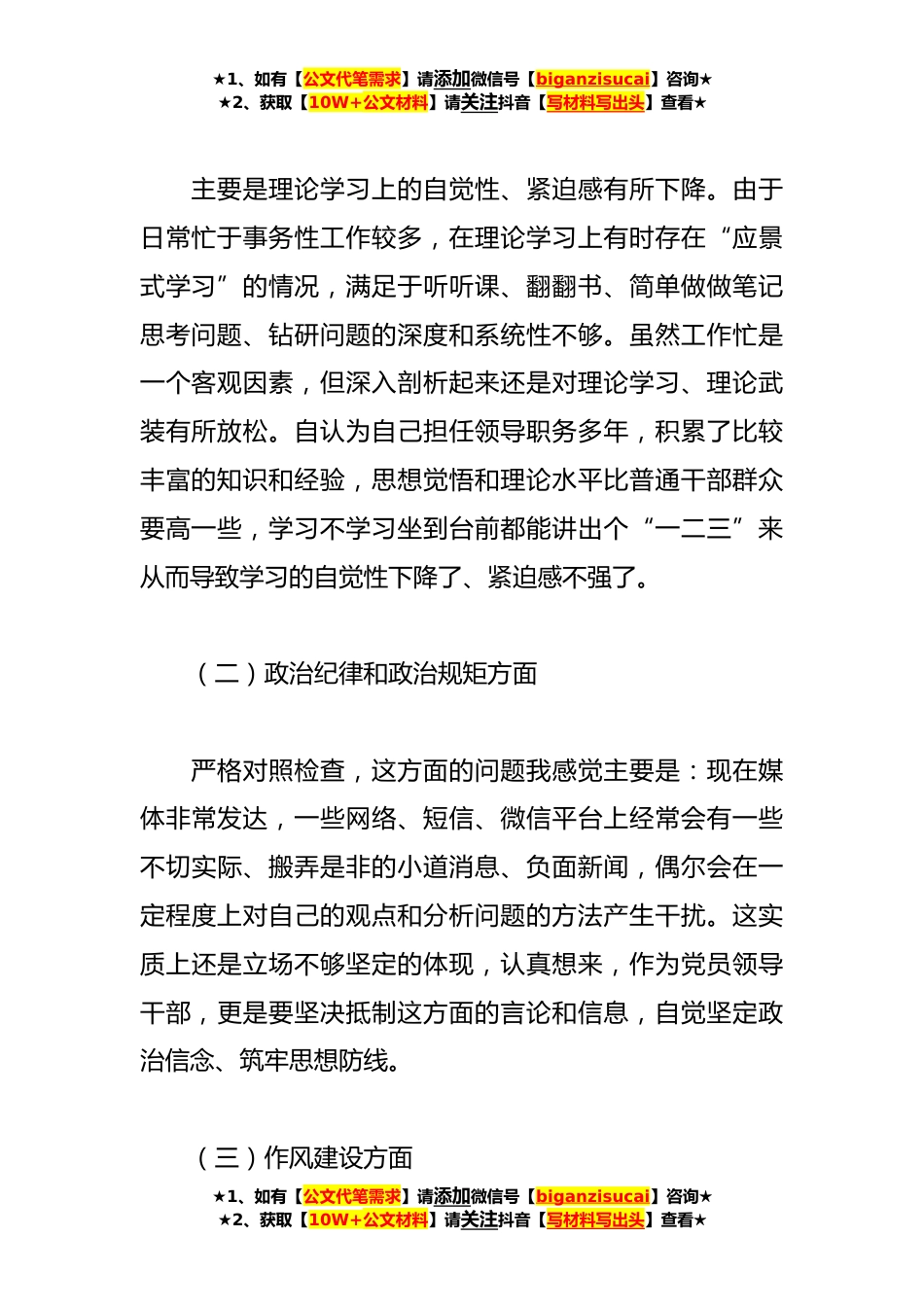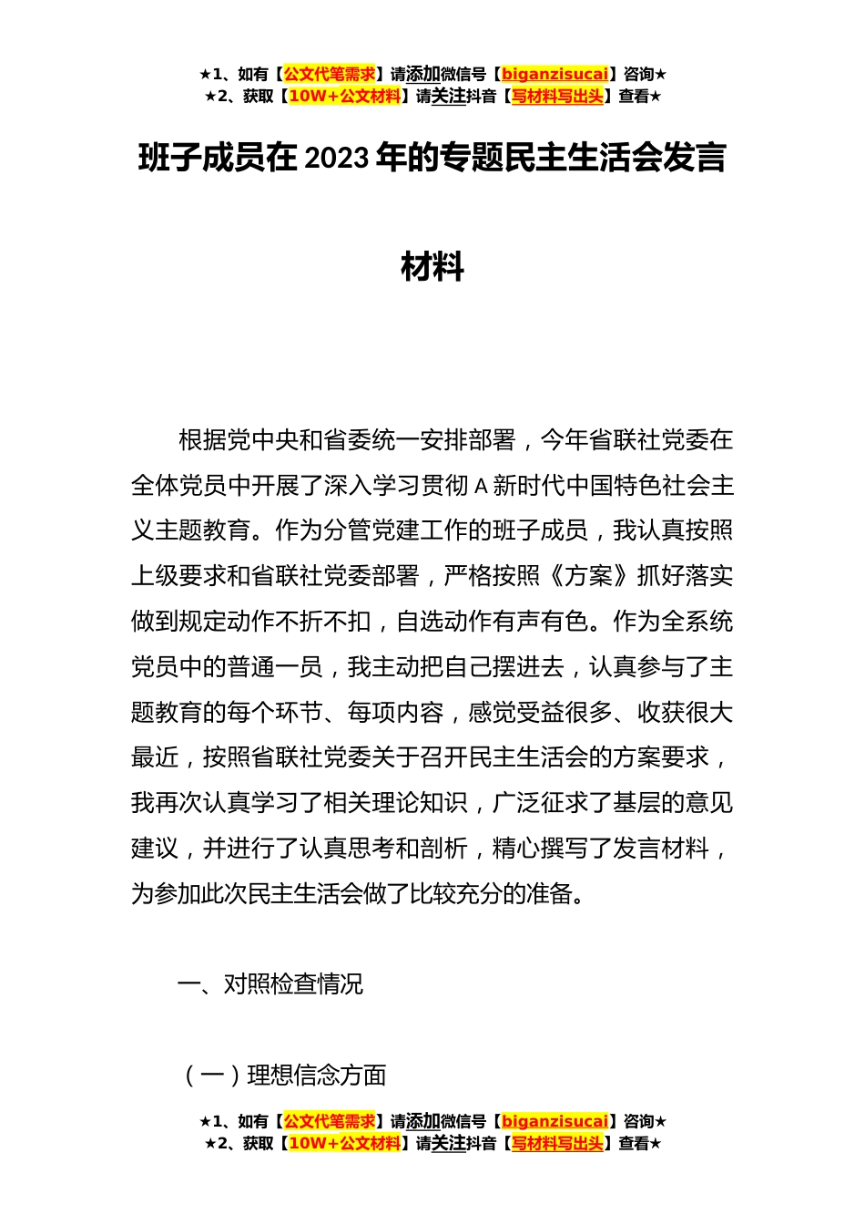★1、如有【公文代笔需求】请添加微信号【biganzisucai】咨询★★2、获取【10W+公文材料】请关注抖音【写材料写出头】查看★班子成员在2023年的专题民主生活会发言材料根据党中央和省委统一安排部署,今年省联社党委在全体党员中开展了深入学习贯彻A新时代中国特色社会主义主题教育。作为分管党建工作的班子成员,我认真按照上级要求和省联社党委部署,严格按照《方案》抓好落实做到规定动作不折不扣,自选动作有声有色。作为全系统党员中的普通一员,我主动把自己摆进去,认真参与了主题教育的每个环节、每项内容,感觉受益很多、收获很大最近,按照省联社党委关于召开民主生活会的方案要求,我再次认真学习了相关理论知识,广泛征求了基层的意见建议,并进行了认真思考和剖析,精心撰写了发言材料,为参加此次民...