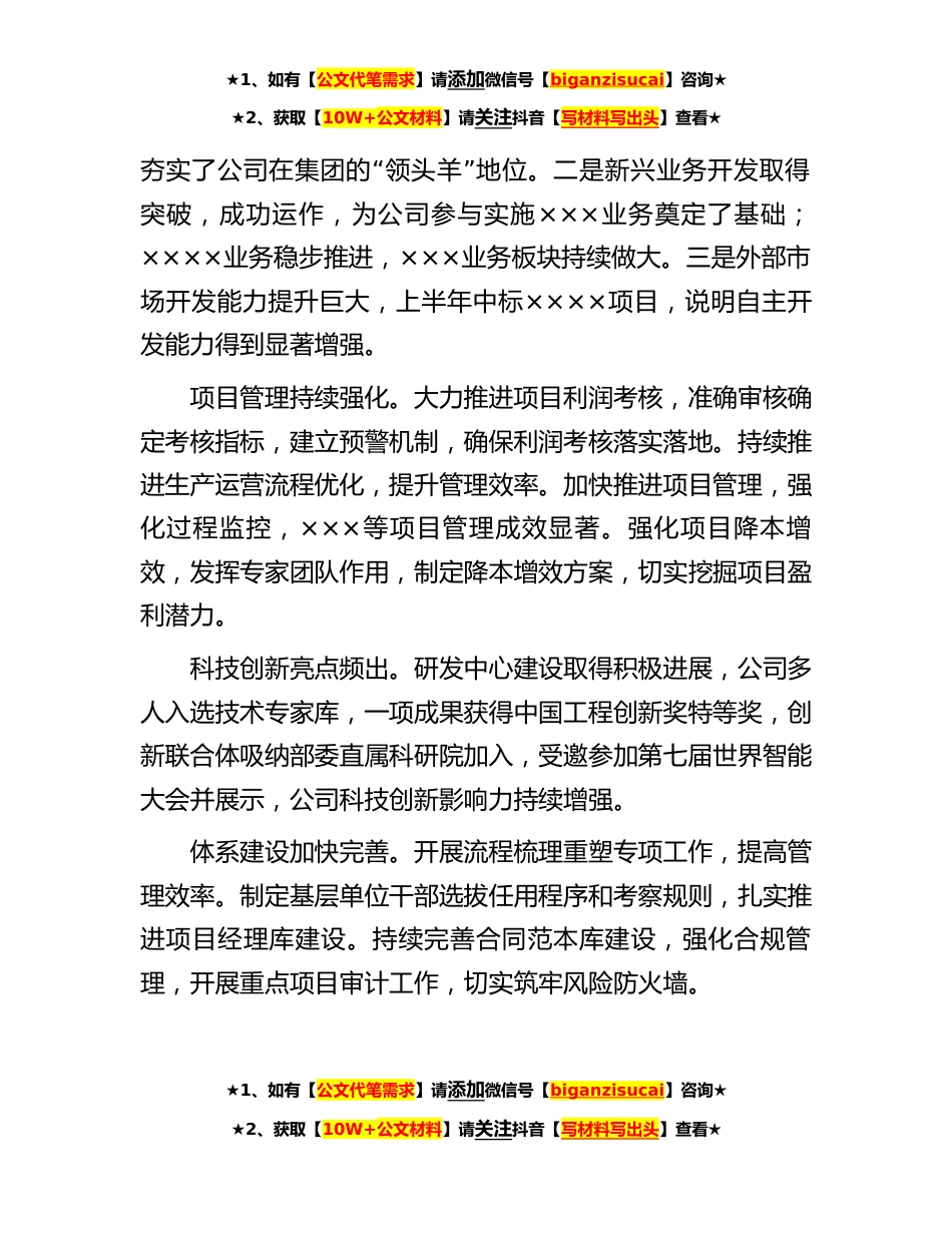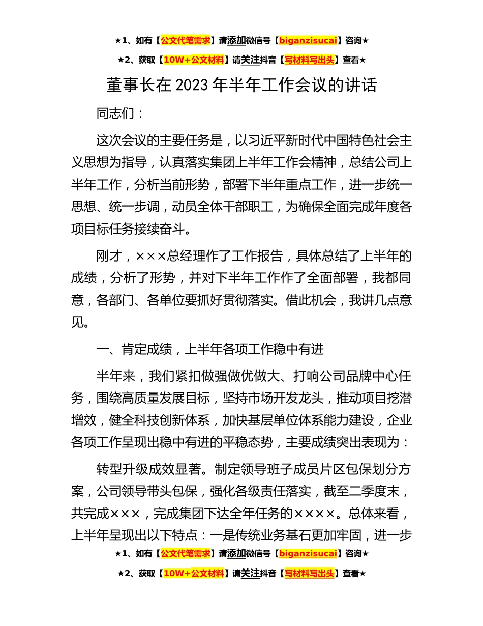 ★1、如有【公文代笔需求】请添加微信号【biganzisucai】咨询★★2、获取【10W+公文材料】请关注抖音【写材料写出头】查看★董事长在2023年半年工作会议的讲话同志们:这次会议的主要任务是,以习近平新时代中国特色社会主义思想为指导,认真落实集团上半年工作会精神,总结公司上半年工作,分析当前形势,部署下半年重点工作,进一步统一思想、统一步调,动员全体干部职工,为确保全面完成年度各项目标任务接续奋斗。刚才,×××总经理作了工作报告,具体总结了上半年的成绩,分析了形势,并对下半年工作作了全面部署,我都同意,各部门、各单位要抓好贯彻落实。借此机会,我讲几点意见。一、肯定成绩,上半年各项工作稳中有进半年来,我们紧扣做强做优做大、打响公司品牌中心任务,围绕高质量发展目标,坚持市...