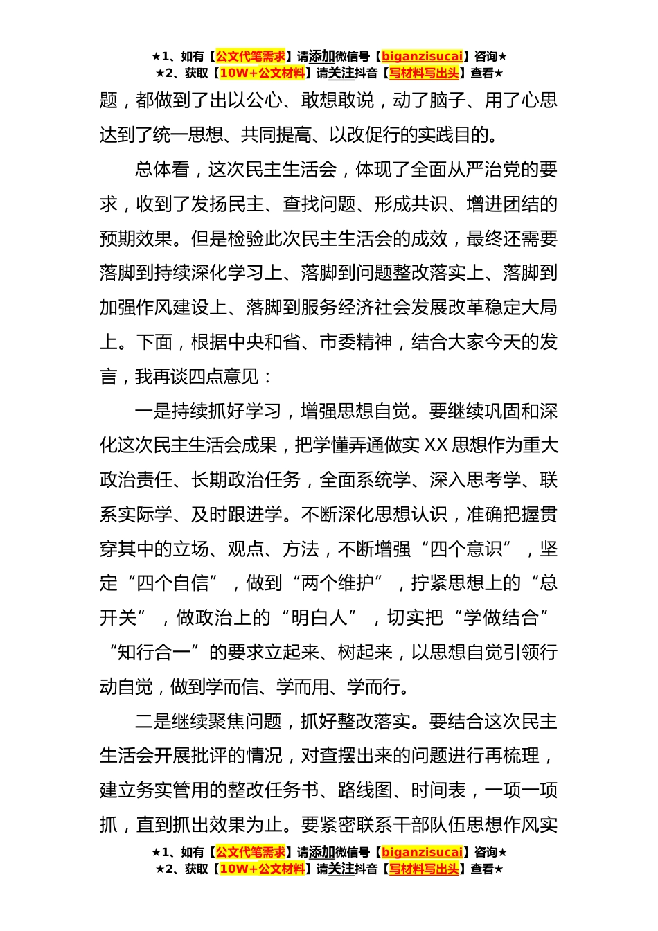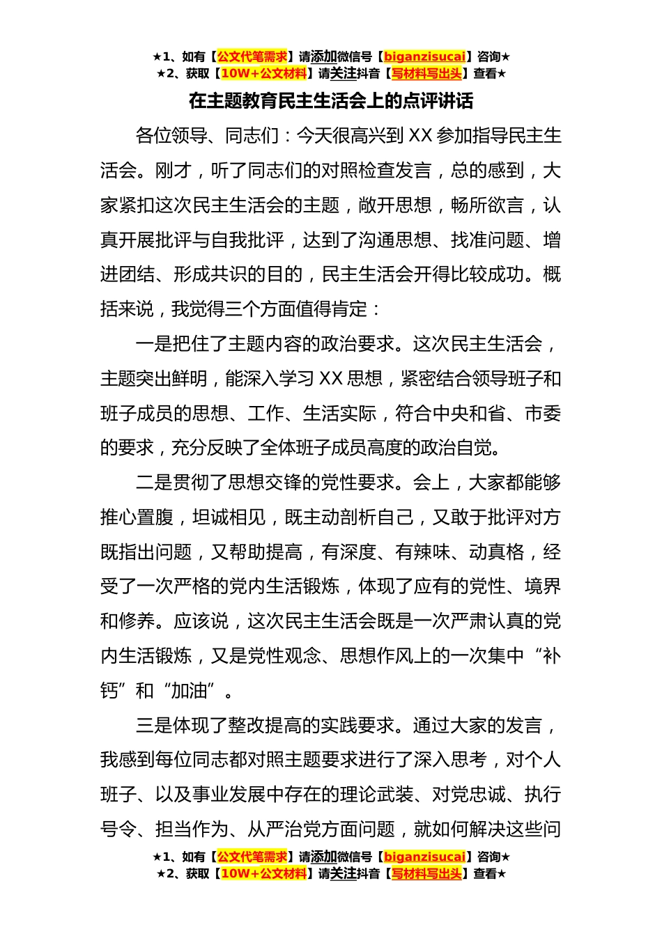 ★1、如有【公文代笔需求】请添加微信号【biganzisucai】咨询★★2、获取【10W+公文材料】请关注抖音【写材料写出头】查看★在主题教育民主生活会上的点评讲话各位领导、同志们:今天很高兴到XX参加指导民主生活会。刚才,听了同志们的对照检查发言,总的感到,大家紧扣这次民主生活会的主题,敞开思想,畅所欲言,认真开展批评与自我批评,达到了沟通思想、找准问题、增进团结、形成共识的目的,民主生活会开得比较成功。概括来说,我觉得三个方面值得肯定:一是把住了主题内容的政治要求。这次民主生活会,主题突出鲜明,能深入学习XX思想,紧密结合领导班子和班子成员的思想、工作、生活实际,符合中央和省、市委的要求,充分反映了全体班子成员高度的政治自觉。二是贯彻了思想交锋的党性要求。会上,大家都能...