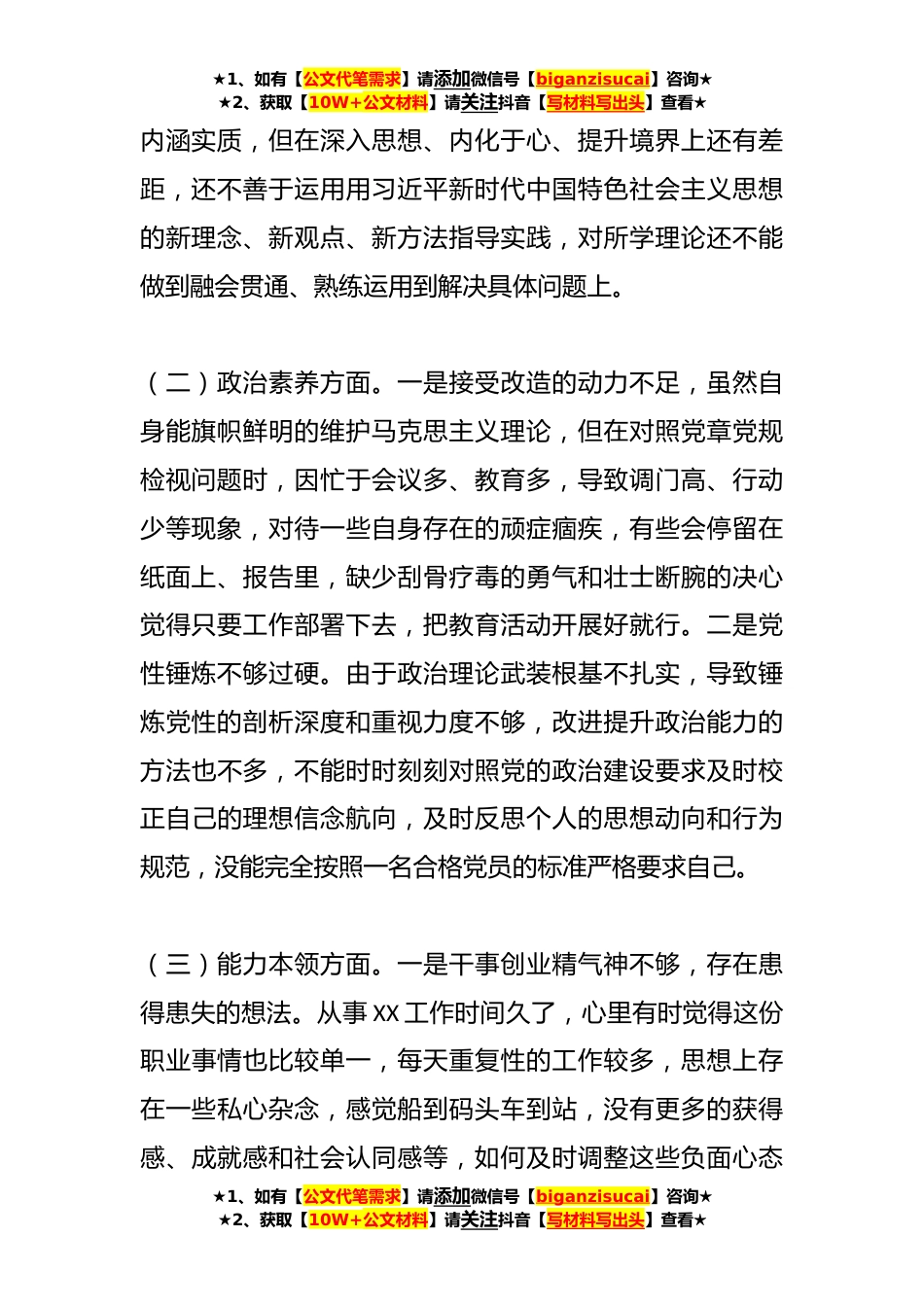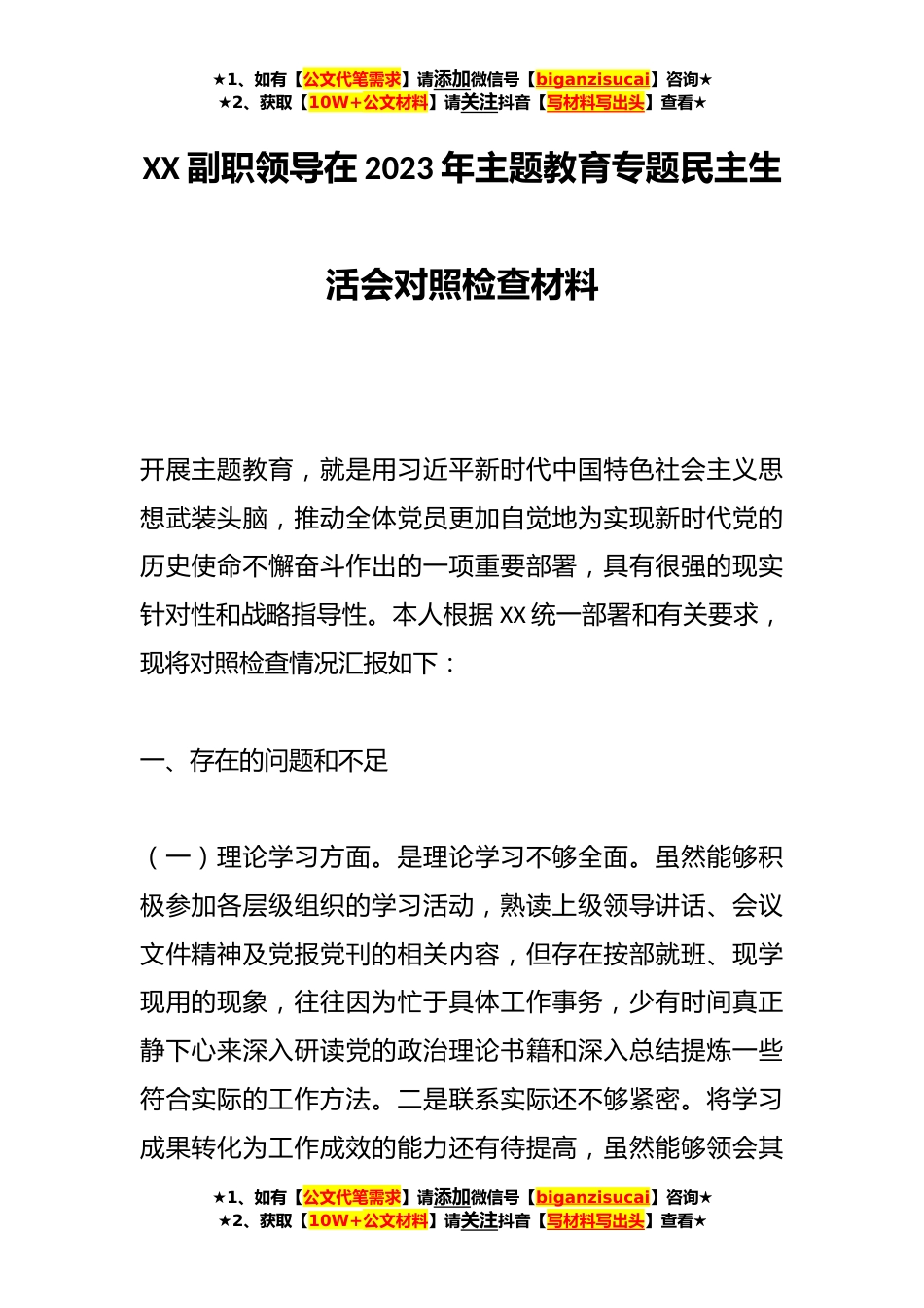 ★1、如有【公文代笔需求】请添加微信号【biganzisucai】咨询★★2、获取【10W+公文材料】请关注抖音【写材料写出头】查看★XX副职领导在2023年主题教育专题民主生活会对照检查材料开展主题教育,就是用习近平新时代中国特色社会主义思想武装头脑,推动全体党员更加自觉地为实现新时代党的历史使命不懈奋斗作出的一项重要部署,具有很强的现实针对性和战略指导性。本人根据XX统一部署和有关要求,现将对照检查情况汇报如下:一、存在的问题和不足(一)理论学习方面。是理论学习不够全面。虽然能够积极参加各层级组织的学习活动,熟读上级领导讲话、会议文件精神及党报党刊的相关内容,但存在按部就班、现学现用的现象,往往因为忙于具体工作事务,少有时间真正静下心来深入研读党的政治理论书籍和深入总结提炼一...
