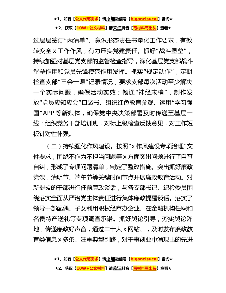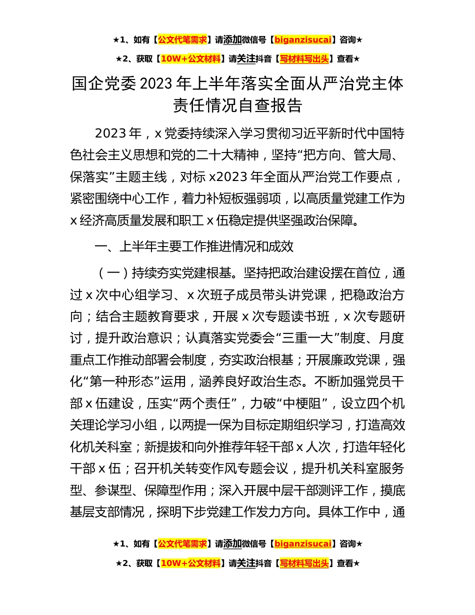 ★1、如有【公文代笔需求】请添加微信号【biganzisucai】咨询★★2、获取【10W+公文材料】请关注抖音【写材料写出头】查看★国企党委2023年上半年落实全面从严治党主体责任情况自查报告2023年,x党委持续深入学习贯彻习近平新时代中国特“色社会主义思想和党的二十大精神,坚持把方向、管大局、”保落实主题主线,对标x2023年全面从严治党工作要点,紧密围绕中心工作,着力补短板强弱项,以高质量党建工作为x经济高质量发展和职工x伍稳定提供坚强政治保障。一、上半年主要工作推进情况和成效(一)持续夯实党建根基。坚持把政治建设摆在首位,通过x次中心组学习、x次班子成员带头讲党课,把稳政治方向;结合主题教育要求,开展x次专题读书班,x次专题研“”讨,提升政治意识;认真落实党委会三重一大制度、月度重...