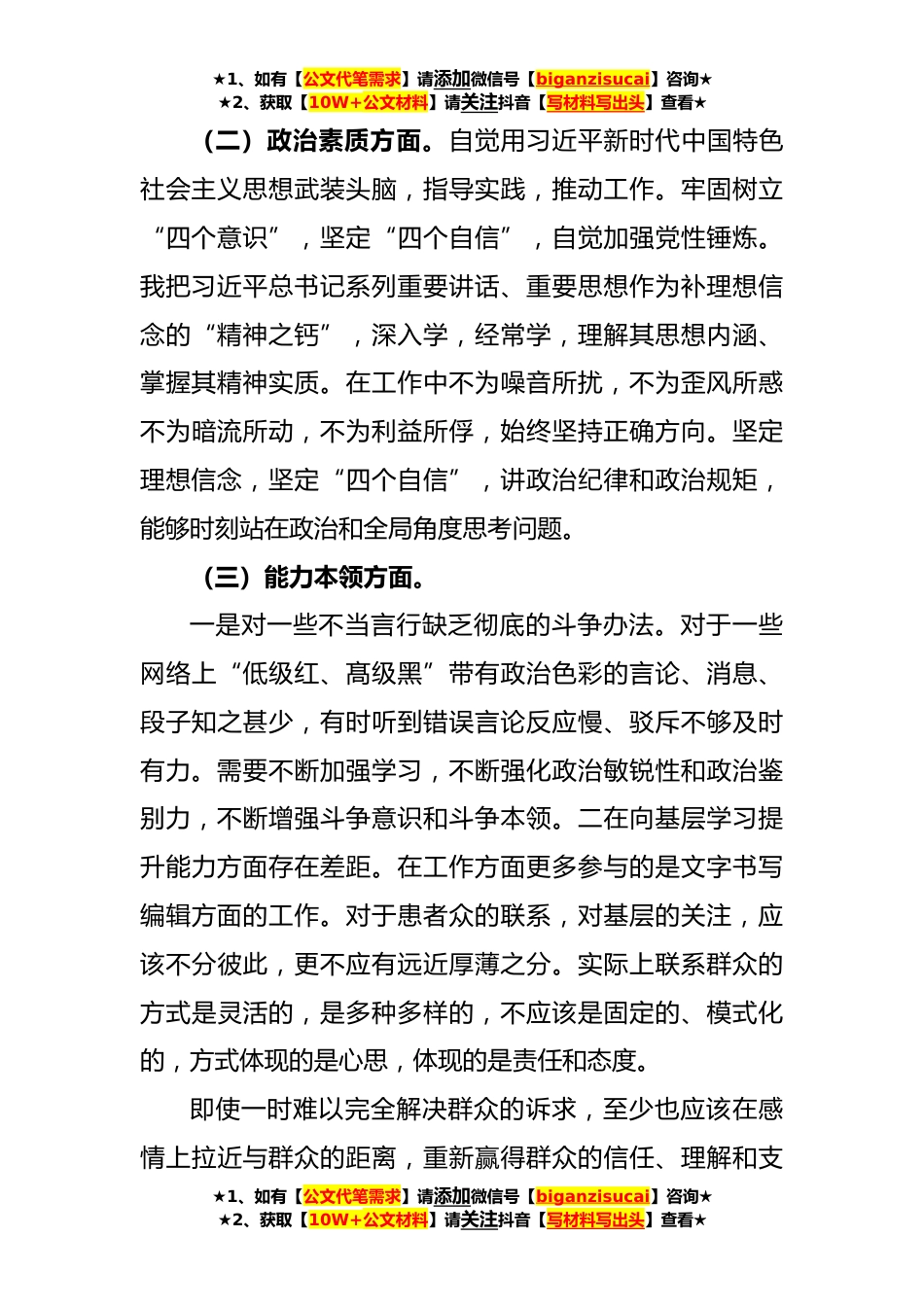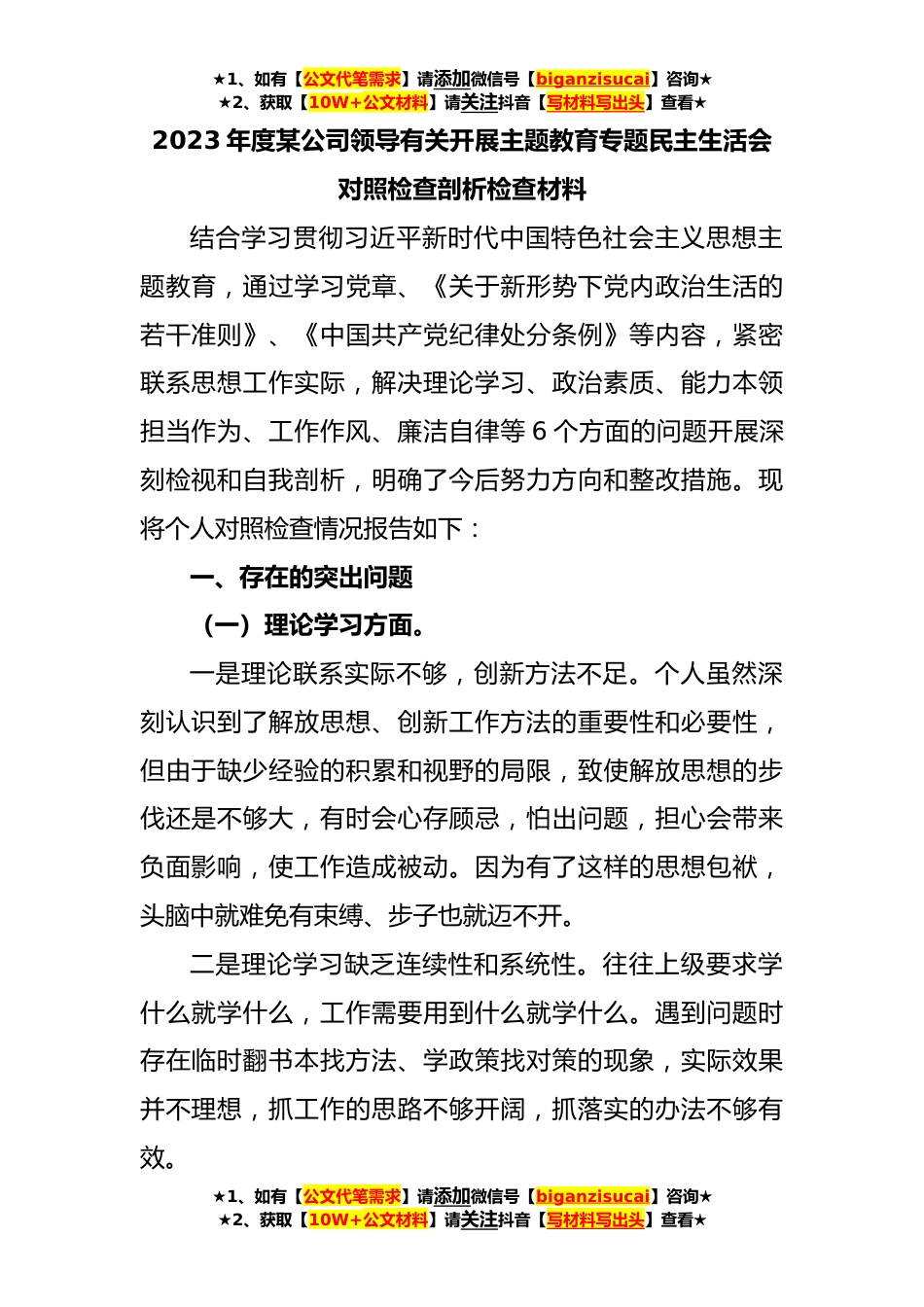 ★1、如有【公文代笔需求】请添加微信号【biganzisucai】咨询★★2、获取【10W+公文材料】请关注抖音【写材料写出头】查看★2023年度某公司领导有关开展主题教育专题民主生活会对照检查剖析检查材料结合学习贯彻习近平新时代中国特色社会主义思想主题教育,通过学习党章、《关于新形势下党内政治生活的若干准则》、《中国共产党纪律处分条例》等内容,紧密联系思想工作实际,解决理论学习、政治素质、能力本领担当作为、工作作风、廉洁自律等6个方面的问题开展深刻检视和自我剖析,明确了今后努力方向和整改措施。现将个人对照检查情况报告如下:一、存在的突出问题(一)理论学习方面。一是理论联系实际不够,创新方法不足。个人虽然深刻认识到了解放思想、创新工作方法的重要性和必要性,但由于缺少经验的积累和...