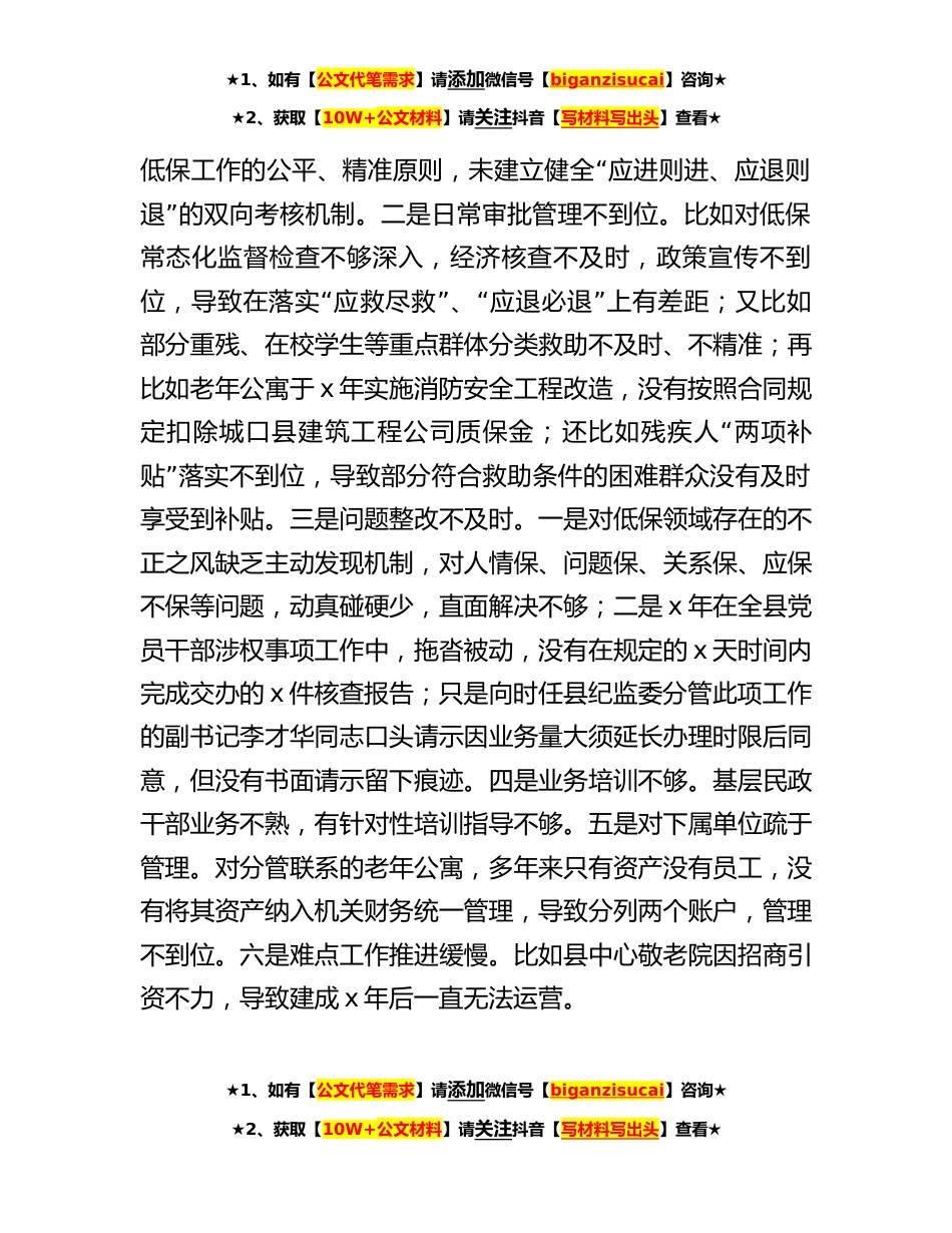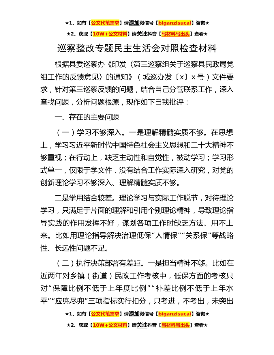★1、如有【公文代笔需求】请添加微信号【biganzisucai】咨询★★2、获取【10W+公文材料】请关注抖音【写材料写出头】查看★巡察整改专题民主生活会对照检查材料根据县委巡察办《印发〈第三巡察组关于巡察县民政局党组工作的反馈意见〉的通知》(城巡办发〔x〕x号)文件要求,针对第三巡察反馈的问题,结合自己分管联系工作,深入查找问题,分析问题根源,现作如下自我批评:一、存在的主要问题(一)学习不够深入。一是理解精髓实质不够。在思想上,学习习近平新时代中国特色社会主义思想和二十大精神不够重视;在行动上,缺乏主动性和自觉性,被动学习;学习形式单一,仅限于学文件,没有结合工作实际深入研究,对党的创新理论学习不够深入、理解精髓实质不够。二是学用结合较差。理论学习与实际工作脱节,对待...