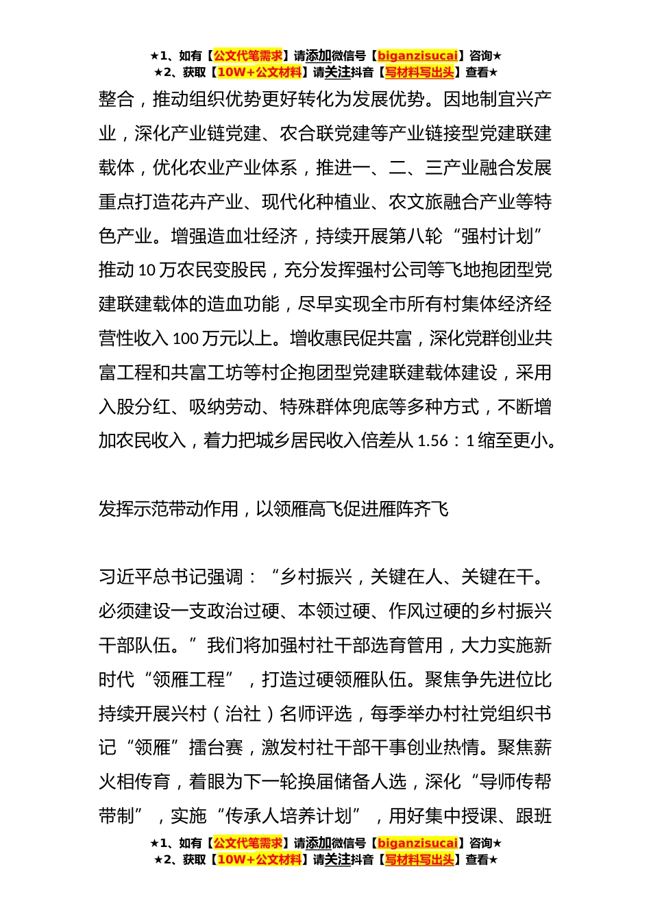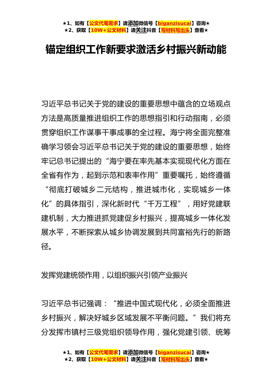 ★1、如有【公文代笔需求】请添加微信号【biganzisucai】咨询★★2、获取【10W+公文材料】请关注抖音【写材料写出头】查看★锚定组织工作新要求激活乡村振兴新动能习近平总书记关于党的建设的重要思想中蕴含的立场观点方法是高质量推进组织工作的思想指引和行动指南,必须贯穿组织工作谋事干事成事的全过程。海宁将全面完整准确学习领会习近平总书记关于党的建设的重要思想,始终牢记总书记提出的“海宁要在率先基本实现现代化方面在全省有作为,起到示范和表率作用”重要嘱托,始终遵循“彻底打破城乡二元结构,推进城市化,实现城乡一体化”的具体指引,深化新时代“千万工程”,用好党建联建机制,大力推进抓党建促乡村振兴,提高城乡一体化发展水平,不断探索从城乡协调发展到共同富裕先行的新路径。发挥党建...