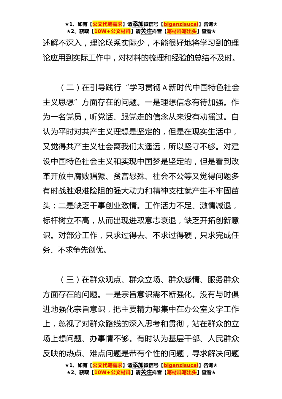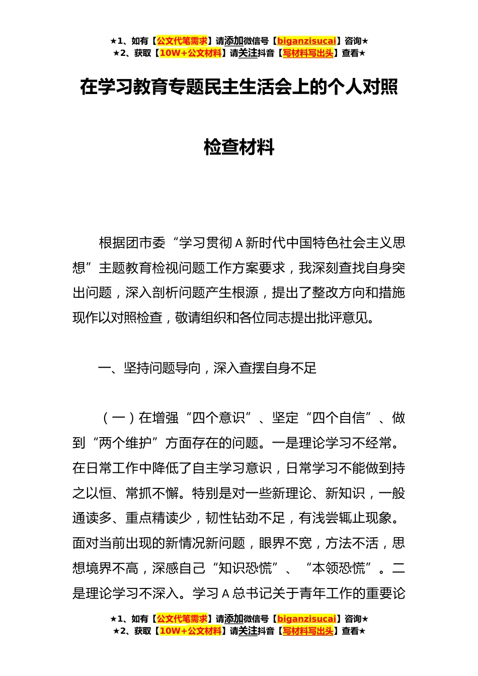★1、如有【公文代笔需求】请添加微信号【biganzisucai】咨询★★2、获取【10W+公文材料】请关注抖音【写材料写出头】查看★在学习教育专题民主生活会上的个人对照检查材料根据团市委“学习贯彻A新时代中国特色社会主义思想”主题教育检视问题工作方案要求,我深刻查找自身突出问题,深入剖析问题产生根源,提出了整改方向和措施现作以对照检查,敬请组织和各位同志提出批评意见。一、坚持问题导向,深入查摆自身不足(一)在增强“四个意识”、坚定“四个自信”、做到“两个维护”方面存在的问题。一是理论学习不经常。在日常工作中降低了自主学习意识,日常学习不能做到持之以恒、常抓不懈。特别是对一些新理论、新知识,一般通读多、重点精读少,韧性钻劲不足,有浅尝辄止现象。面对当前出现的新情况新问题,眼...