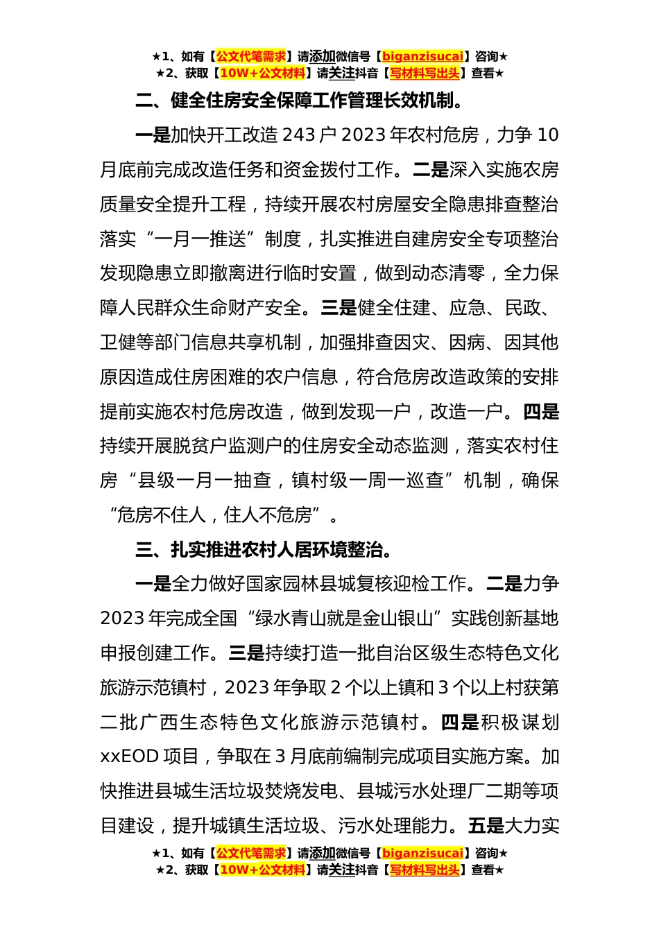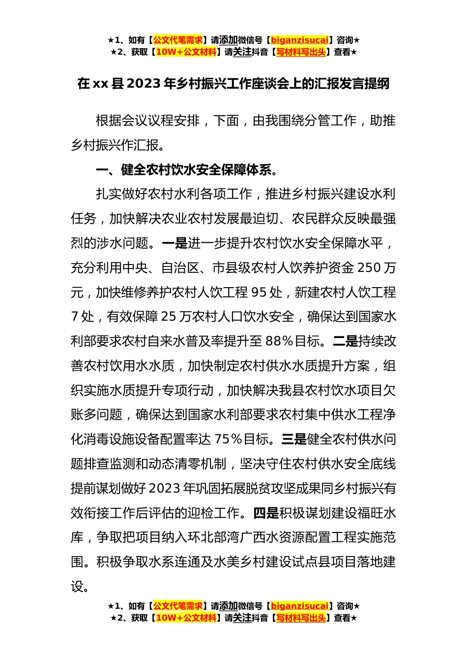 ★1、如有【公文代笔需求】请添加微信号【biganzisucai】咨询★★2、获取【10W+公文材料】请关注抖音【写材料写出头】查看★在xx县2023年乡村振兴工作座谈会上的汇报发言提纲根据会议议程安排,下面,由我围绕分管工作,助推乡村振兴作汇报。一、健全农村饮水安全保障体系。扎实做好农村水利各项工作,推进乡村振兴建设水利任务,加快解决农业农村发展最迫切、农民群众反映最强烈的涉水问题。一是进一步提升农村饮水安全保障水平,充分利用中央、自治区、市县级农村人饮养护资金250万元,加快维修养护农村人饮工程95处,新建农村人饮工程7处,有效保障25万农村人口饮水安全,确保达到国家水利部要求农村自来水普及率提升至88%目标。二是持续改善农村饮用水水质,加快制定农村供水水质提升方案,组织实施水质提升...