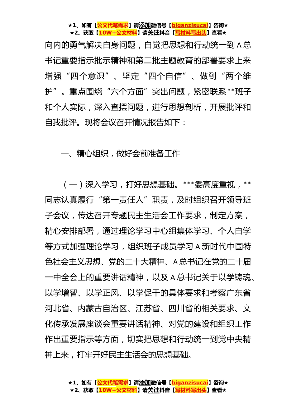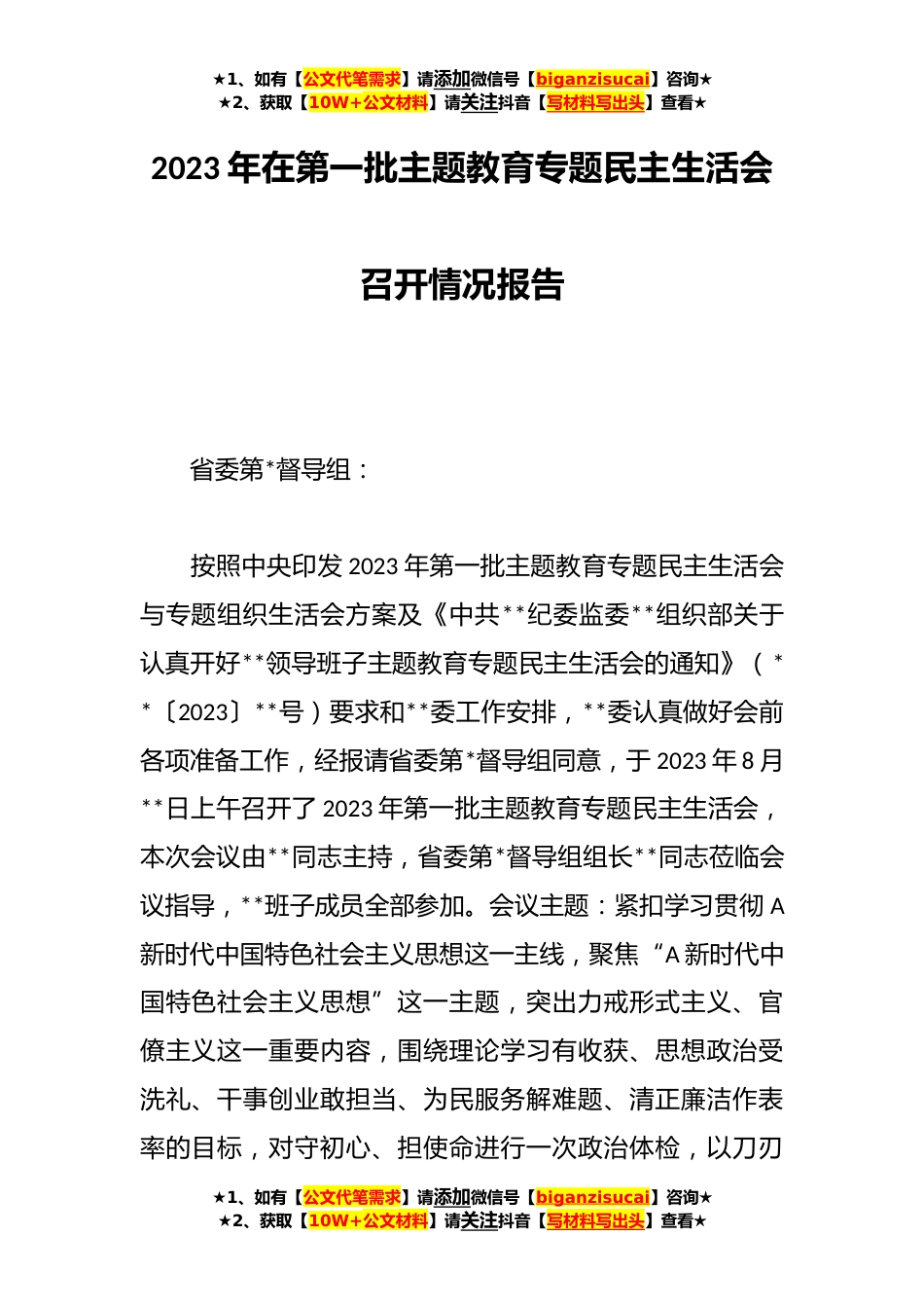 ★1、如有【公文代笔需求】请添加微信号【biganzisucai】咨询★★2、获取【10W+公文材料】请关注抖音【写材料写出头】查看★2023年在第一批主题教育专题民主生活会召开情况报告省委第*督导组:按照中央印发2023年第一批主题教育专题民主生活会与专题组织生活会方案及《中共**纪委监委**组织部关于认真开好**领导班子主题教育专题民主生活会的通知》(**〔2023〕**号)要求和**委工作安排,**委认真做好会前各项准备工作,经报请省委第*督导组同意,于2023年8月**日上午召开了2023年第一批主题教育专题民主生活会,本次会议由**同志主持,省委第*督导组组长**同志莅临会议指导,**班子成员全部参加。会议主题:紧扣学习贯彻A新时代中国特色社会主义思想这一主线,聚焦“A新时代中国特色社会主义思想”这一主题,突...