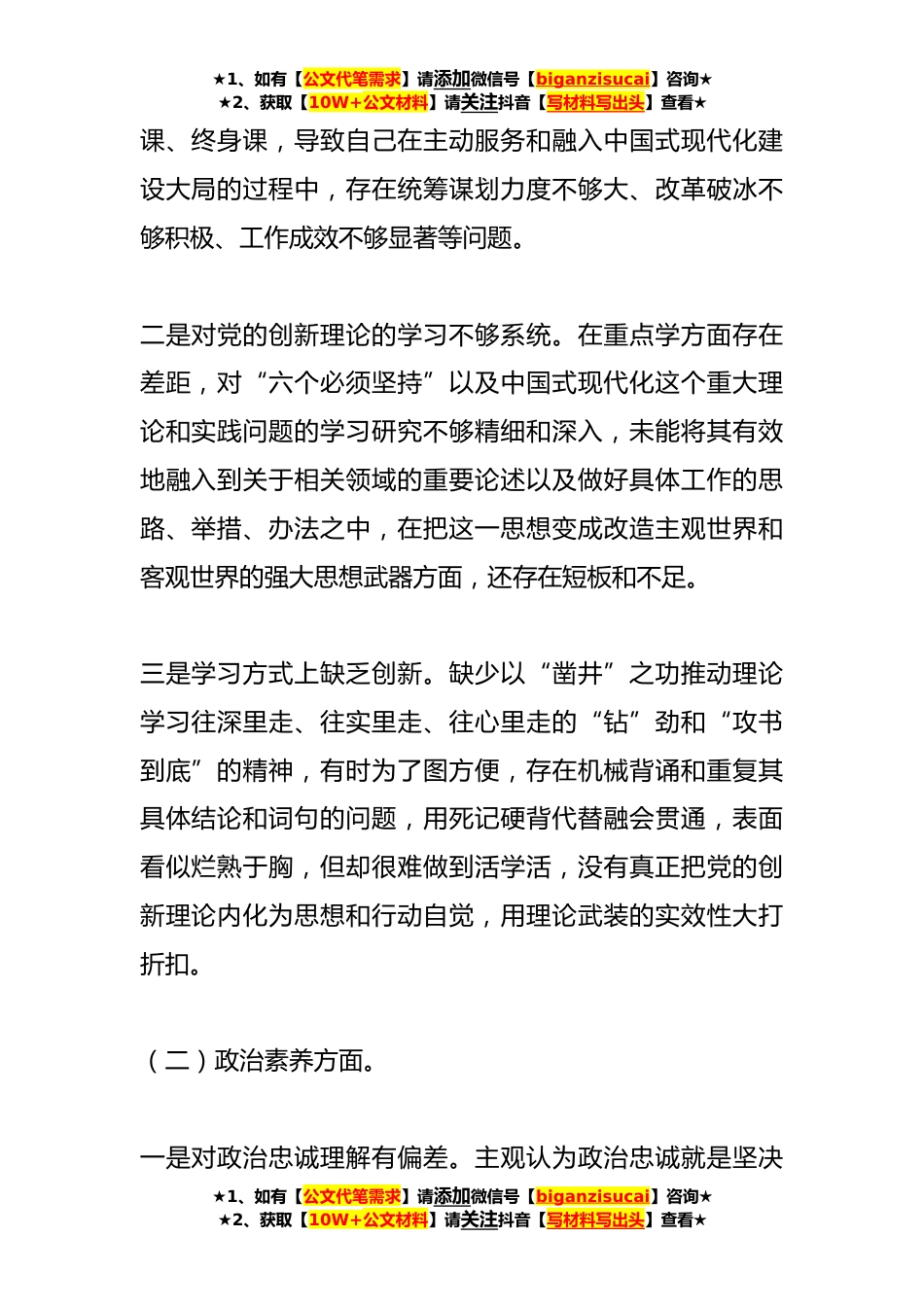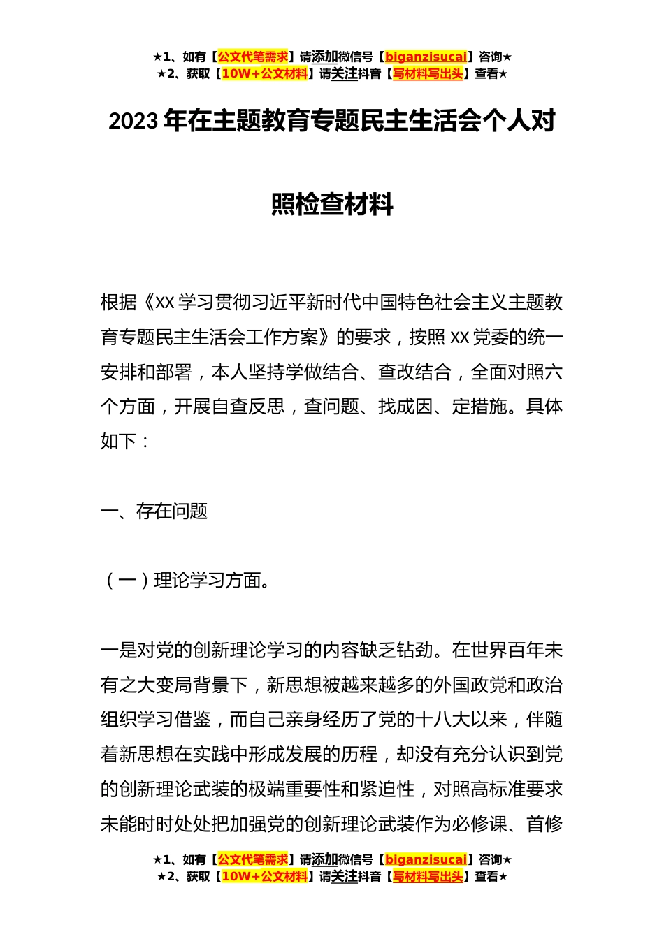 ★1、如有【公文代笔需求】请添加微信号【biganzisucai】咨询★★2、获取【10W+公文材料】请关注抖音【写材料写出头】查看★2023年在主题教育专题民主生活会个人对照检查材料根据《XX学习贯彻习近平新时代中国特色社会主义主题教育专题民主生活会工作方案》的要求,按照XX党委的统一安排和部署,本人坚持学做结合、查改结合,全面对照六个方面,开展自查反思,查问题、找成因、定措施。具体如下:一、存在问题(一)理论学习方面。一是对党的创新理论学习的内容缺乏钻劲。在世界百年未有之大变局背景下,新思想被越来越多的外国政党和政治组织学习借鉴,而自己亲身经历了党的十八大以来,伴随着新思想在实践中形成发展的历程,却没有充分认识到党的创新理论武装的极端重要性和紧迫性,对照高标准要求未能时时处处...