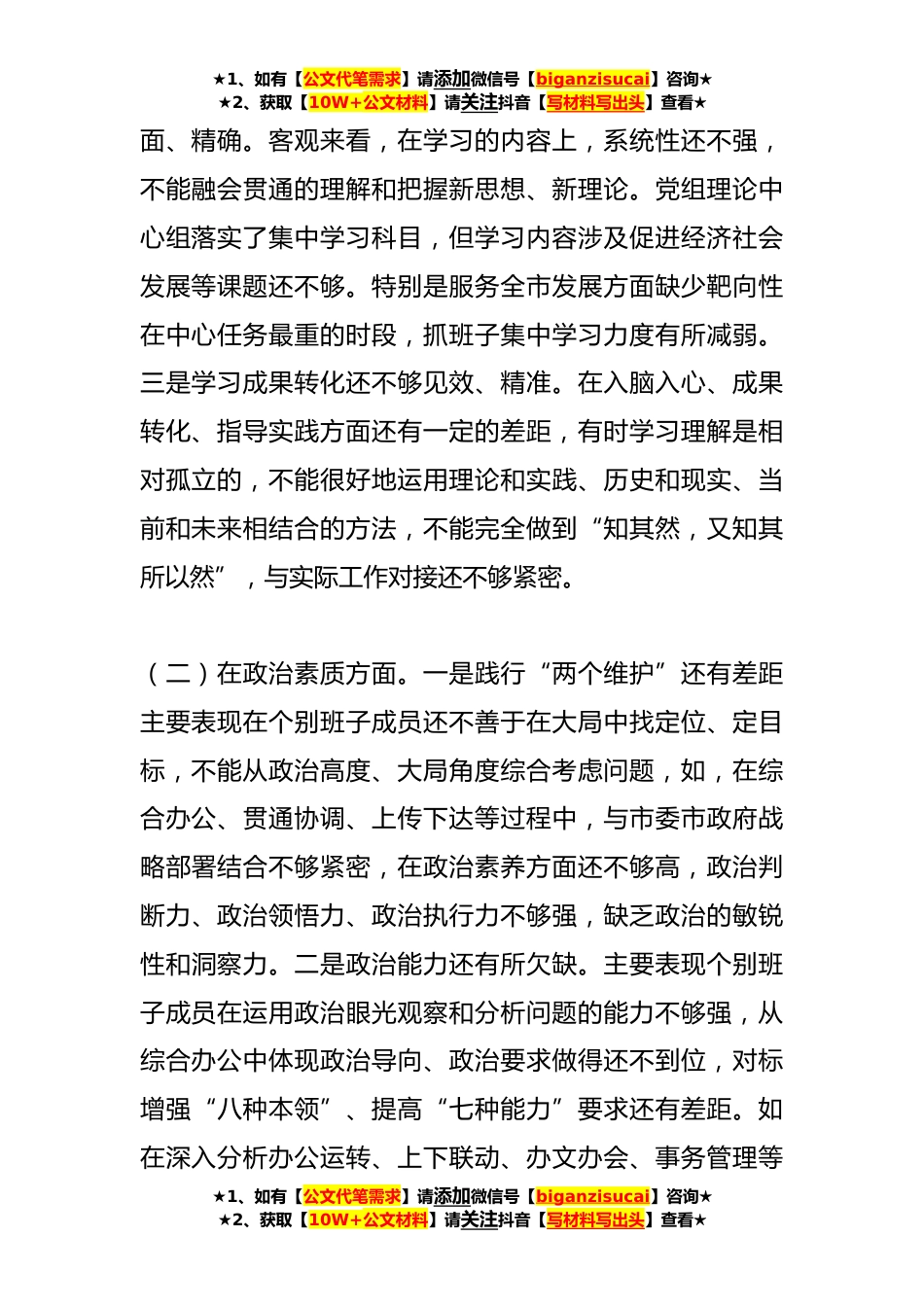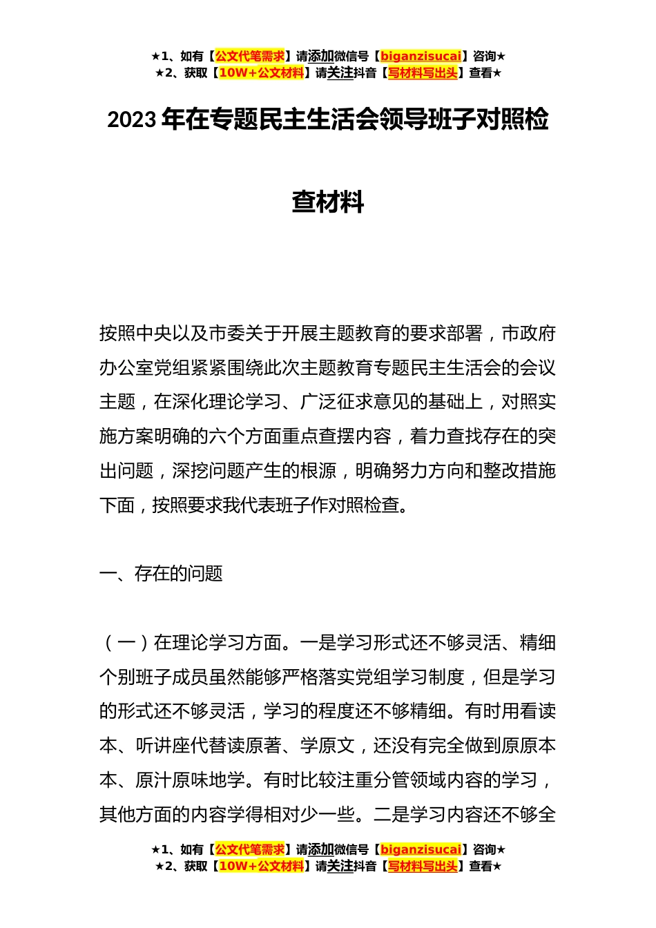 ★1、如有【公文代笔需求】请添加微信号【biganzisucai】咨询★★2、获取【10W+公文材料】请关注抖音【写材料写出头】查看★2023年在专题民主生活会领导班子对照检查材料按照中央以及市委关于开展主题教育的要求部署,市政府办公室党组紧紧围绕此次主题教育专题民主生活会的会议主题,在深化理论学习、广泛征求意见的基础上,对照实施方案明确的六个方面重点查摆内容,着力查找存在的突出问题,深挖问题产生的根源,明确努力方向和整改措施下面,按照要求我代表班子作对照检查。一、存在的问题(一)在理论学习方面。一是学习形式还不够灵活、精细个别班子成员虽然能够严格落实党组学习制度,但是学习的形式还不够灵活,学习的程度还不够精细。有时用看读本、听讲座代替读原著、学原文,还没有完全做到原原本本、...