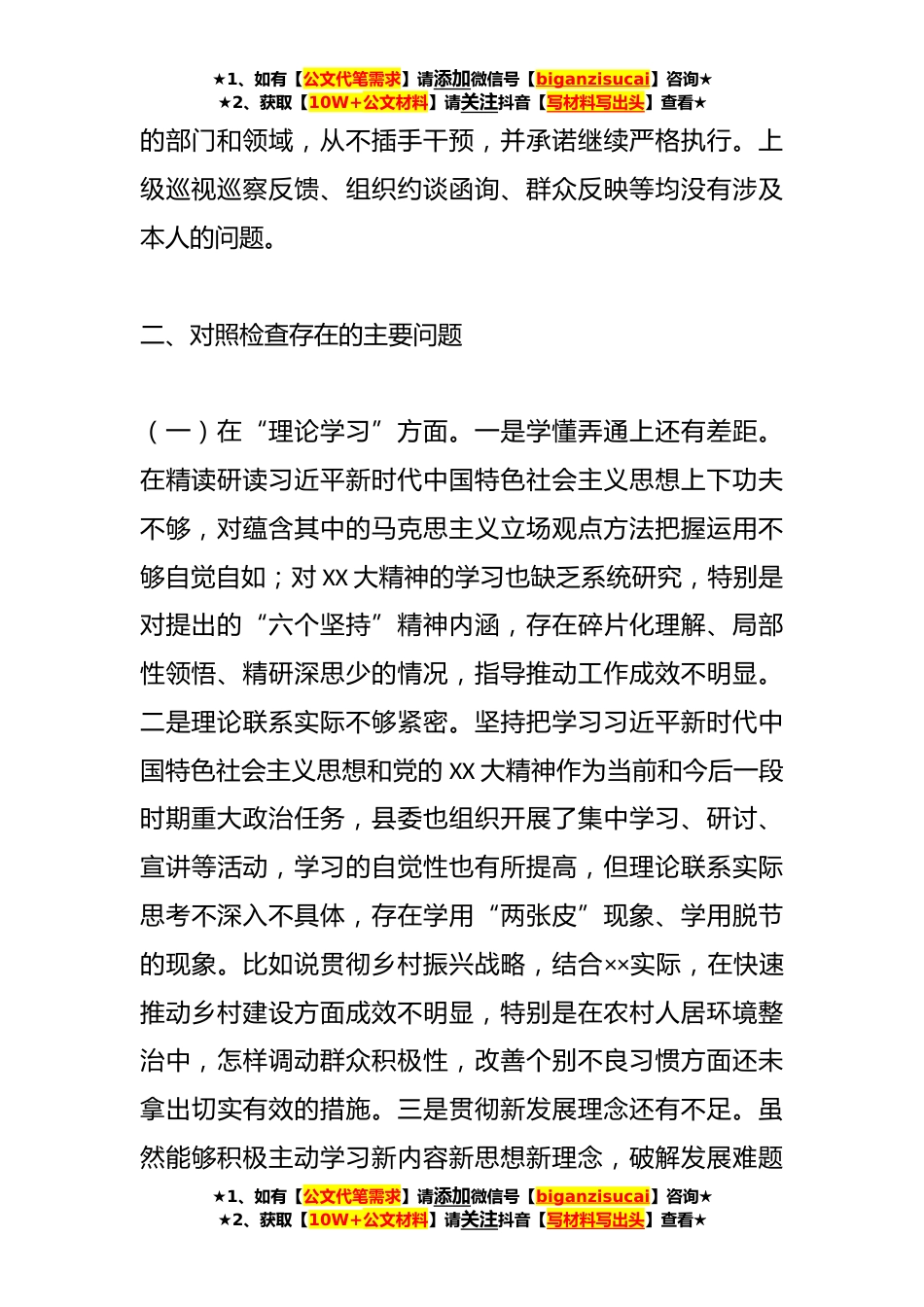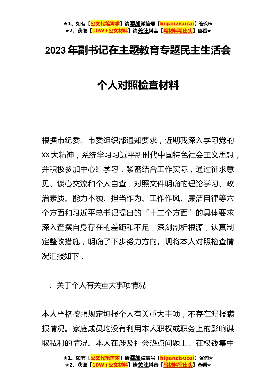 ★1、如有【公文代笔需求】请添加微信号【biganzisucai】咨询★★2、获取【10W+公文材料】请关注抖音【写材料写出头】查看★2023年副书记在主题教育专题民主生活会个人对照检查材料根据市纪委、市委组织部通知要求,近期我深入学习党的XX大精神,系统学习习近平新时代中国特色社会主义思想,并积极参加中心组学习,紧密结合工作实际,通过征求意见、谈心交流和个人自查,对照文件明确的理论学习、政治素质、能力本领、担当作为、工作作风、廉洁自律等六个方面和习近平总书记提出的“十二个方面”的具体要求深入查摆自身存在的差距和不足,深刻剖析根源,认真制定整改措施,明确了下步努力方向。现将本人对照检查情况汇报如下:一、关于个人有关重大事项情况本人严格按照规定填报个人有关重大事项,不存在漏报瞒报...