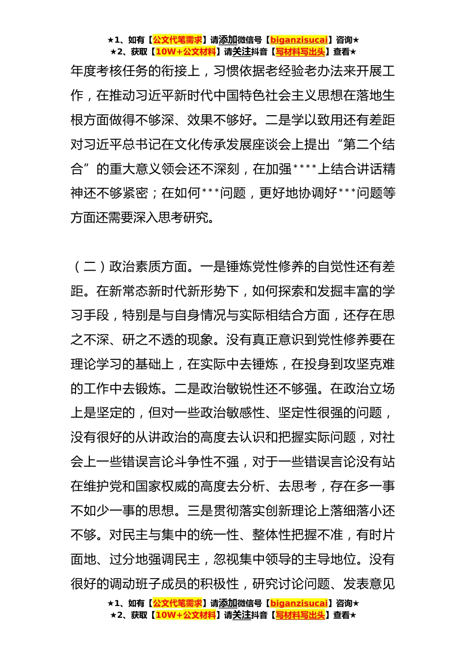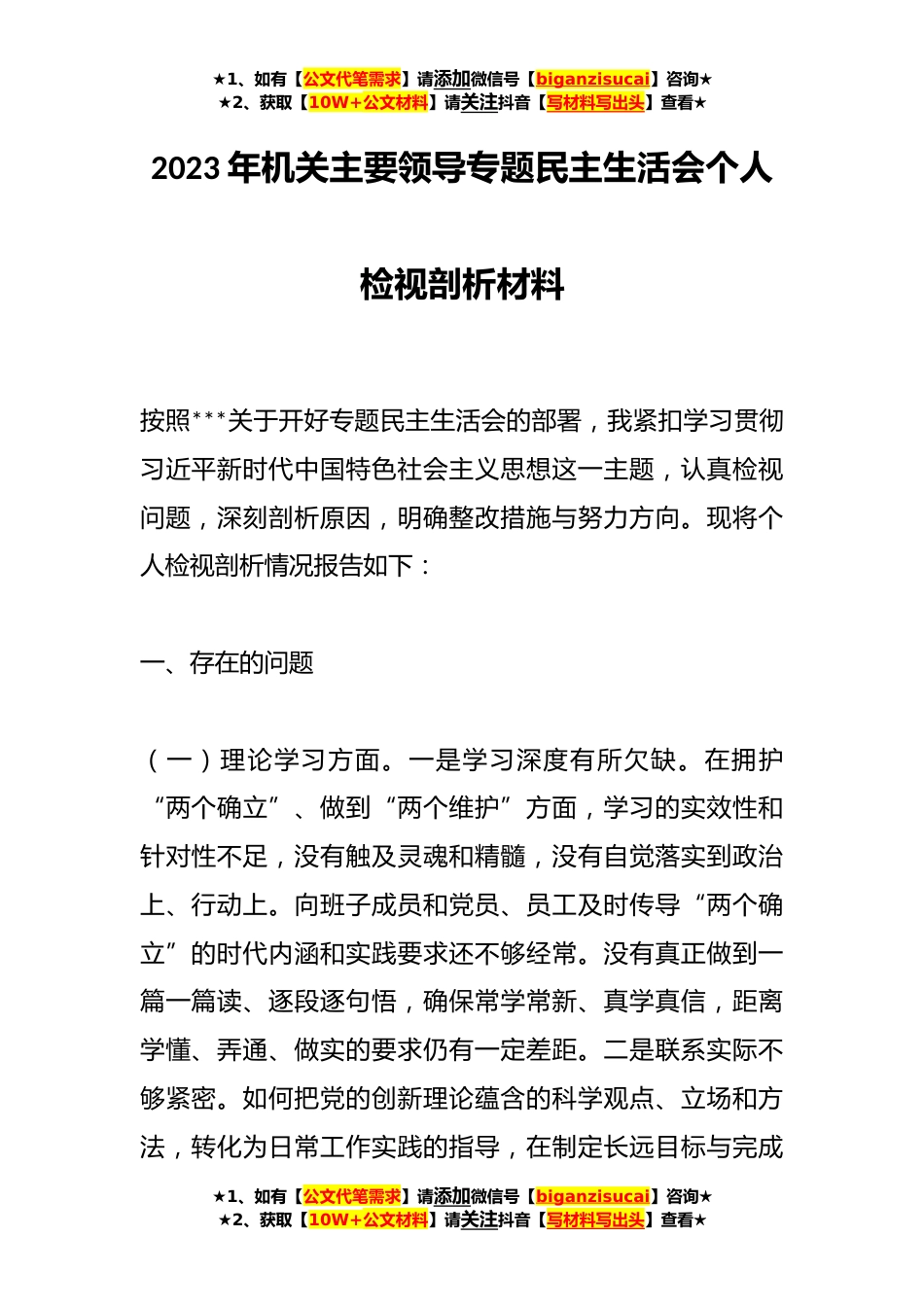 ★1、如有【公文代笔需求】请添加微信号【biganzisucai】咨询★★2、获取【10W+公文材料】请关注抖音【写材料写出头】查看★2023年机关主要领导专题民主生活会个人检视剖析材料按照***关于开好专题民主生活会的部署,我紧扣学习贯彻习近平新时代中国特色社会主义思想这一主题,认真检视问题,深刻剖析原因,明确整改措施与努力方向。现将个人检视剖析情况报告如下:一、存在的问题(一)理论学习方面。一是学习深度有所欠缺。在拥护“两个确立”、做到“两个维护”方面,学习的实效性和针对性不足,没有触及灵魂和精髓,没有自觉落实到政治上、行动上。向班子成员和党员、员工及时传导“两个确立”的时代内涵和实践要求还不够经常。没有真正做到一篇一篇读、逐段逐句悟,确保常学常新、真学真信,距离学懂、弄通、...