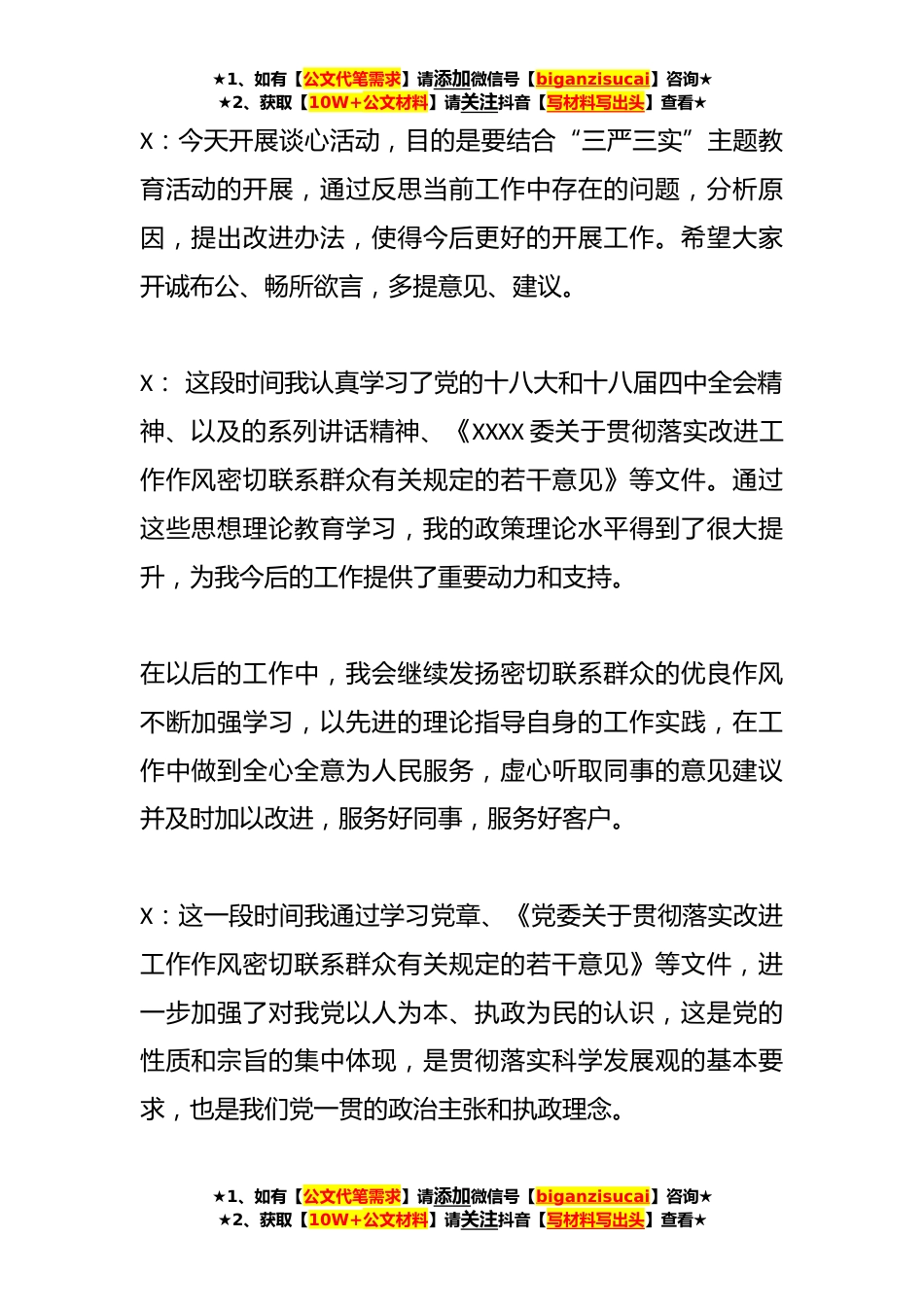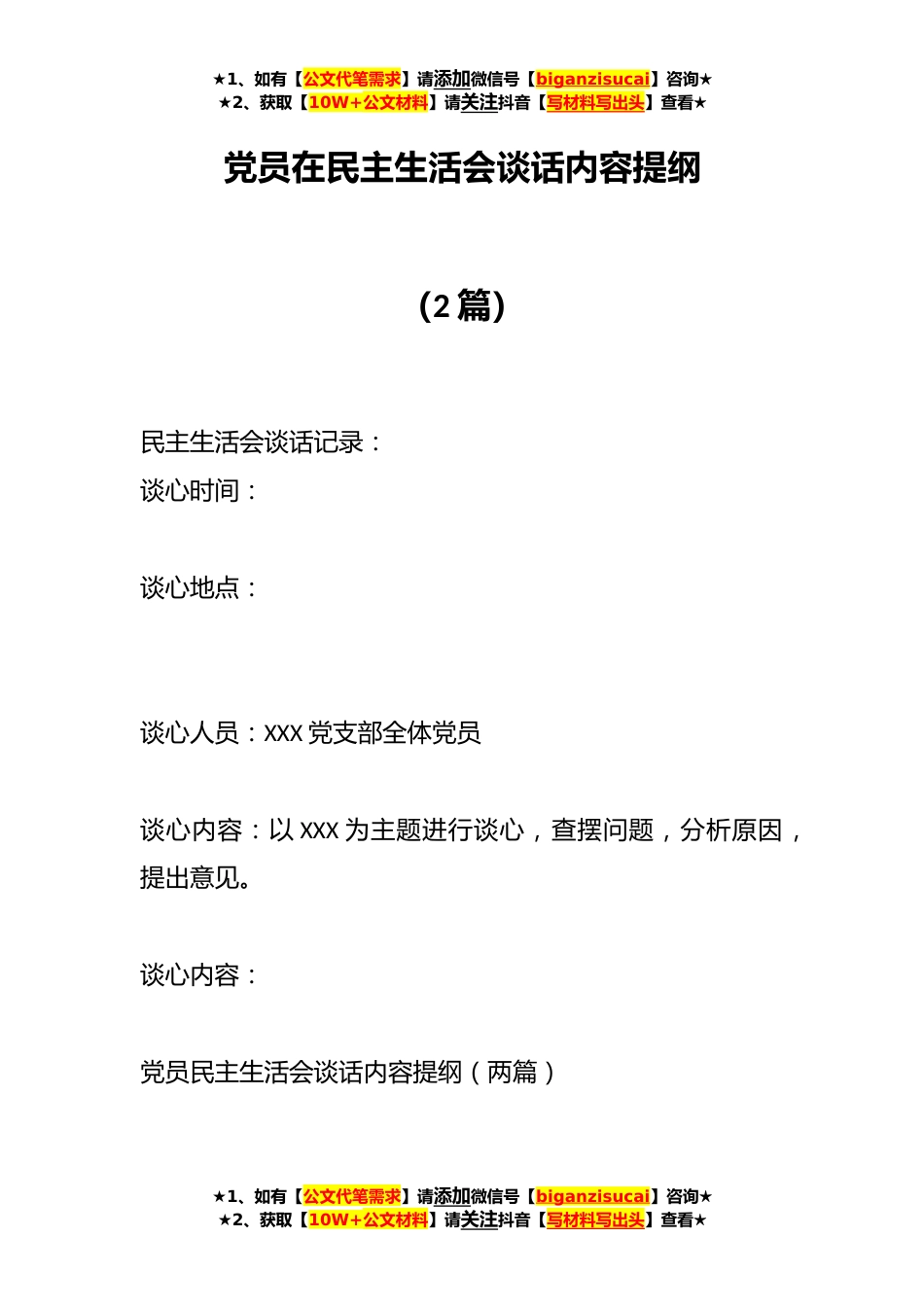 ★1、如有【公文代笔需求】请添加微信号【biganzisucai】咨询★★2、获取【10W+公文材料】请关注抖音【写材料写出头】查看★党员在民主生活会谈话内容提纲(2篇)民主生活会谈话记录:谈心时间:谈心地点:谈心人员:XXX党支部全体党员谈心内容:以XXX为主题进行谈心,查摆问题,分析原因,提出意见。谈心内容:党员民主生活会谈话内容提纲(两篇)★1、如有【公文代笔需求】请添加微信号【biganzisucai】咨询★★2、获取【10W+公文材料】请关注抖音【写材料写出头】查看★★1、如有【公文代笔需求】请添加微信号【biganzisucai】咨询★★2、获取【10W+公文材料】请关注抖音【写材料写出头】查看★X:今天开展谈心活动,目的是要结合“三严三实”主题教育活动的开展,通过反思当前工作中存在的问题,分析原因,提...