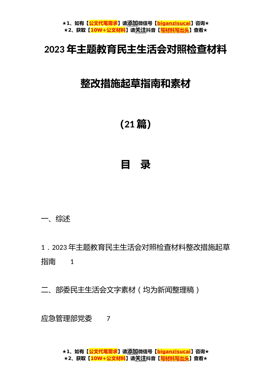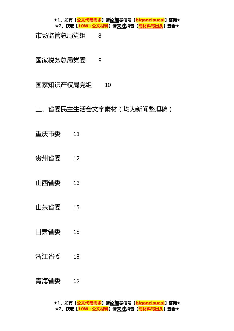 ★1、如有【公文代笔需求】请添加微信号【biganzisucai】咨询★★2、获取【10W+公文材料】请关注抖音【写材料写出头】查看★2023年主题教育民主生活会对照检查材料整改措施起草指南和素材(21篇)目录一、综述1.2023年主题教育民主生活会对照检查材料整改措施起草指南1二、部委民主生活会文字素材(均为新闻整理稿)应急管理部党委7★1、如有【公文代笔需求】请添加微信号【biganzisucai】咨询★★2、获取【10W+公文材料】请关注抖音【写材料写出头】查看★★1、如有【公文代笔需求】请添加微信号【biganzisucai】咨询★★2、获取【10W+公文材料】请关注抖音【写材料写出头】查看★市场监管总局党组8国家税务总局党委9国家知识产权局党组10三、省委民主生活会文字素材(均为新闻整理稿)重庆市委11贵州省委12山西...