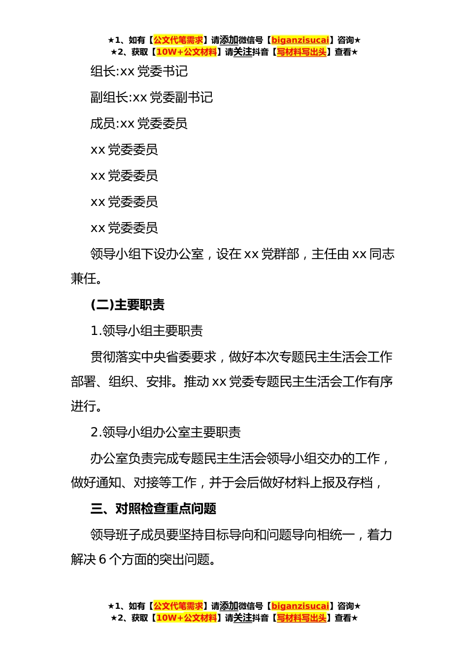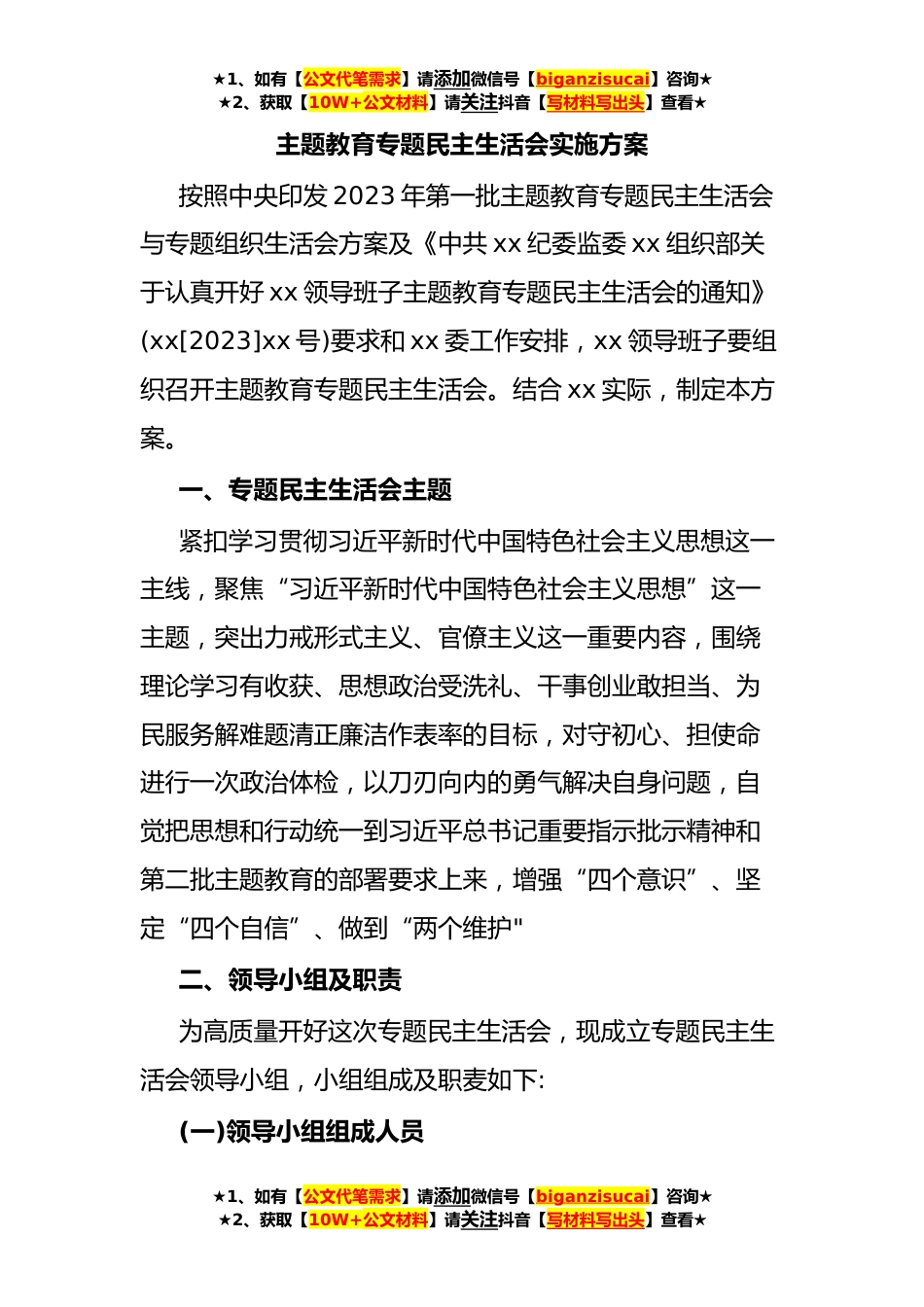 ★1、如有【公文代笔需求】请添加微信号【biganzisucai】咨询★★2、获取【10W+公文材料】请关注抖音【写材料写出头】查看★主题教育专题民主生活会实施方案按照中央印发2023年第一批主题教育专题民主生活会与专题组织生活会方案及《中共xx纪委监委xx组织部关于认真开好xx领导班子主题教育专题民主生活会的通知》(xx[2023]xx号)要求和xx委工作安排,xx领导班子要组织召开主题教育专题民主生活会。结合xx实际,制定本方案。一、专题民主生活会主题紧扣学习贯彻习近平新时代中国特色社会主义思想这一主线,聚焦“习近平新时代中国特色社会主义思想”这一主题,突出力戒形式主义、官僚主义这一重要内容,围绕理论学习有收获、思想政治受洗礼、干事创业敢担当、为民服务解难题清正廉洁作表率的目标,对守初心、担使命...