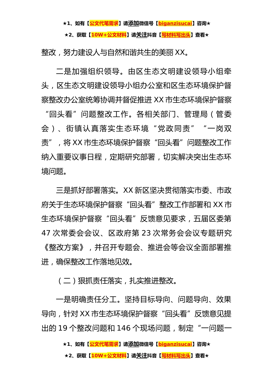 ★1、如有【公文代笔需求】请添加微信号【biganzisucai】咨询★★2、获取【10W+公文材料】请关注抖音【写材料写出头】查看★关于贯彻落实XX市生态环境保护督察“回头看”反馈意见整改情况的报告(4251字)2022年X月19日至28日,XX市第一生态环境保护督察组对XX新区开展了生态环境保护督察“回头看”,于2022年11月25日向XX新区反馈了督察“回头看”意见。XX新区区委、区政府高度重视生态环境保护和督察“回头看”整改工作,制定了《XX新区贯彻落实XX市生态环境保护督察“回头看”反馈意见整改方案》(X〔2023〕X号,以下简称《整改方案》),全力推进整改工作。现将整改情况报告如下:一、整改工作落实总体情况(一)提高政治站位,加强组织领导。一是提高思想认识。XX新区深入学习贯彻习近平生态文明思想,全面贯...