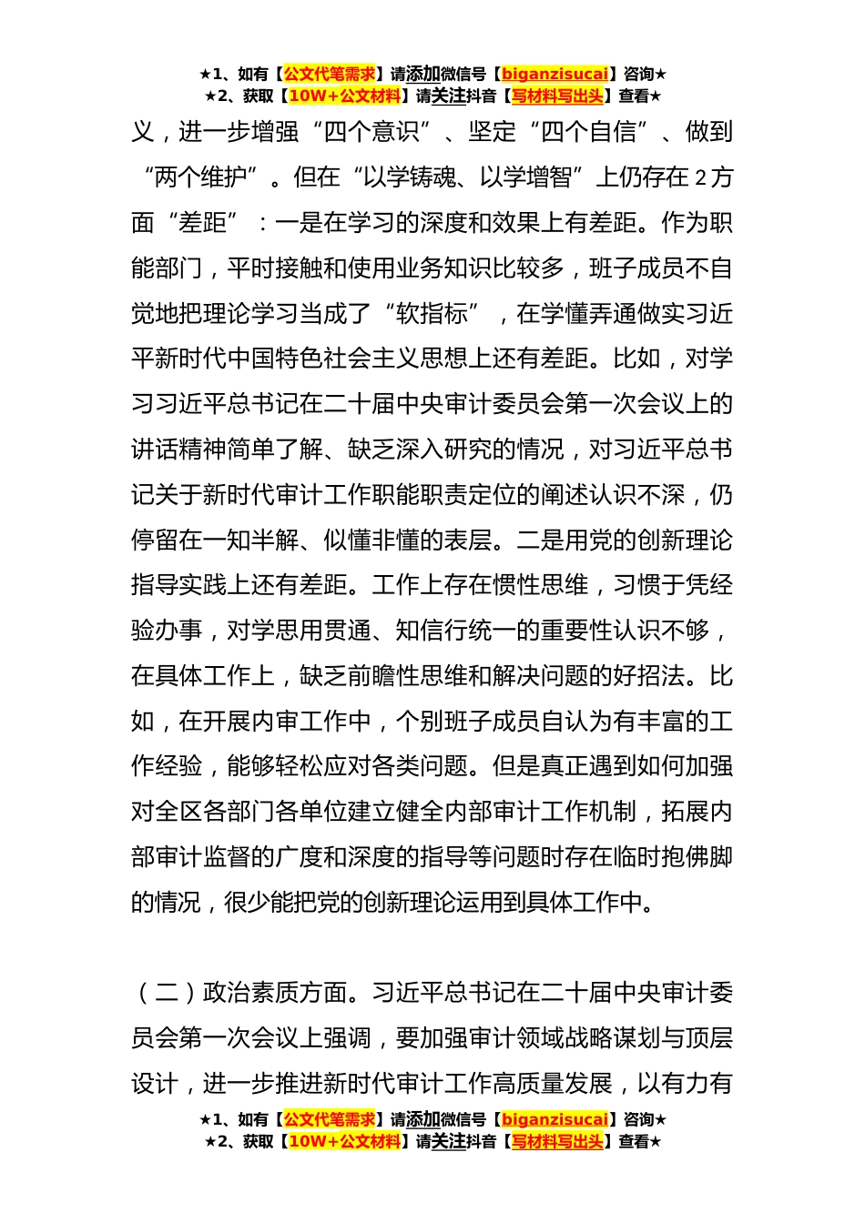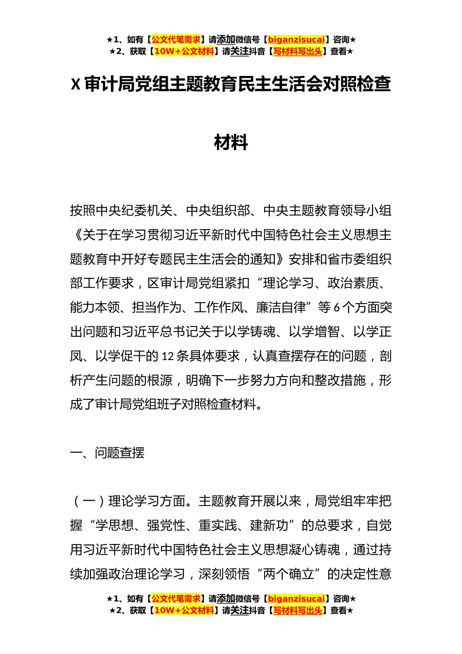 ★1、如有【公文代笔需求】请添加微信号【biganzisucai】咨询★★2、获取【10W+公文材料】请关注抖音【写材料写出头】查看★X审计局党组主题教育民主生活会对照检查材料按照中央纪委机关、中央组织部、中央主题教育领导小组《关于在学习贯彻习近平新时代中国特色社会主义思想主题教育中开好专题民主生活会的通知》安排和省市委组织部工作要求,区审计局党组紧扣“理论学习、政治素质、能力本领、担当作为、工作作风、廉洁自律”等6个方面突出问题和习近平总书记关于以学铸魂、以学增智、以学正凤、以学促干的12条具体要求,认真查摆存在的问题,剖析产生问题的根源,明确下一步努力方向和整改措施,形成了审计局党组班子对照检查材料。一、问题查摆(一)理论学习方面。主题教育开展以来,局党组牢牢把握“学思想...