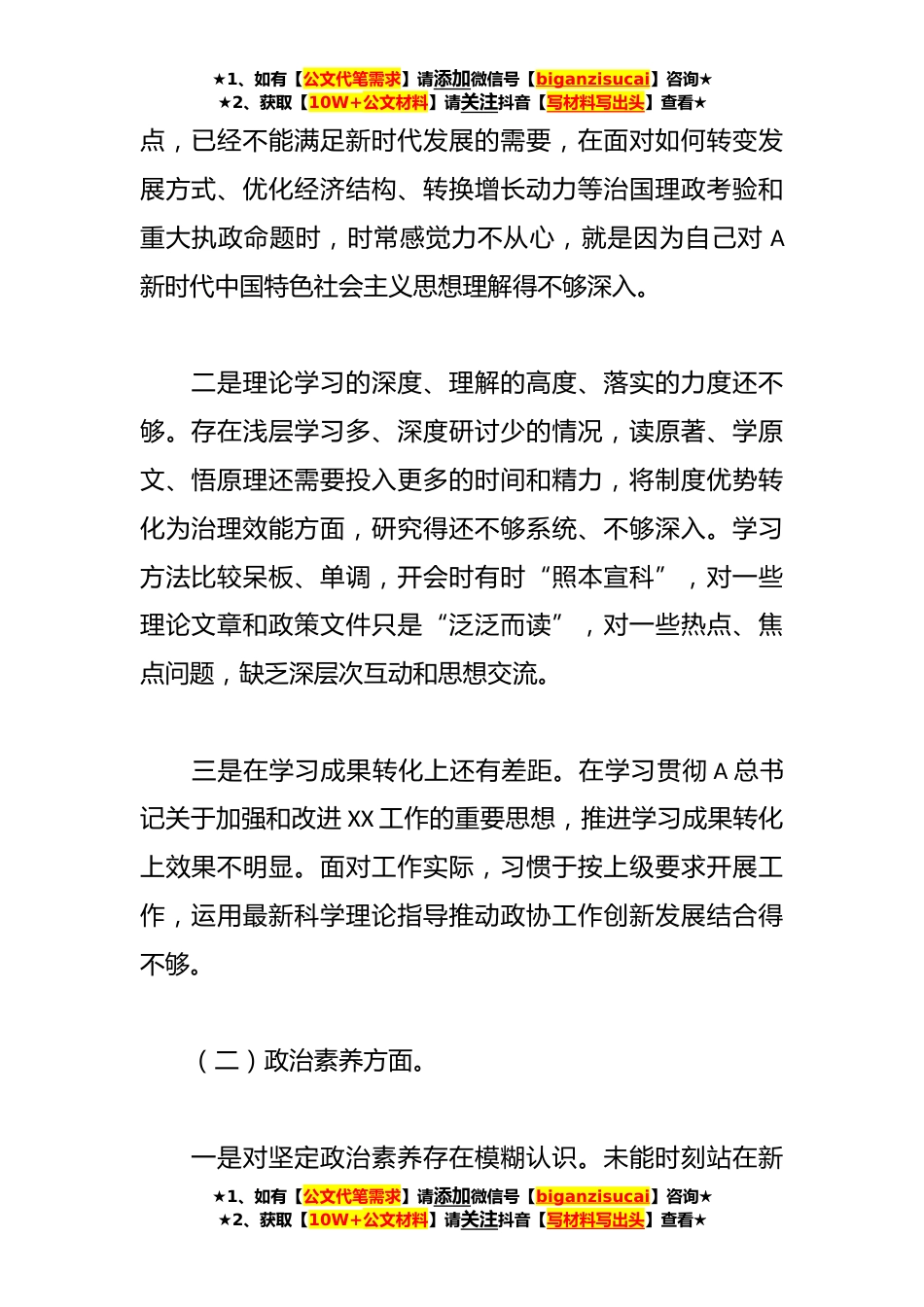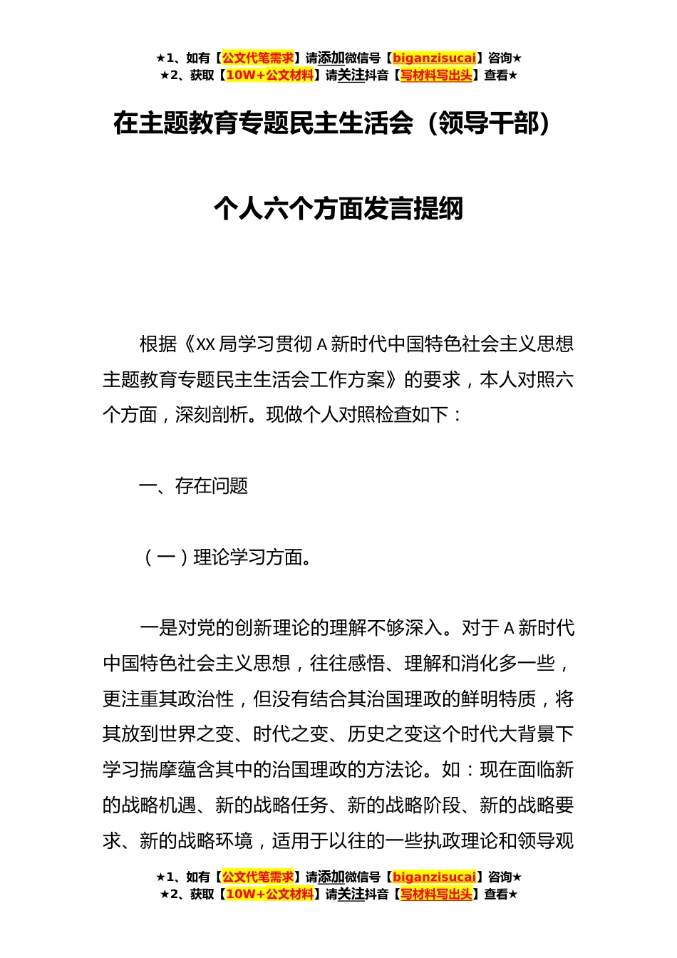 ★1、如有【公文代笔需求】请添加微信号【biganzisucai】咨询★★2、获取【10W+公文材料】请关注抖音【写材料写出头】查看★在主题教育专题民主生活会(领导干部)个人六个方面发言提纲根据《XX局学习贯彻A新时代中国特色社会主义思想主题教育专题民主生活会工作方案》的要求,本人对照六个方面,深刻剖析。现做个人对照检查如下:一、存在问题(一)理论学习方面。一是对党的创新理论的理解不够深入。对于A新时代中国特色社会主义思想,往往感悟、理解和消化多一些,更注重其政治性,但没有结合其治国理政的鲜明特质,将其放到世界之变、时代之变、历史之变这个时代大背景下学习揣摩蕴含其中的治国理政的方法论。如:现在面临新的战略机遇、新的战略任务、新的战略阶段、新的战略要求、新的战略环境,适用于以往...