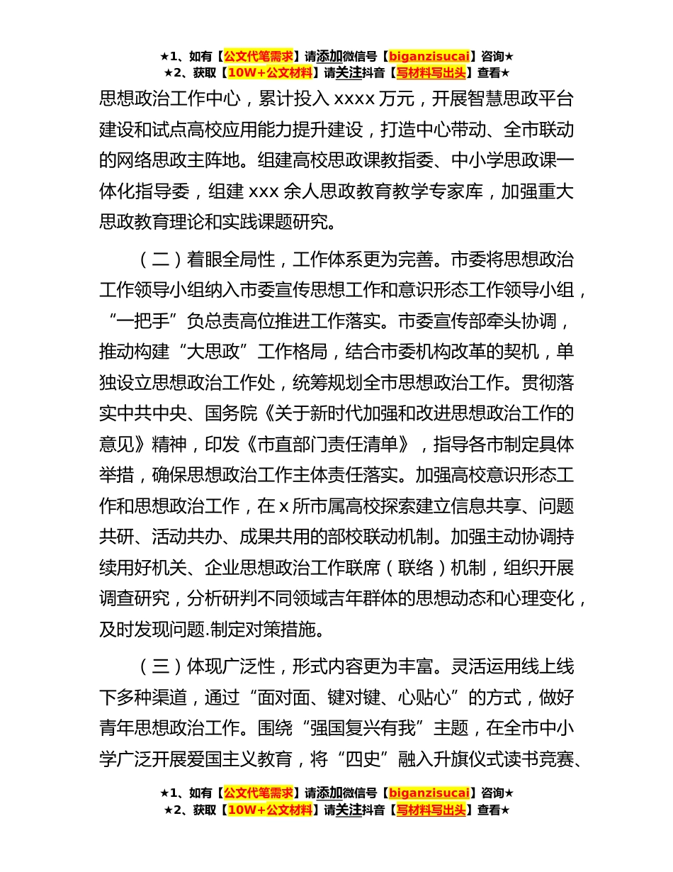 ★1、如有【公文代笔需求】请添加微信号【biganzisucai】咨询★★2、获取【10W+公文材料】请关注抖音【写材料写出头】查看★关于青年思想政治工作开展情况的调研报告党的二十大报告指出,“全党要把青年工作作为战略性工作来抓,用党的科学理论武装青年,用党的初心使命感召青年。”青年工作是党的一项极为重要工作,在新的伟大征程中,必须高度重视青年一代的思想政治教育,完善思想政治工作体系,不断创新内容、形式和载体,教育引导广大青年形成正确的世界观、人生观、价值观,增强中国特色社会主义道路自信、理论自信、制度自信、文化自信,争做德智体美劳全面发展的社会主义建设者和接班人。一、主要经验和做法(一)把握战略性,重要地位更为凸显。市委高度重视青年工作,与时俱进研究青年成长规律和时代特...