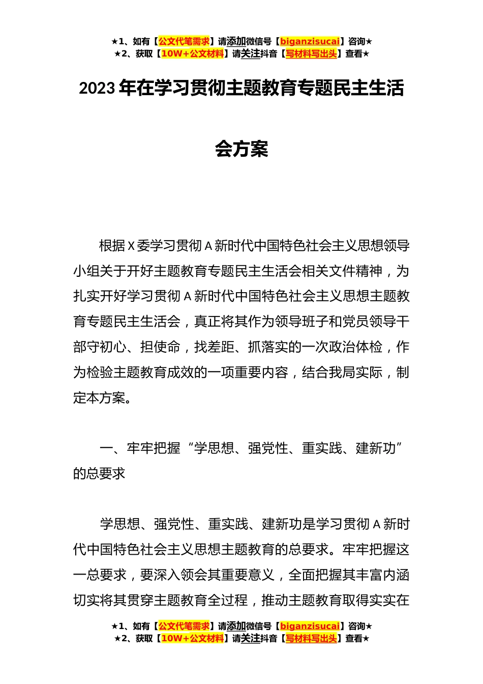 ★1、如有【公文代笔需求】请添加微信号【biganzisucai】咨询★★2、获取【10W+公文材料】请关注抖音【写材料写出头】查看★2023年在学习贯彻主题教育专题民主生活会方案根据X委学习贯彻A新时代中国特色社会主义思想领导小组关于开好主题教育专题民主生活会相关文件精神,为扎实开好学习贯彻A新时代中国特色社会主义思想主题教育专题民主生活会,真正将其作为领导班子和党员领导干部守初心、担使命,找差距、抓落实的一次政治体检,作为检验主题教育成效的一项重要内容,结合我局实际,制定本方案。一、牢牢把握“学思想、强党性、重实践、建新功”的总要求学思想、强党性、重实践、建新功是学习贯彻A新时代中国特色社会主义思想主题教育的总要求。牢牢把握这一总要求,要深入领会其重要意义,全面把握其丰富内涵...
