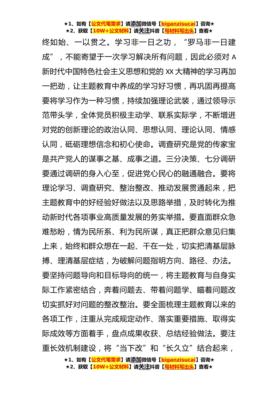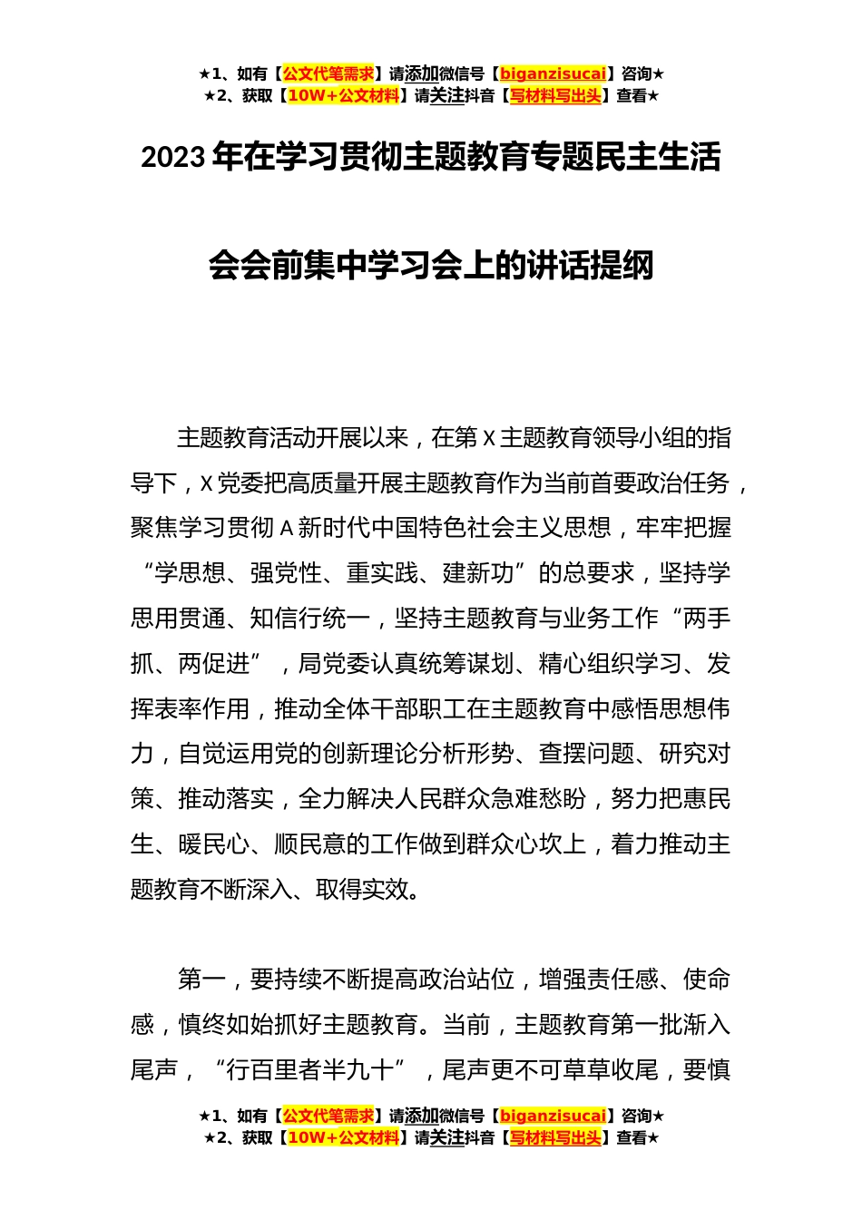 ★1、如有【公文代笔需求】请添加微信号【biganzisucai】咨询★★2、获取【10W+公文材料】请关注抖音【写材料写出头】查看★2023年在学习贯彻主题教育专题民主生活会会前集中学习会上的讲话提纲主题教育活动开展以来,在第X主题教育领导小组的指导下,X党委把高质量开展主题教育作为当前首要政治任务,聚焦学习贯彻A新时代中国特色社会主义思想,牢牢把握“学思想、强党性、重实践、建新功”的总要求,坚持学思用贯通、知信行统一,坚持主题教育与业务工作“两手抓、两促进”,局党委认真统筹谋划、精心组织学习、发挥表率作用,推动全体干部职工在主题教育中感悟思想伟力,自觉运用党的创新理论分析形势、查摆问题、研究对策、推动落实,全力解决人民群众急难愁盼,努力把惠民生、暖民心、顺民意的工作做到群众心...