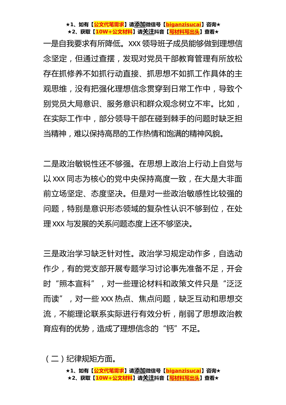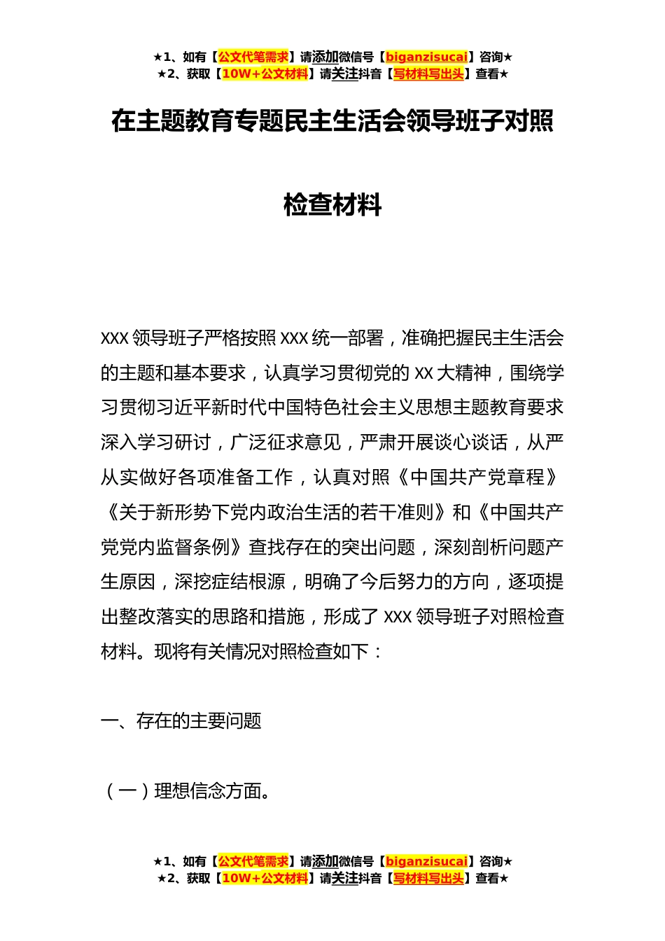 ★1、如有【公文代笔需求】请添加微信号【biganzisucai】咨询★★2、获取【10W+公文材料】请关注抖音【写材料写出头】查看★在主题教育专题民主生活会领导班子对照检查材料XXX领导班子严格按照XXX统一部署,准确把握民主生活会的主题和基本要求,认真学习贯彻党的XX大精神,围绕学习贯彻习近平新时代中国特色社会主义思想主题教育要求深入学习研讨,广泛征求意见,严肃开展谈心谈话,从严从实做好各项准备工作,认真对照《中国共产党章程》《关于新形势下党内政治生活的若干准则》和《中国共产党党内监督条例》查找存在的突出问题,深刻剖析问题产生原因,深挖症结根源,明确了今后努力的方向,逐项提出整改落实的思路和措施,形成了XXX领导班子对照检查材料。现将有关情况对照检查如下:一、存在的主要问题(一)...