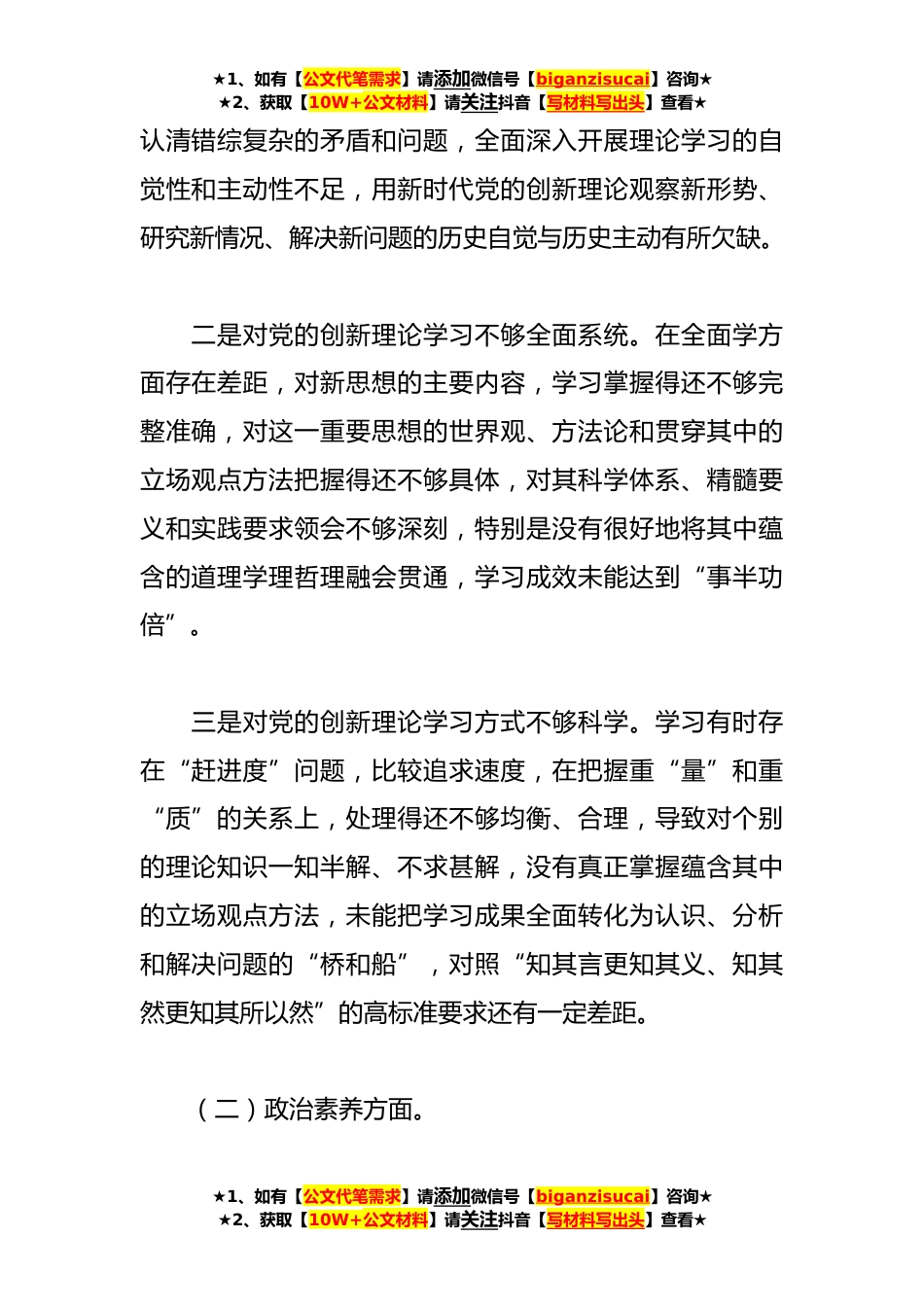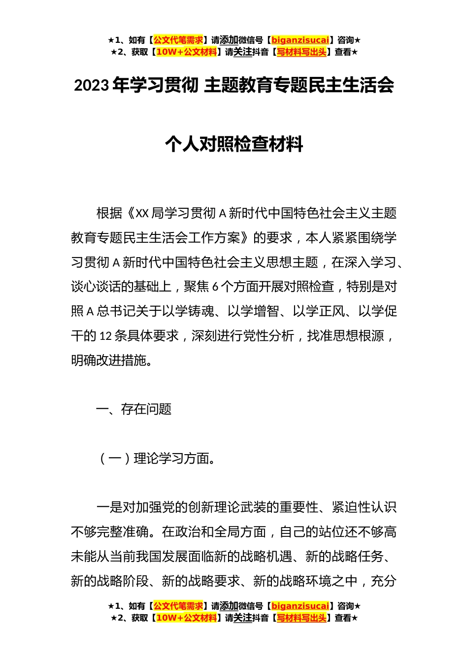 ★1、如有【公文代笔需求】请添加微信号【biganzisucai】咨询★★2、获取【10W+公文材料】请关注抖音【写材料写出头】查看★2023年学习贯彻主题教育专题民主生活会个人对照检查材料根据《XX局学习贯彻A新时代中国特色社会主义主题教育专题民主生活会工作方案》的要求,本人紧紧围绕学习贯彻A新时代中国特色社会主义思想主题,在深入学习、谈心谈话的基础上,聚焦6个方面开展对照检查,特别是对照A总书记关于以学铸魂、以学增智、以学正风、以学促干的12条具体要求,深刻进行党性分析,找准思想根源,明确改进措施。一、存在问题(一)理论学习方面。一是对加强党的创新理论武装的重要性、紧迫性认识不够完整准确。在政治和全局方面,自己的站位还不够高未能从当前我国发展面临新的战略机遇、新的战略任务、新的战...