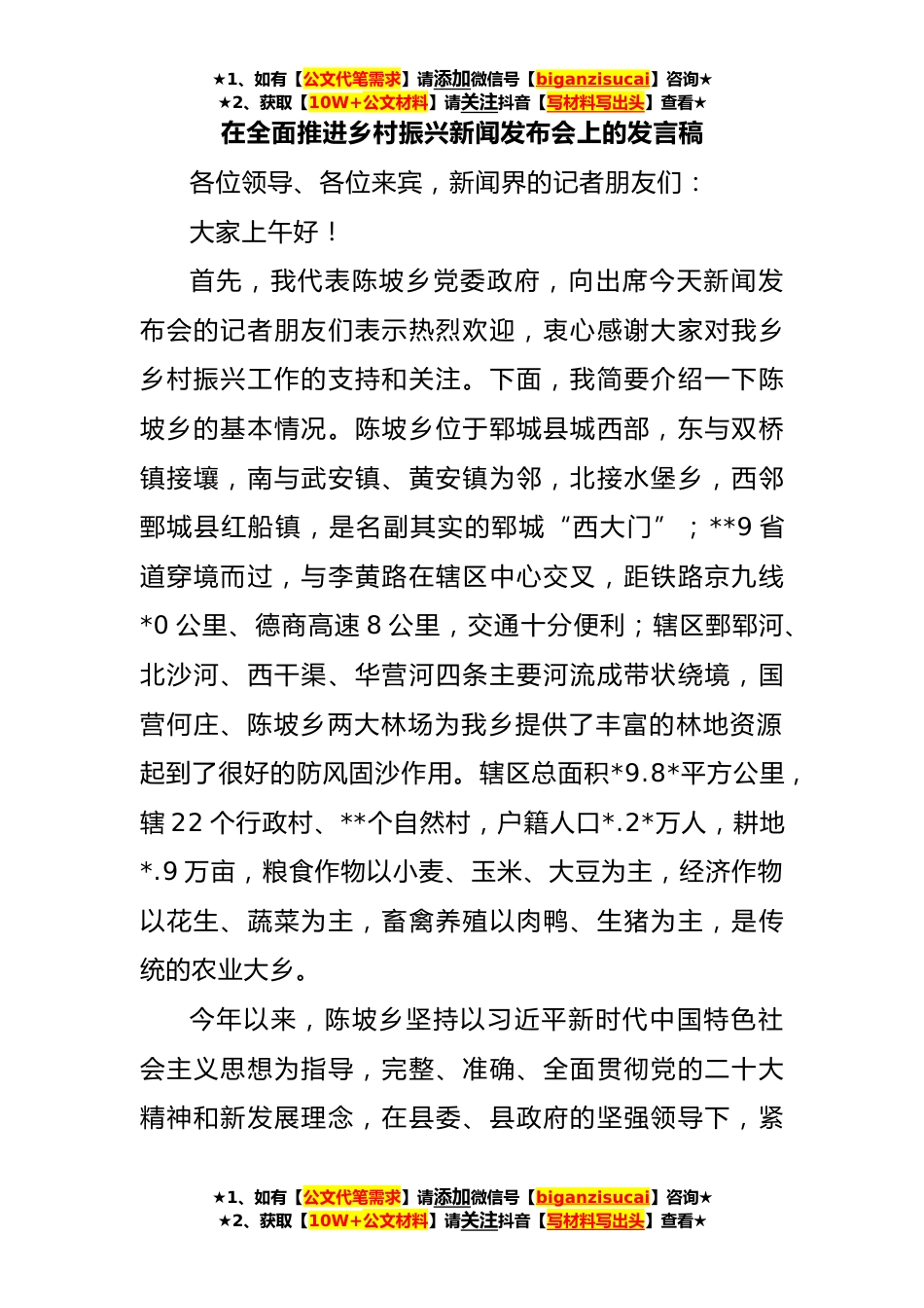 ★1、如有【公文代笔需求】请添加微信号【biganzisucai】咨询★★2、获取【10W+公文材料】请关注抖音【写材料写出头】查看★在全面推进乡村振兴新闻发布会上的发言稿各位领导、各位来宾,新闻界的记者朋友们:大家上午好!首先,我代表陈坡乡党委政府,向出席今天新闻发布会的记者朋友们表示热烈欢迎,衷心感谢大家对我乡乡村振兴工作的支持和关注。下面,我简要介绍一下陈坡乡的基本情况。陈坡乡位于郓城县城西部,东与双桥镇接壤,南与武安镇、黄安镇为邻,北接水堡乡,西邻鄄城县红船镇,是名副其实的郓城“西大门”;**9省道穿境而过,与李黄路在辖区中心交叉,距铁路京九线*0公里、德商高速8公里,交通十分便利;辖区鄄郓河、北沙河、西干渠、华营河四条主要河流成带状绕境,国营何庄、陈坡乡两大林场为我乡...