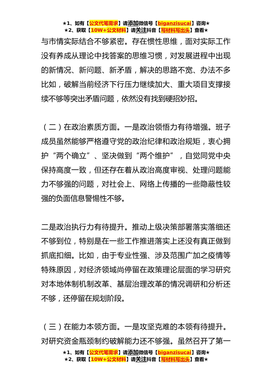 ★1、如有【公文代笔需求】请添加微信号【biganzisucai】咨询★★2、获取【10W+公文材料】请关注抖音【写材料写出头】查看★关于学习贯彻2023年的主题教育专题民主生活会班子对照检查材料本次民主生活会前,XX室班子严格按照《民主生活会方案》要求,紧扣会议主题,认真组织学习研讨、深入开展谈心谈话,对照六方面问题广泛征求意见建议、深刻查摆问题、深挖症结根源,明确了今后的努力方向和整改措施一、存在的主要问题(一)在理论学习方面。一是理论学习少态度。政治理论学习缺乏深度。虽然在学习方面有制度、有要求、有计划但政治理论和业务学习时间上难以保证,在学习计划上难以落实。班子成员平时在具体工作上安排的多,而在学习上的自觉性、积极性和主动性不足,存在实用主义,与工作关系密切的多学,与工...